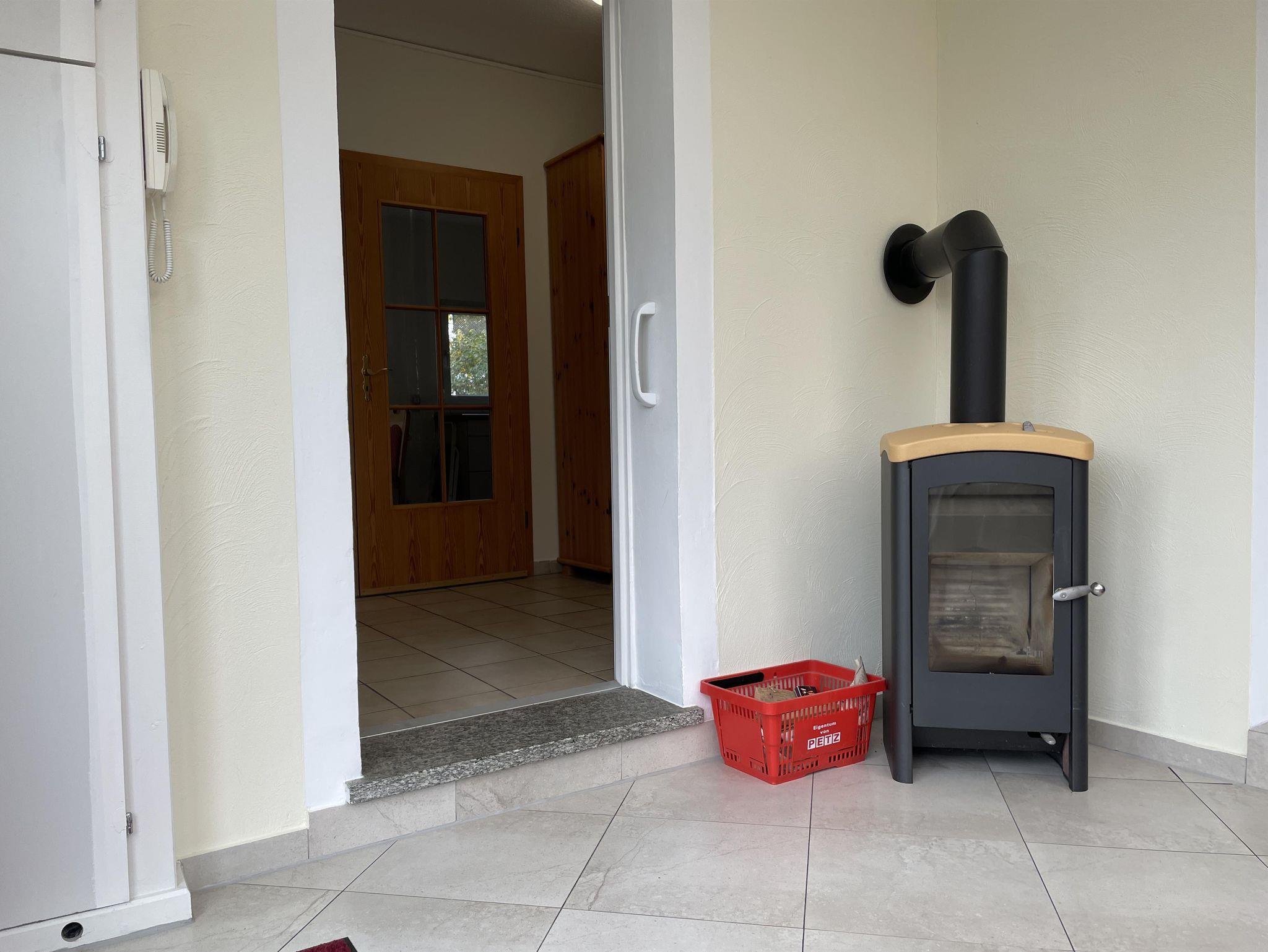 Der Eingangsbereich im Wintergarten ist über eine charmante Treppe erreichbar und lädt mit einem gemütlichen Kaminofen und einer Sitzgruppe dazu ein, sowohl im Sommer als auch im Winter entspannte Stunden zu verbringen.