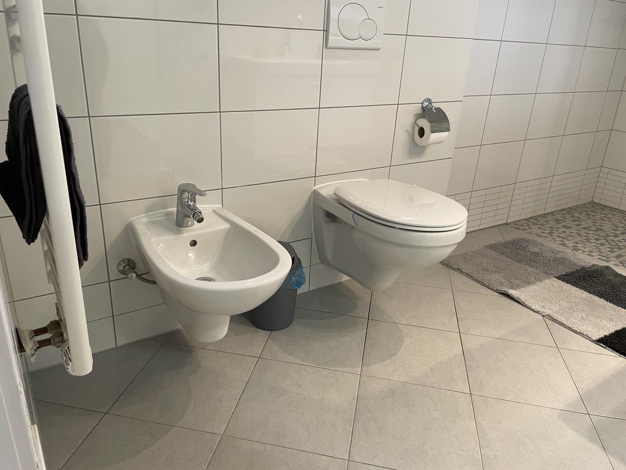 Vom Essbereich aus führt ein separater Flur in das frisch sanierte Badezimmer mit einer ebenerdigen Dusche, einem WC, einem Bidet und einem großen Waschbecken. Dank des Fensters im Badezimmer ist immer ausreichend frische Luft vorhanden.