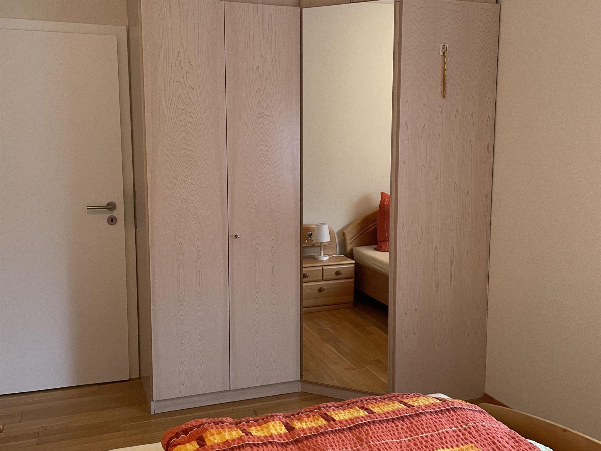 Vom Esszimmer aus gelangen Sie zu den Schlafzimmern. Das Doppelzimmer verfügt über ein komfortables 1,80 m Doppelbett und einen geräumigen Kleiderschrank. Auf der rechten Seite befindet sich das Kinderzimmer mit einem 90 cm Bett, das zu einem zweiten Schlafplatz ausgezogen werden kann. Hier gibt es auch einen kleineren Kleiderschrank. Bei Bedarf stellen wir Ihnen gerne ein Babyreisebett zur Verfügung.