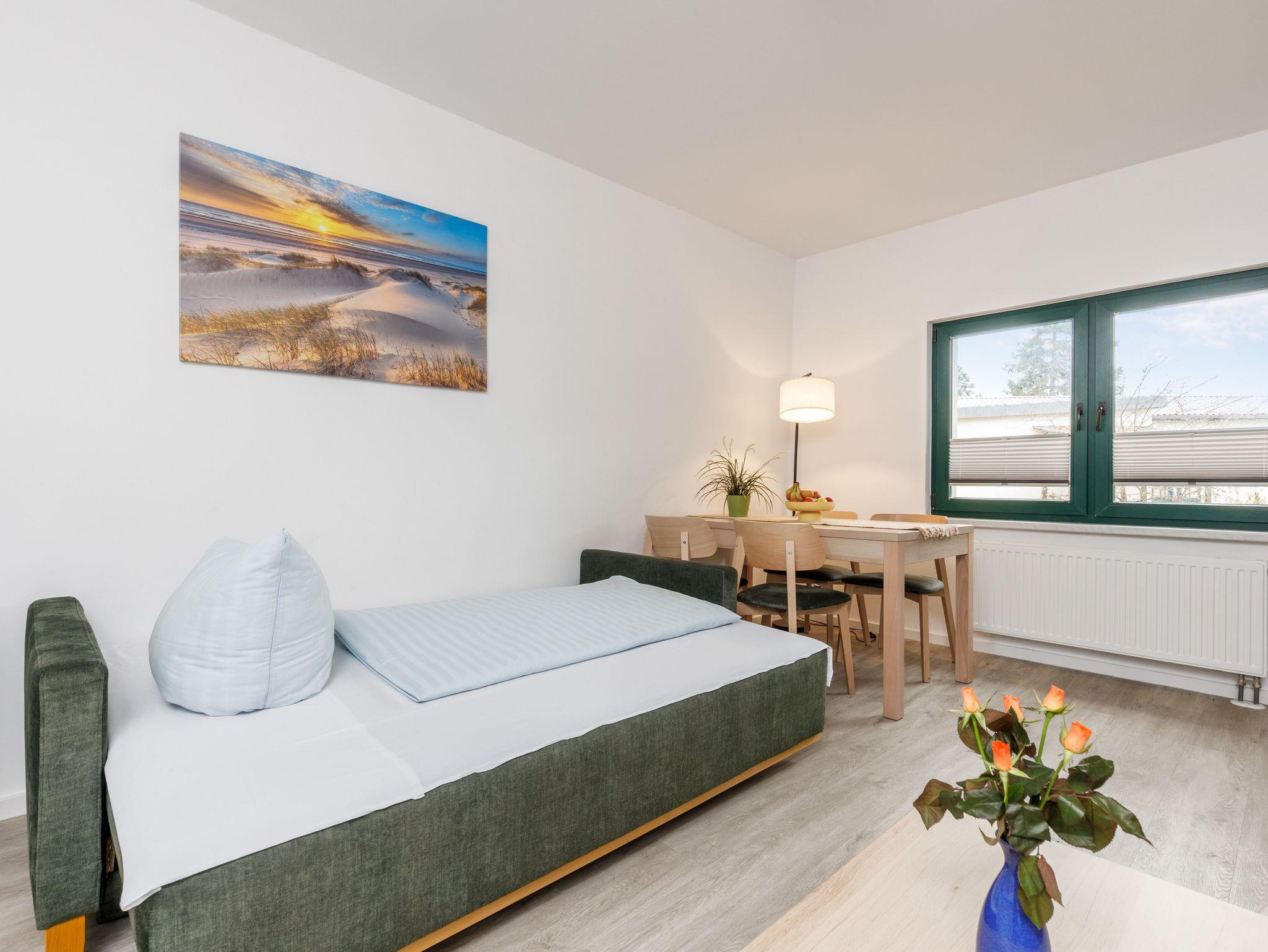 Das Apartment verfügt über ein Schlafzimmer mit Doppelbett sowie einen Wohnbereich mit Schlafsofa und eignet sich ideal für Paare oder kleine Familien.