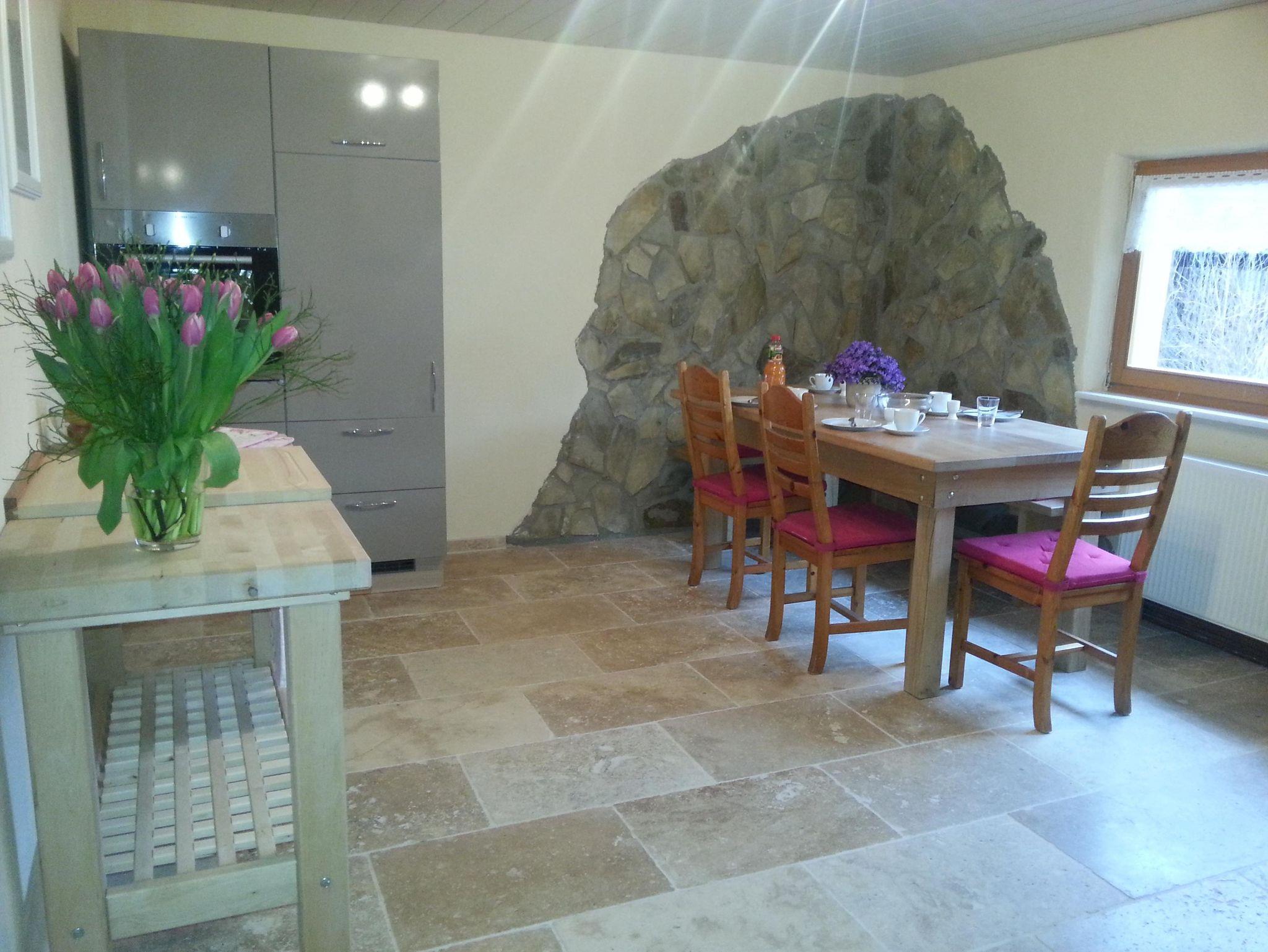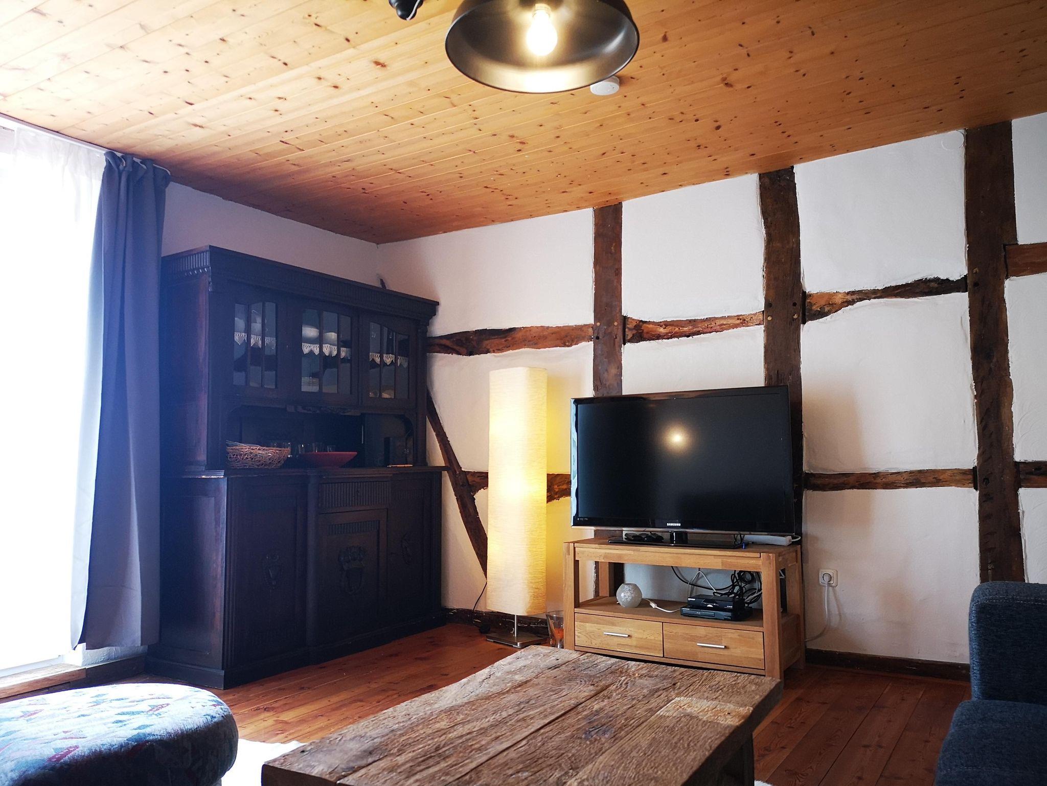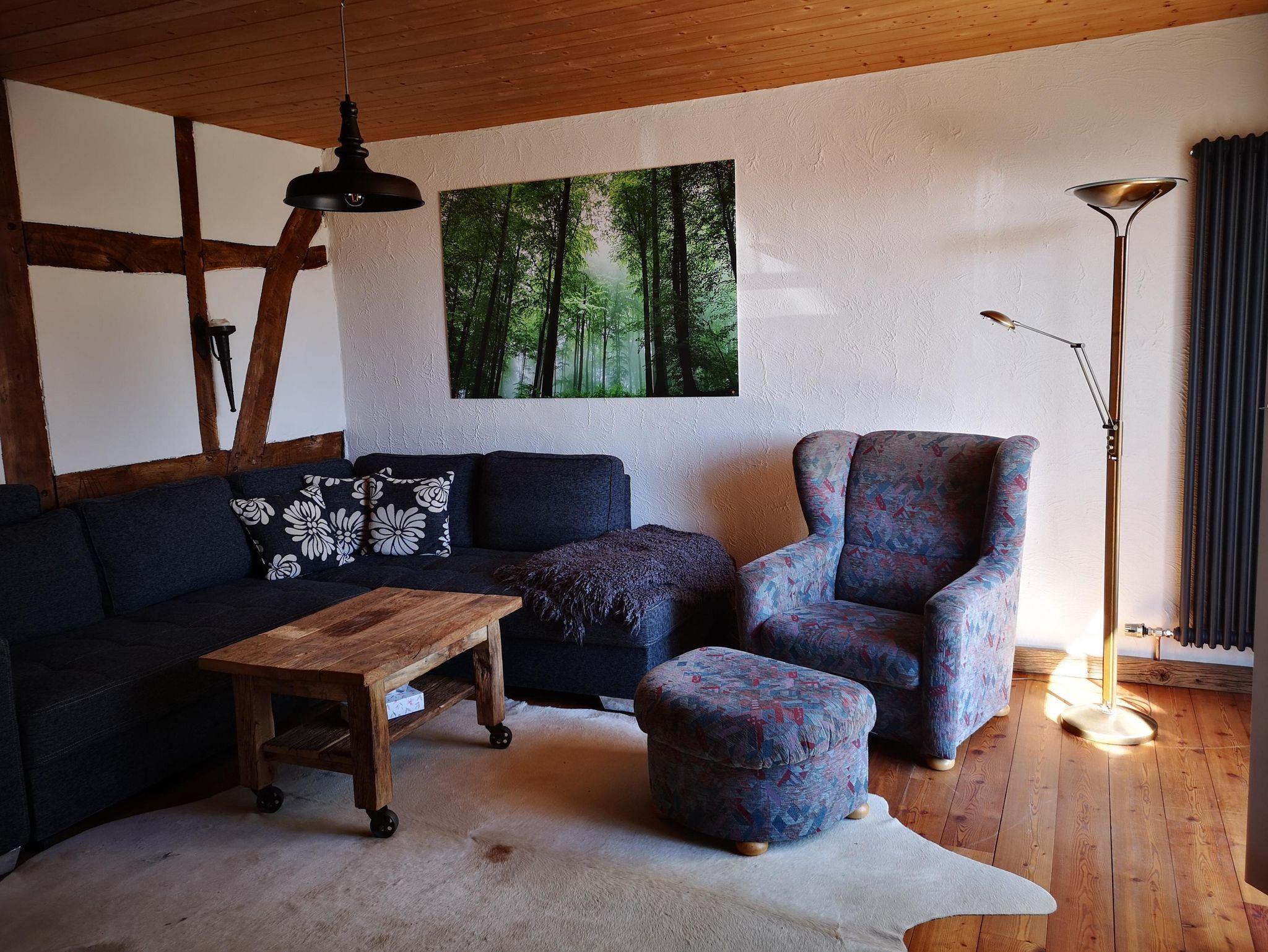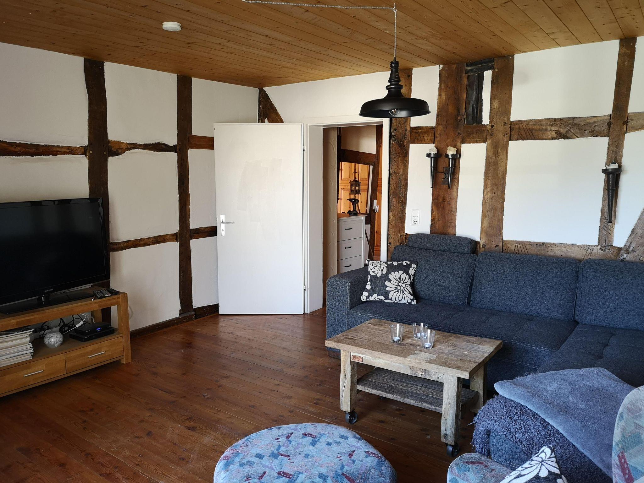 Die Wohnung verfügt über eine aus massivem Eichenholz angefertigte Außentreppe und ist von der Gartenseite aus zu erreichen. Im ersten Obergeschoss gelangt man hier durch eine eigene, separate Haustüre im Landhausstil in den Flur der Ferienwohnung. In der Wohnung erwartet einen eine gelungene Mischung aus Antike und Moderne: Betreten Sie das 20 qm große Wohnzimmer, dessen Boden mit massiven Lärchenholzdielen belegt ist und dessen Wände teils aus uraltem Fachwerk, teils aus rustikalem Putz in mediterranen Farben bestehen. Hier können Sie es sich nach einer langen Wanderung auf der riesigen, gemütlichen Wohnlandschaft bequem machen, die ausreichend Platz für die ganze Familie bietet. Lassen Sie den Tag bei einem Glas Wein noch einmal Revue passieren oder relaxen Sie ganz einfach vor dem großen Flachbild TV mit SAT Empfang und DVD Rekorder.