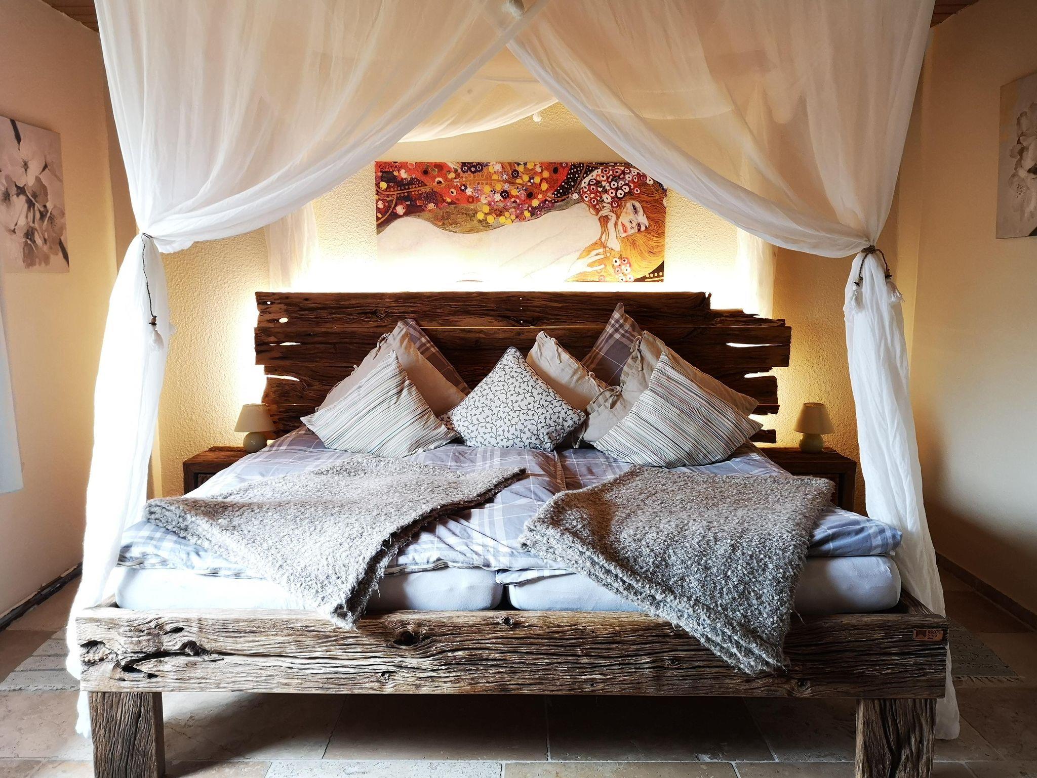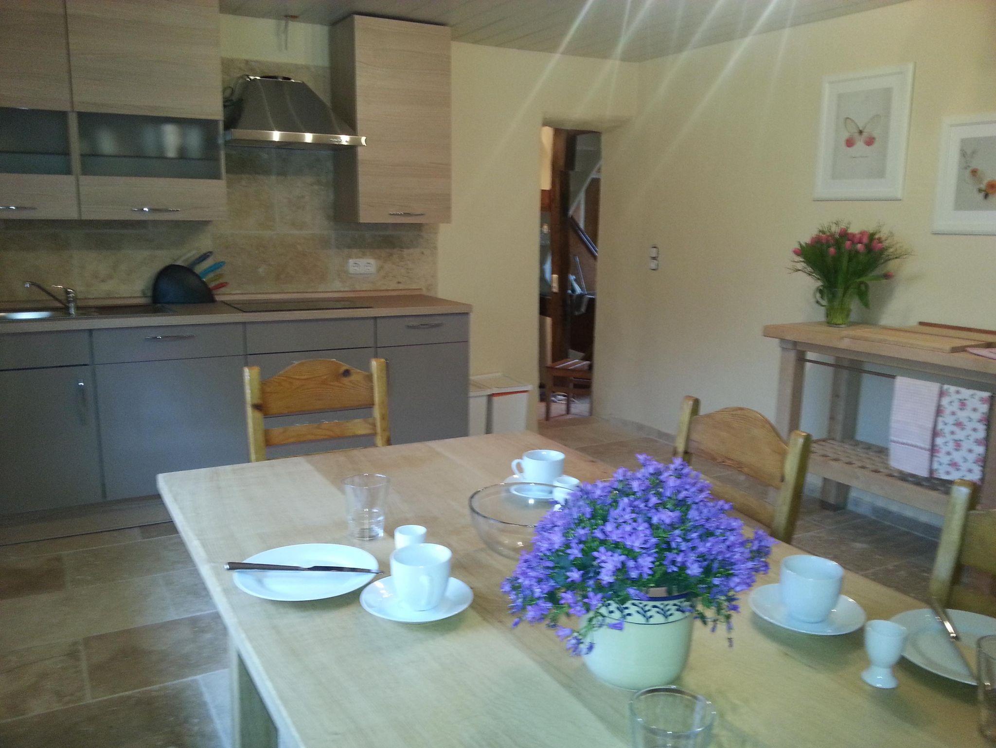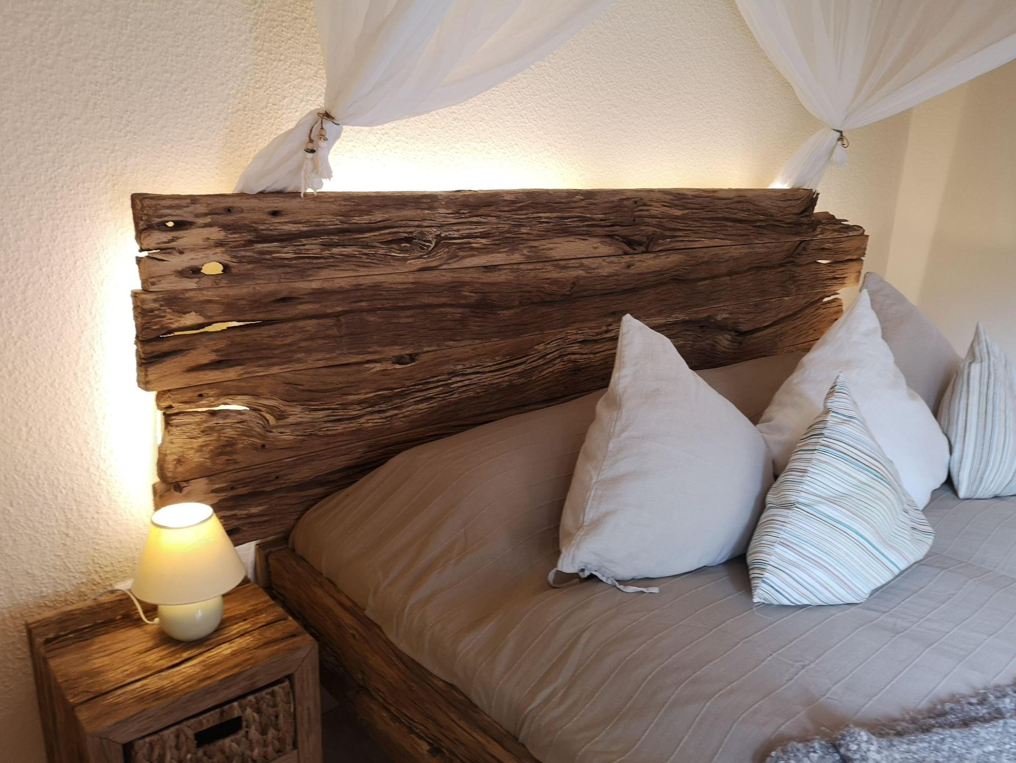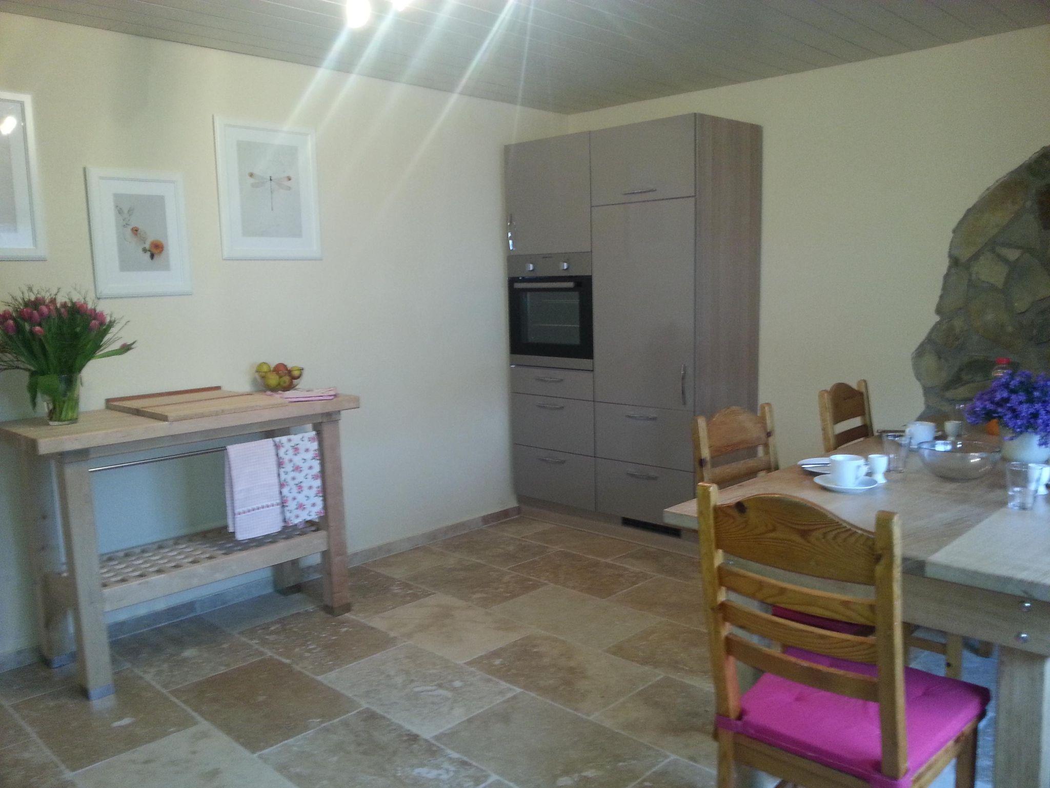 Die Wohnung verfügt über eine aus massivem Eichenholz angefertigte Außentreppe und ist von der Gartenseite aus zu erreichen. Im ersten Obergeschoss gelangt man hier durch eine eigene, separate Haustüre im Landhausstil in den Flur der Ferienwohnung. In der Wohnung erwartet einen eine gelungene Mischung aus Antike und Moderne: Betreten Sie das 20 qm große Wohnzimmer, dessen Boden mit massiven Lärchenholzdielen belegt ist und dessen Wände teils aus uraltem Fachwerk, teils aus rustikalem Putz in mediterranen Farben bestehen. Hier können Sie es sich nach einer langen Wanderung auf der riesigen, gemütlichen Wohnlandschaft bequem machen, die ausreichend Platz für die ganze Familie bietet. Lassen Sie den Tag bei einem Glas Wein noch einmal Revue passieren oder relaxen Sie ganz einfach vor dem großen Flachbild TV mit SAT Empfang und DVD Rekorder.