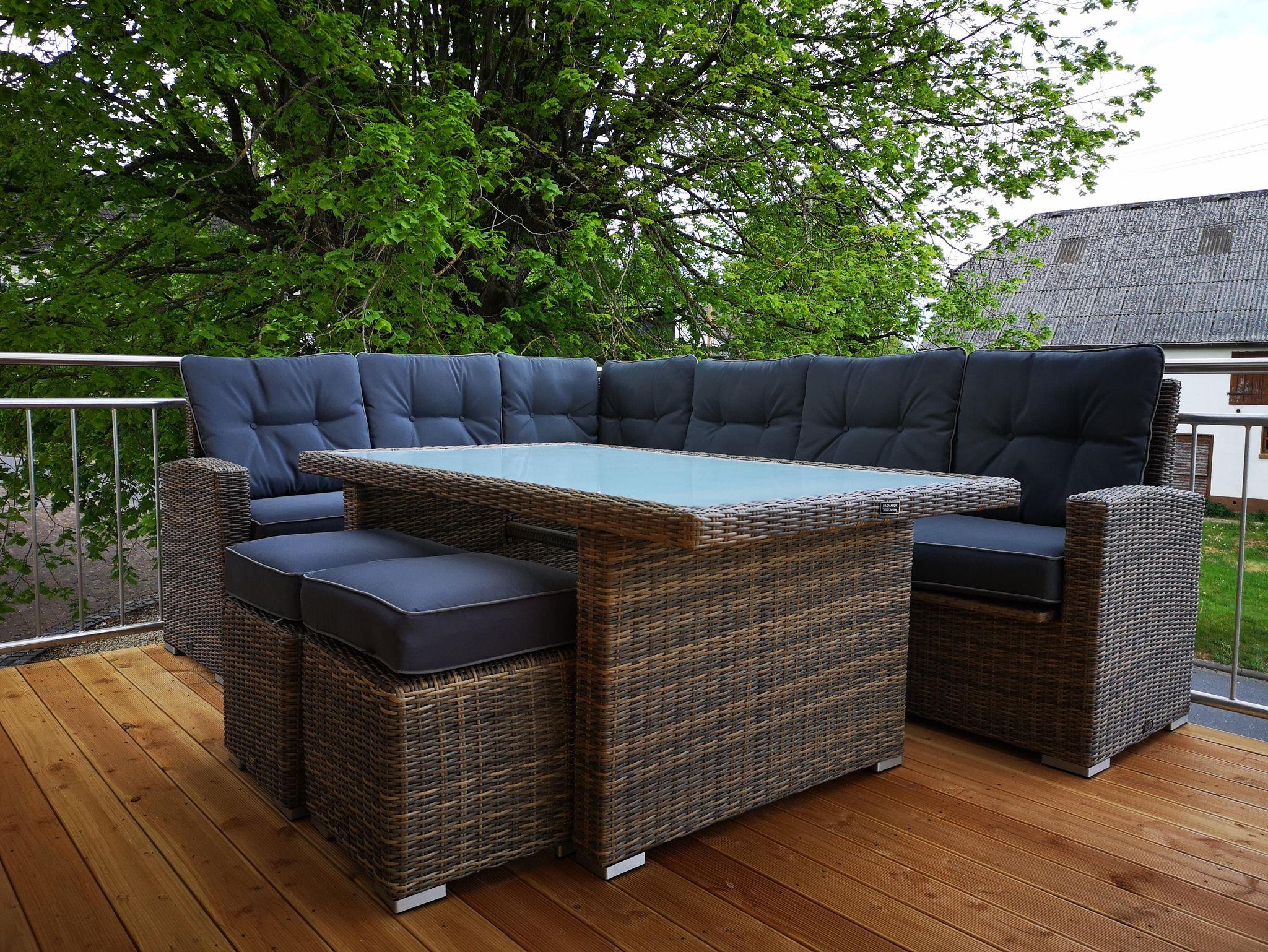 Das Essen können Sie dann am Esstisch, der für 6 Personen Platz bietet, einnehmen. Wahlweise können Sie natürlich auch den großen Balkon nutzen, auf dem eine bequeme Lounge allen Gästen ausreichend Platz an dem dazugehörigen Esstisch bietet.