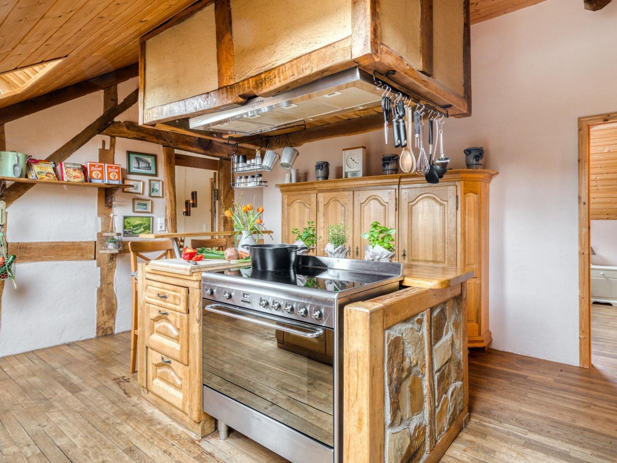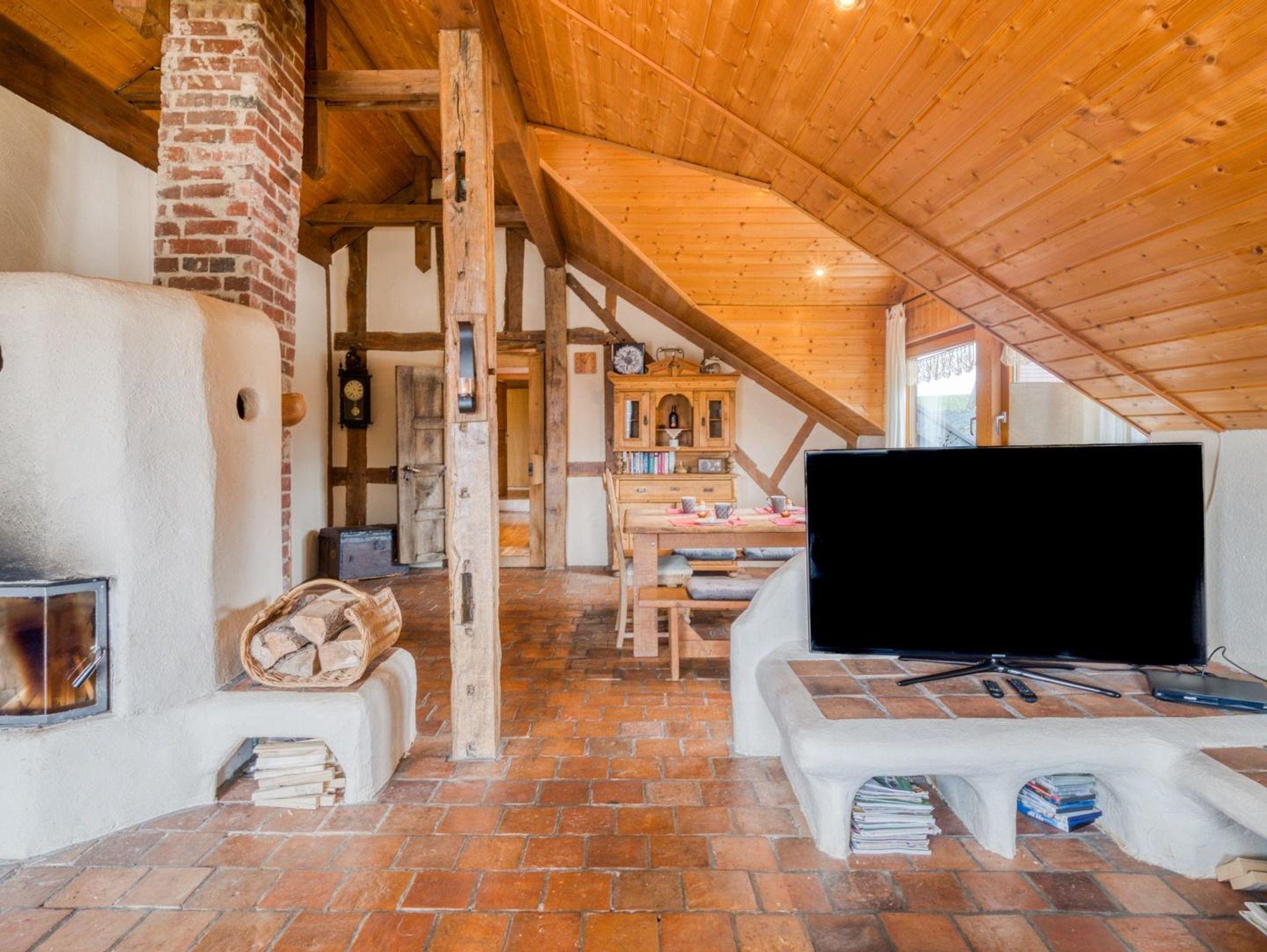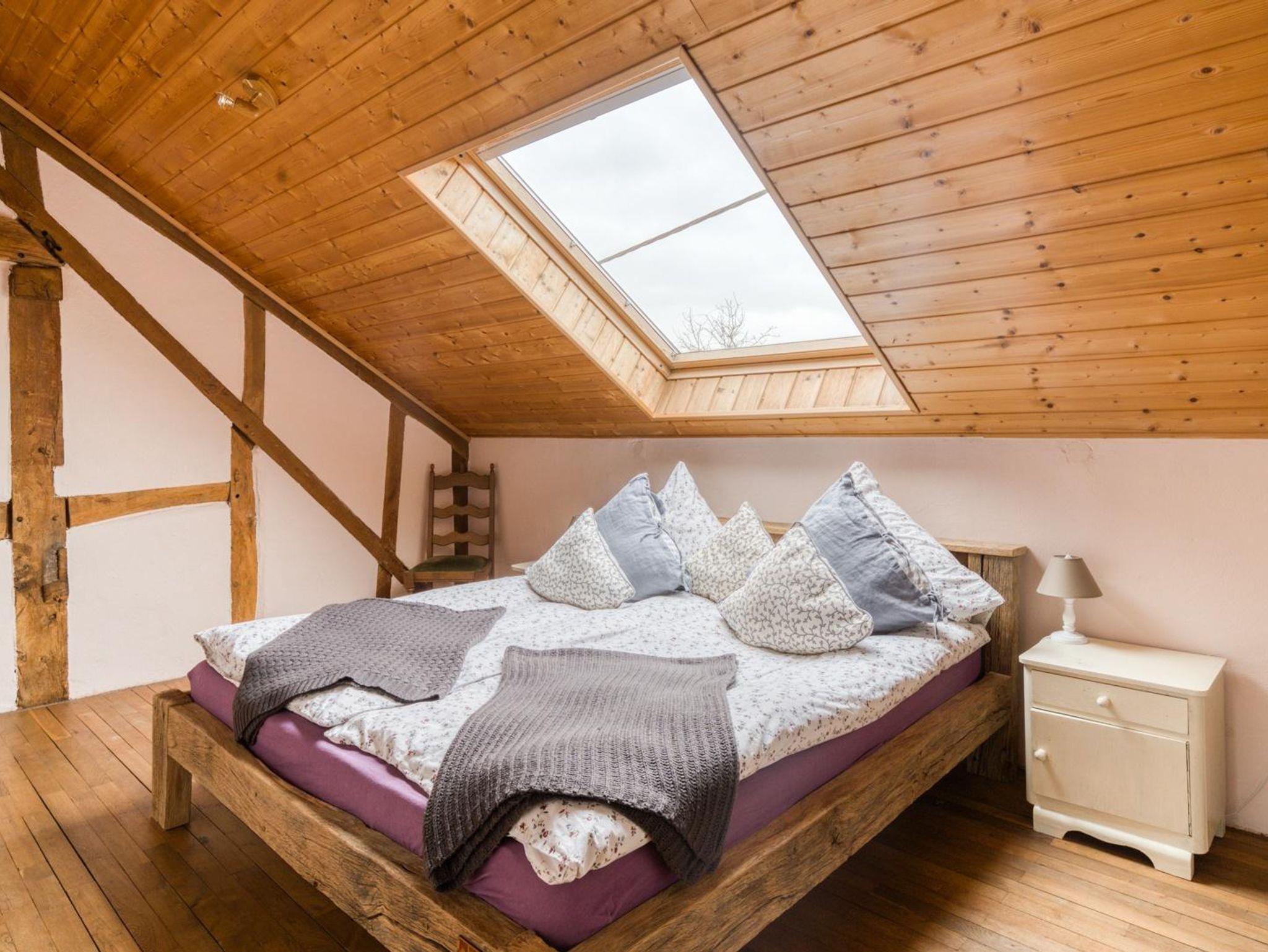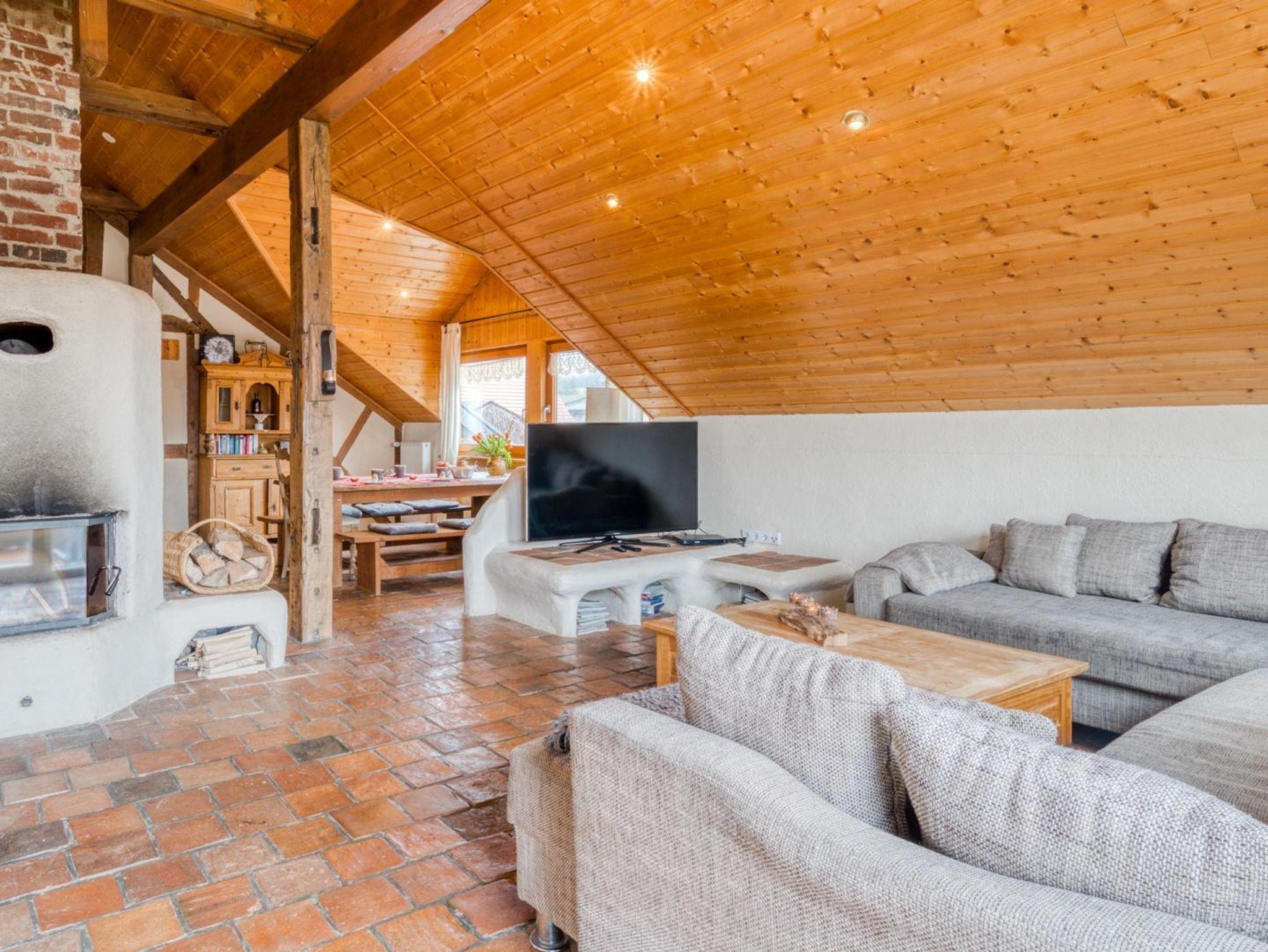 …der Name kommt nicht von ungefähr, denn tatsächlich handelte es sich bei dem Dachgeschoss des Lindenhofes, in dem diese Ferienwohnung gelegen ist, ursprünglich einmal um das Lager für das geerntete Getreide, also um den „Kornspeicher“, der dort vor Generationen lebenden Bauern. Bis 2001 wurde der ehemalige Kornspeicher des Lindenhofes lediglich als normaler Speicherraum genutzt. Dann wurde auch dieser Teil des Lindenhofes wieder nutzbar gemacht: Es wurde fast alles abgerissen, was sich oberhalb der Decke des Obergeschosses befand und wieder komplett neu aufgebaut. Auch bei dem Neuaufbau des alten Kornspeichers waren wir darauf bedacht, möglichst viele historische Baustoffe zu verwenden und den Wohnräumen hierdurch einen ganz besonderen Charme zu verleihen. So hatten wir das große Glück für das sehr große Wohn- Esszimmer sowie zwei Schlafzimmer alte, gebrannte Tonfliesen zu finden, die tatsächlich vor ca. 200 Jahren einmal in einem Kornspeicher gelegen haben. In der Küche sowie dem dritten Schlafzimmer wurde massives Eichenschiffsbodenparkett verbaut, welches ebenfalls aus einem Rückbau stammt. Der Kornspeicher ist die größte Ferienwohnung des Lindenhofes und über eine Außentreppe erreichbar. Er verfügt über eine Grundfläche von ca. 120 m² und befindet sich wie bereits erwähnt im Dachgeschoss. Daher sind in allen Räumen zwar Dachschrägen vorhanden, die Räume sind jedoch durch den hohen Kniestock und die zwei großen Gauben nahezu vollständig nutzbar. In den drei Schlafzimmern des Kornspeichers finden 7 Personen ausreichend Platz zum Schlafen. Die beiden großen Schlafzimmer sind jeweils mit einem sehr schönen Doppelbett (180 x 200 cm) ausgestattet. Eines dieser Schlafzimmer ist mit einer großen Gaube und bodentiefen Fenstern ausgestattet, so dass man vom Bett aus eine sehr schöne Sicht auf die umliegenden Wiesen und Wälder genießen kann. In diesem Schlafzimmer ist zudem noch ein Einzelbett vorhanden. „Sterngucker“ sollten jedoch lieber das andere große Schlafzimmer wählen, denn hier befindet sich das Bett unmittelbar unter einem 140 cm großen Dachfenster mit freier Sicht direkt in den Himmel. Das kleine Schlafzimmer verfügt über zwei über Eck gebaute Einzelbetten mit den Maßen 90 x 200cm sowie 100x200 cm. Vervollständigt werden die Schlafzimmer durch antike Kleiderschränke bzw. eine antike Kommode. Bei einer Belegung mit mehr als 7 Personen könnte die Couch zum Schlafen genutzt werden bzw. zusätzlich ein Gästebett aufgestellt werden. Der Wohn- Essbereich bietet mit seinen ca. 45 m² sowohl Platz für einen großen, rustikalen Esstisch (100 x 200 cm), an dem bis zu 8 Personen Platz finden können, als auch für eine ebenfalls sehr geräumige Wohnlandschaft, die man z.B. für gemütliche Fernsehabende mit dem großen Flat TV oder aber lange Winterabende vor dem großen Kaminofen nutzen kann. Vom Wohnzimmer aus gelangen Sie zudem auf den 12 qm großen Balkon mit der bequemen Lounge. Auch die Küche ist mit ihren ca. 25 m² sehr geräumig und mit den sehr individuell hergestellten Schränken gemütlich gestaltet. Hier finden Sie alles, was Sie zum Kochen und Backen auf dem 90 cm breiten Elektroherd mit Induktionskochfeld benötigen. Vervollständigt wird der Kornspeicher durch das mit schönem Antikmarmor geflieste Badezimmer mit Dusche, WC und Waschtisch.