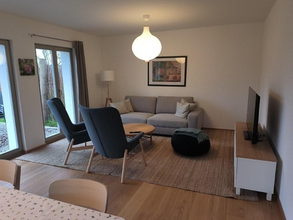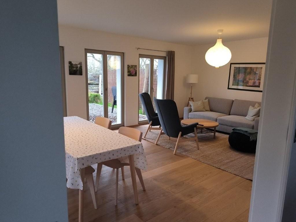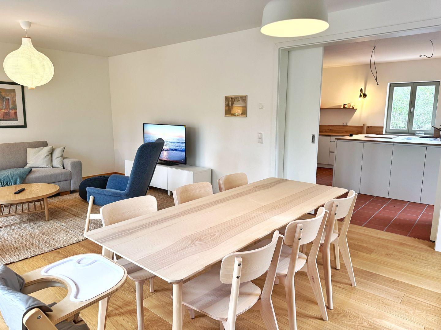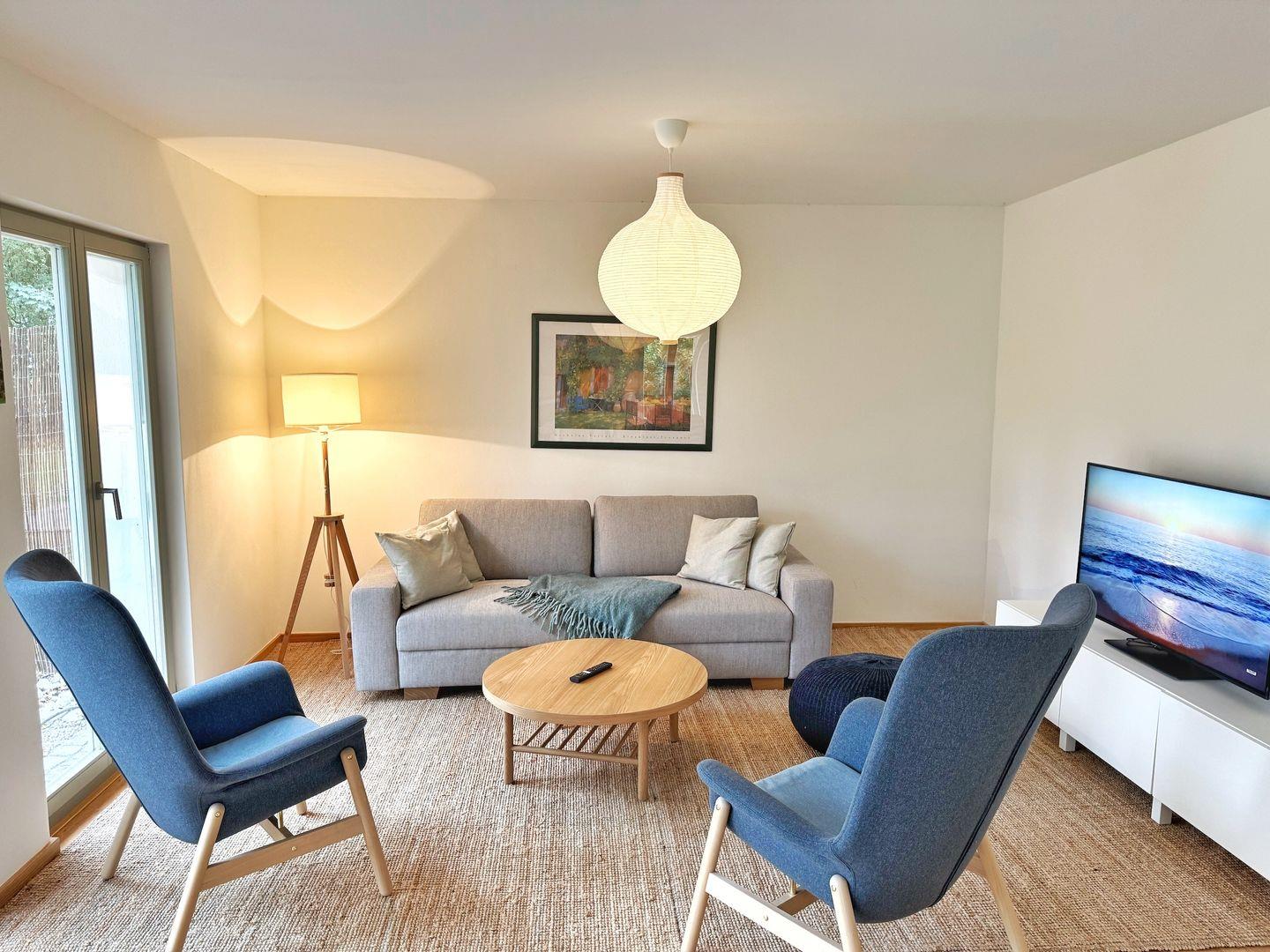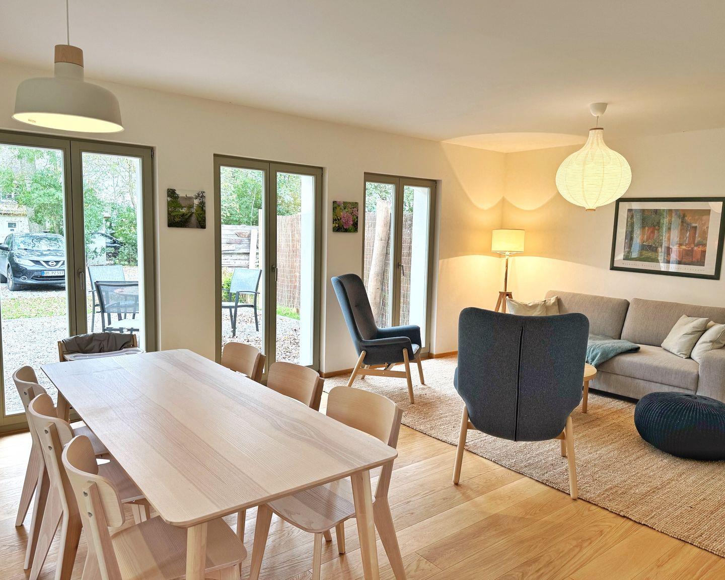 Das Wohn-Esszimmer ist großzügig gestaltet mit bodentiefen Fenstern und vorgelagerter Terrasse. Es gibt eine gemütliche Sofaecke und Sessel vor dem Flat-TV sowie einen großen Esstisch.