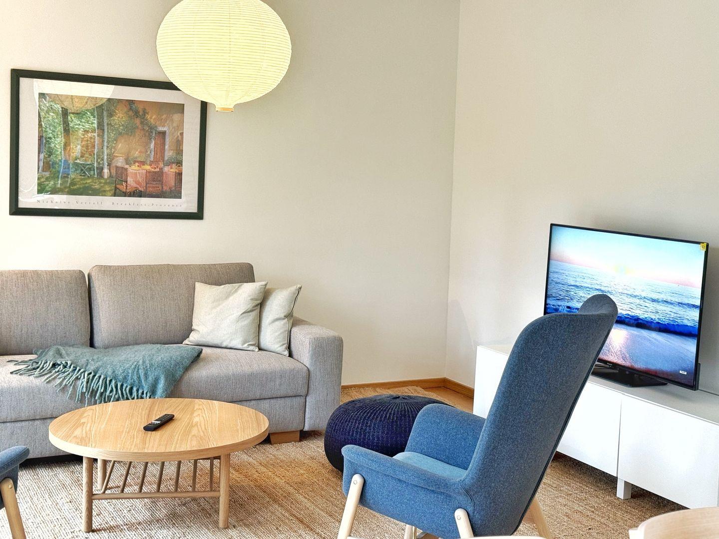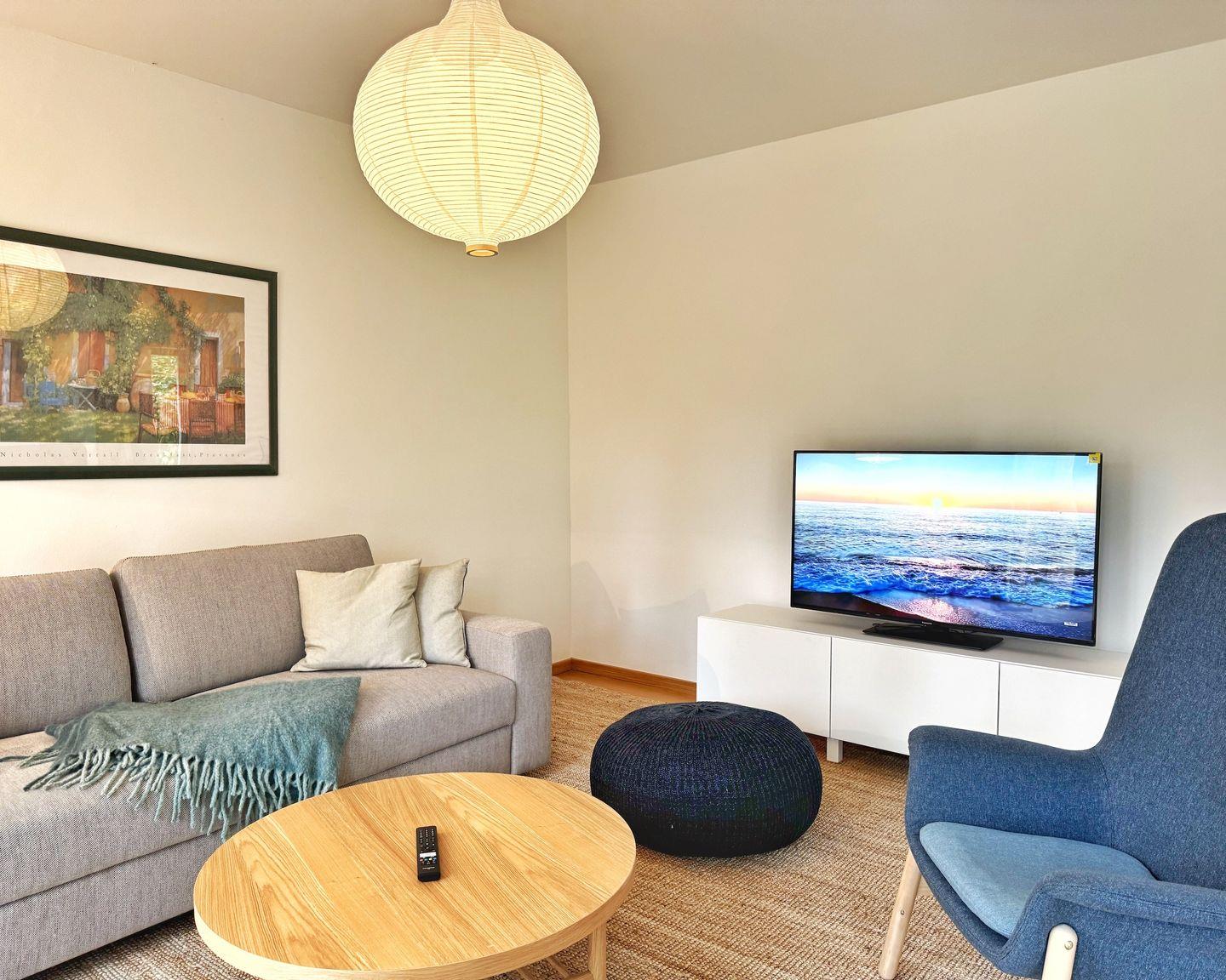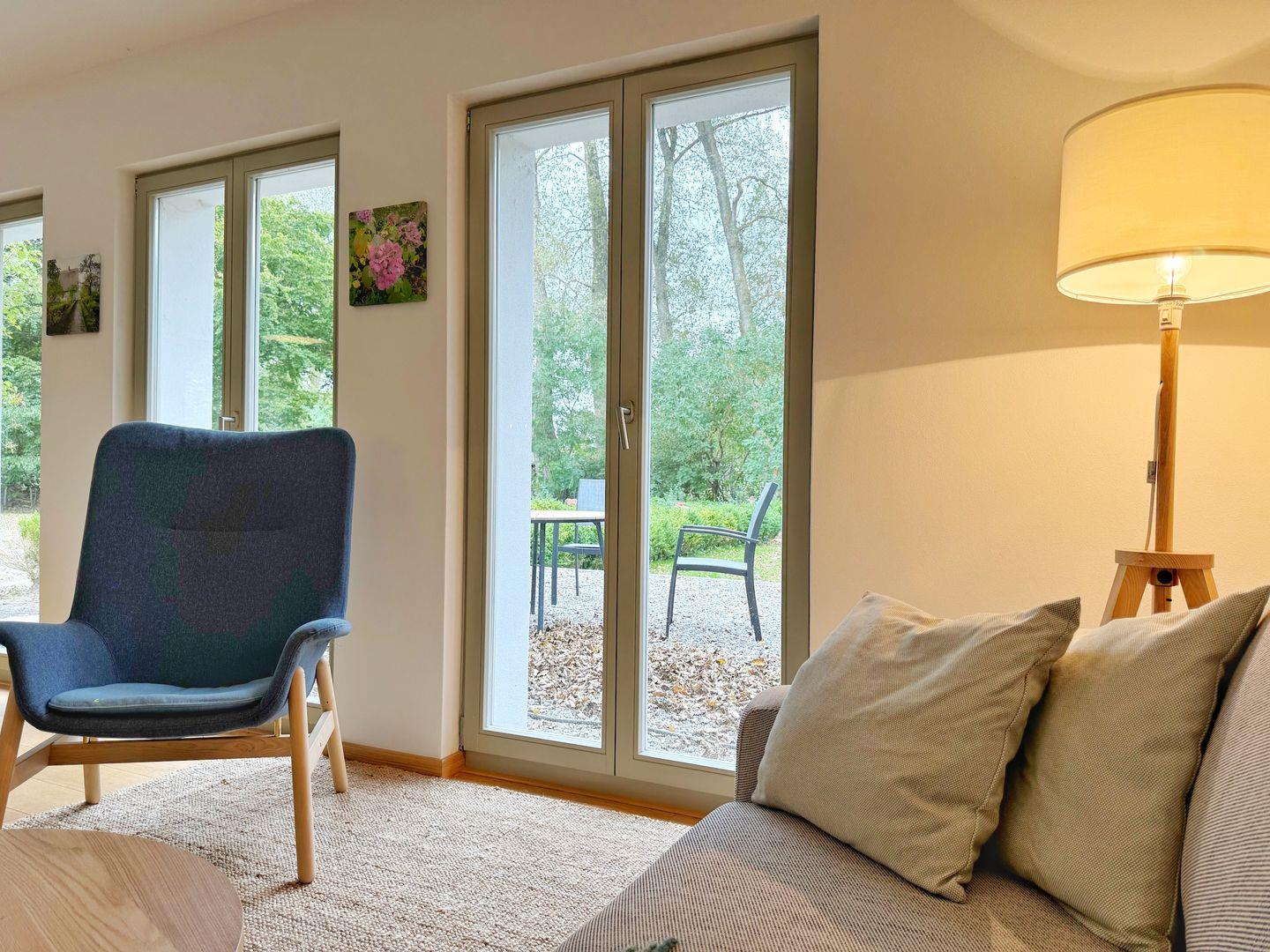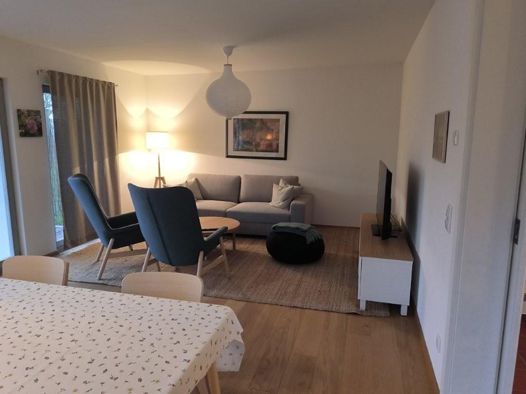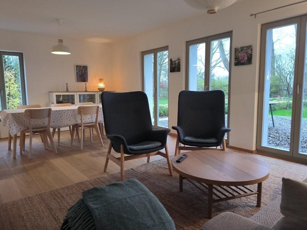 Das Wohn-Esszimmer ist großzügig gestaltet mit bodentiefen Fenstern und vorgelagerter Terrasse. Es gibt eine gemütliche Sofaecke und Sessel vor dem Flat-TV sowie einen großen Esstisch.