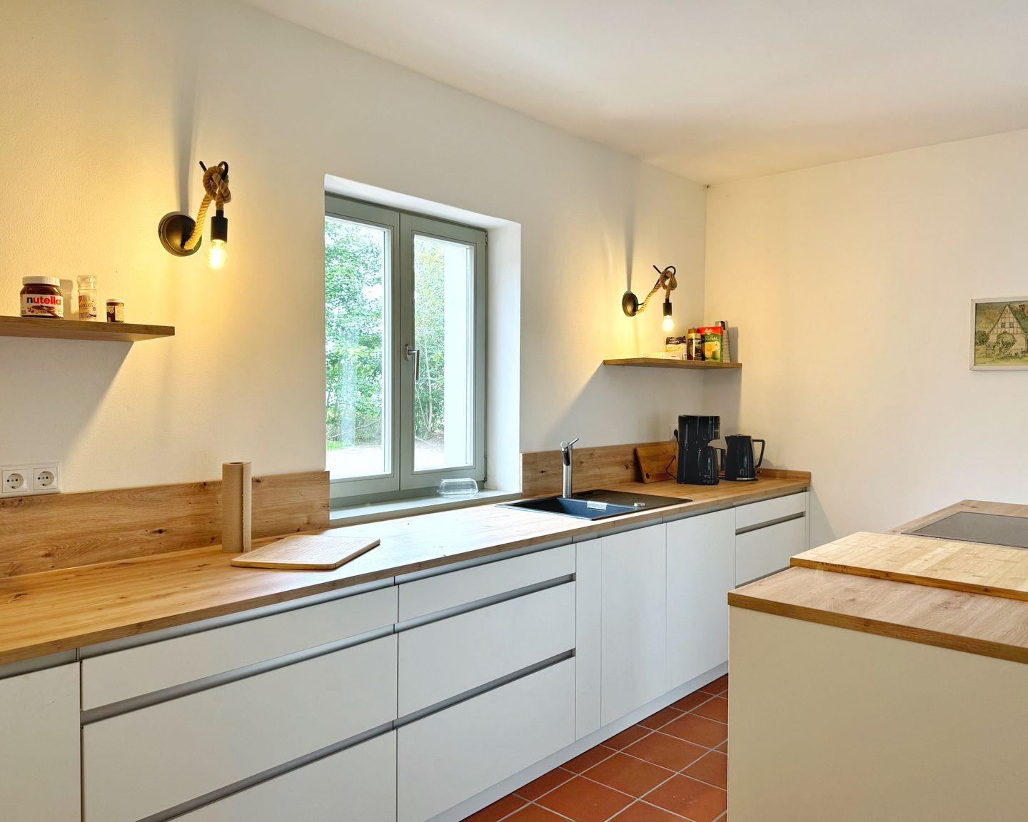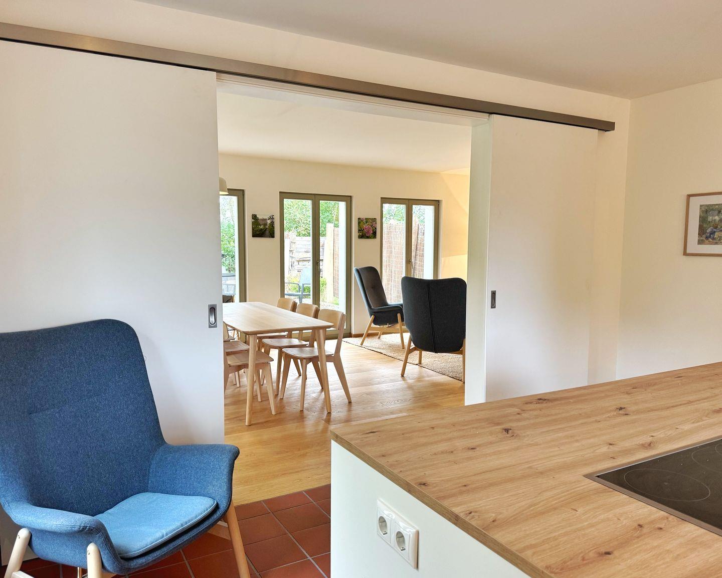 Die moderne Küche ist durch eine breite Schiebetür vom Wohnbereich getrennt. Sie ist komfortabel ausgestattet mit modernen Geräten und besticht durch ihre schlichte Eleganz mit weißen Fronten und viel Holz.
