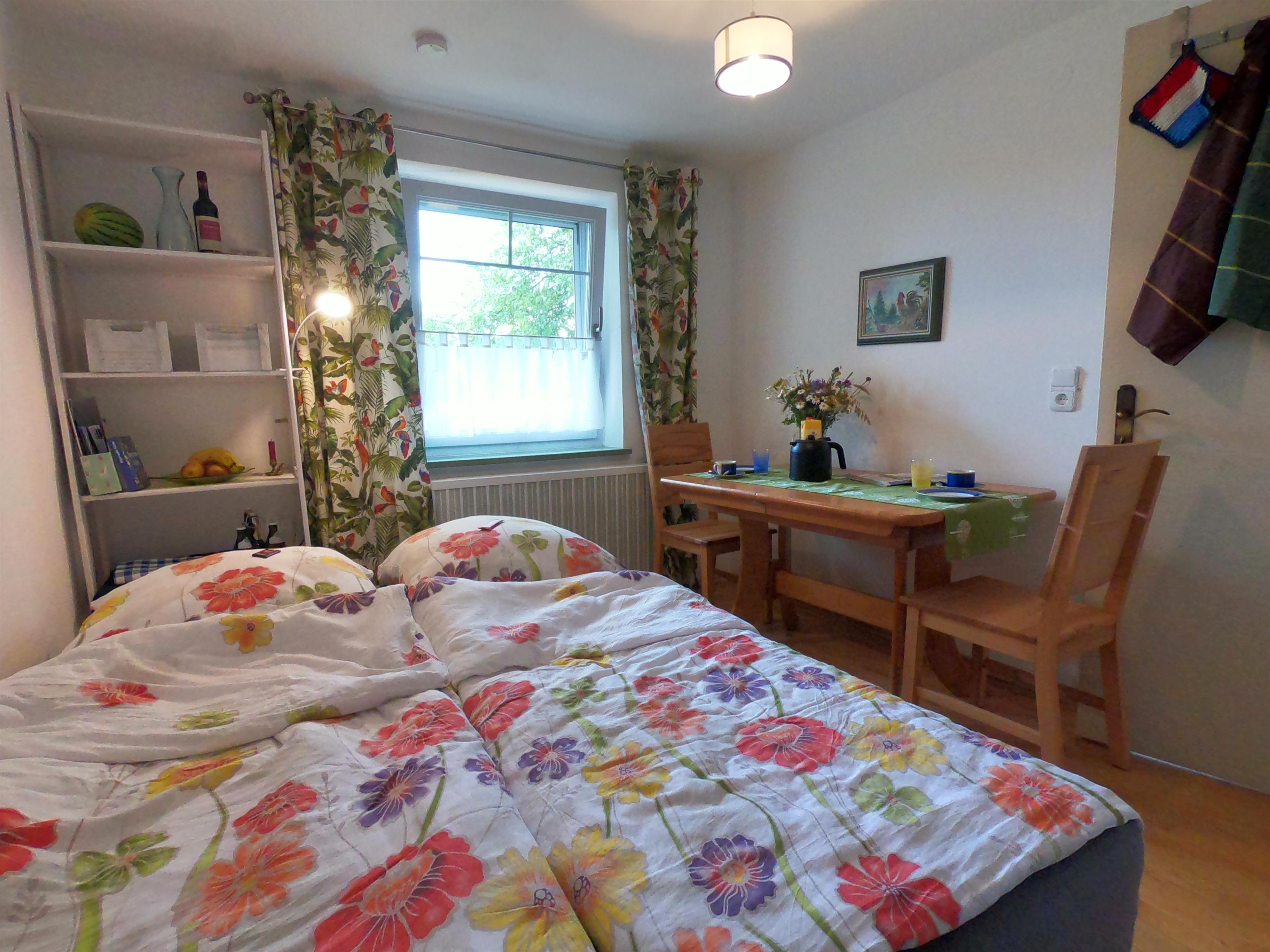 Die Ferienwohnung mit der gut ausgestatteten Küche bietet geräumig Platz für zwei bis drei Personen, gerne auch für eine kleine Familie. Kinderhochstuhl, Kinderbettzeug, Kinderessgeschirr und Spielsachen für drinnen und draußen sind vorhanden. Im Wohn/Schlafzimmer ist das Aufstellen eines Reisebettes gut möglich. Oder Sie ziehen die Möglichkeit vor, in zwei Räumen zu nächtigen: Dies ist mithilfe der hochwertigen Schlafcoach in der Küche, die über eine komfortable Liegefläche von 140cm x 200cm verfügt, gut möglich. (Nicht nur) Senioren freuen sich über die Parkmöglichkeit auf dem Grundstück und die ebenerdige Lage der Ferienwohnung, die auch im Hochsommer angenehm kühl bleibt. Wollen Sie es romantisch, dann nehmen Sie den Kaminofen im Wohn/Schlafzimmer in Betrieb. Ihr Heizen sonst ist emissionsfrei, denn die Wärme aus den Heizkörpern stammt von der Wärmepumpe, die ihren Strom wiederum von der hauseigenen Photovoltaikanlage bezieht, ergänzt durch echten Ökostrom. Die auf dem Dach befindliche Solarthermie erwärmt Ihr Duschwasser. Eine in der Ferienwohnung befindliche Waschmaschine ermöglicht einen komfortablen, längeren Aufenthalt.