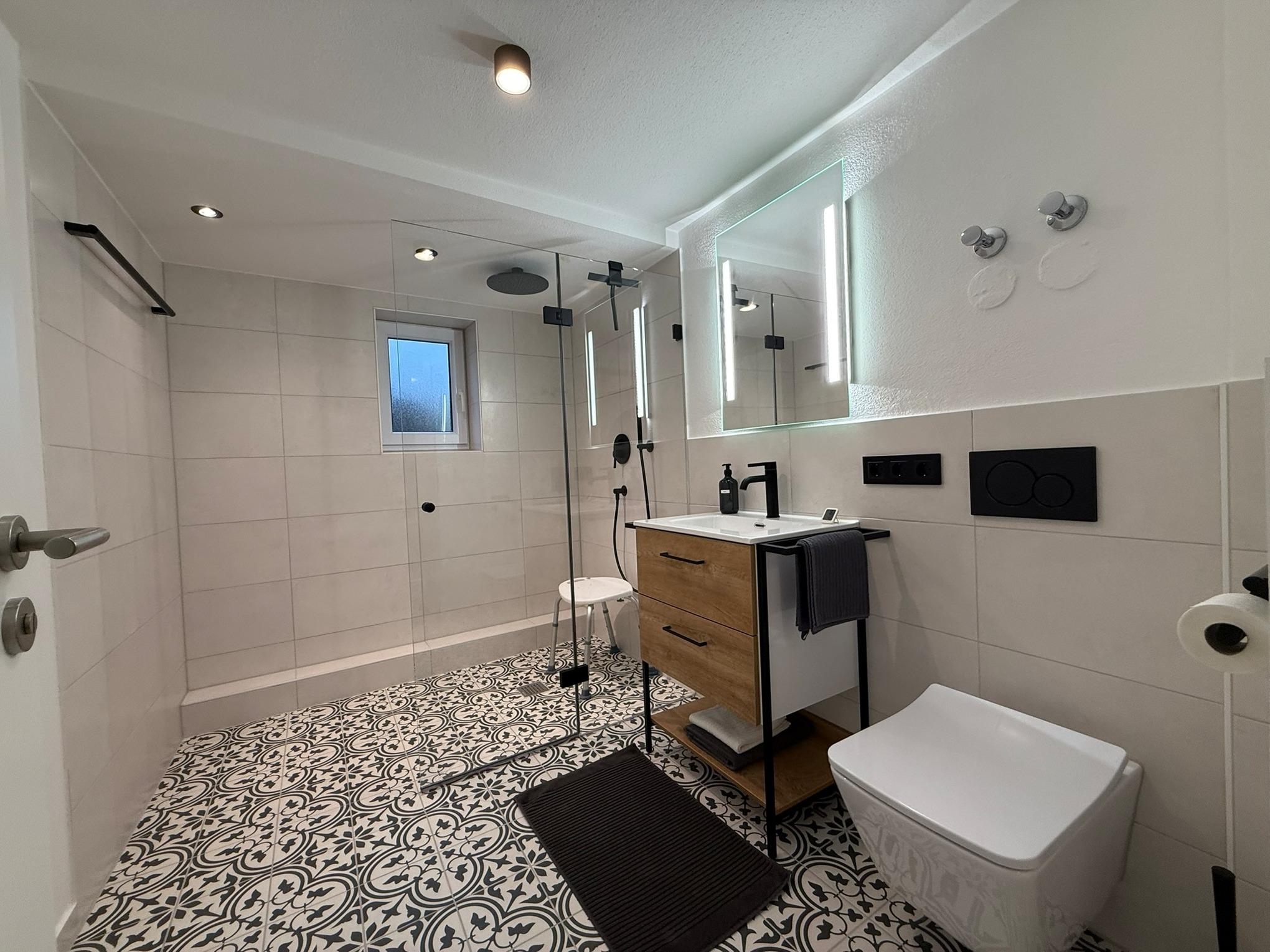 Sie verfügt über ein separates Schlafzimmer (mit 55Zoll TV)mit Doppelbett sowie ein Bad mit ebenerdiger Dusche.
