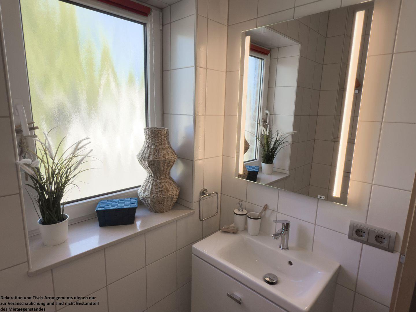 Ein Fenster sorgt für angenehmes Tageslicht, während ein großzügiger Unterschrank ausreichend Platz für Ihre Pflegeartikel bietet.