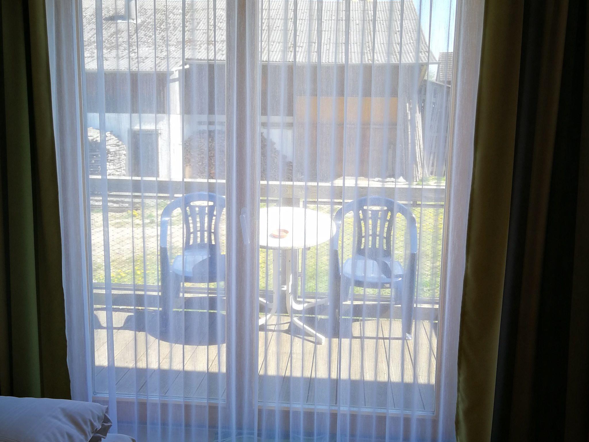 Durch die große Glastür kommen sie auf den Balkon. Dieser ist gartenseitig mit Morgensonne und Sitzgelegenheit.