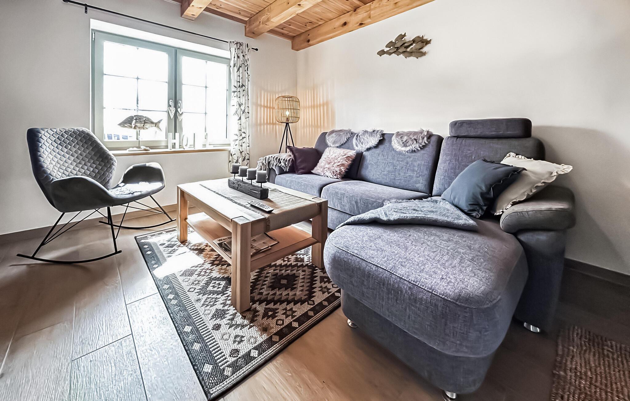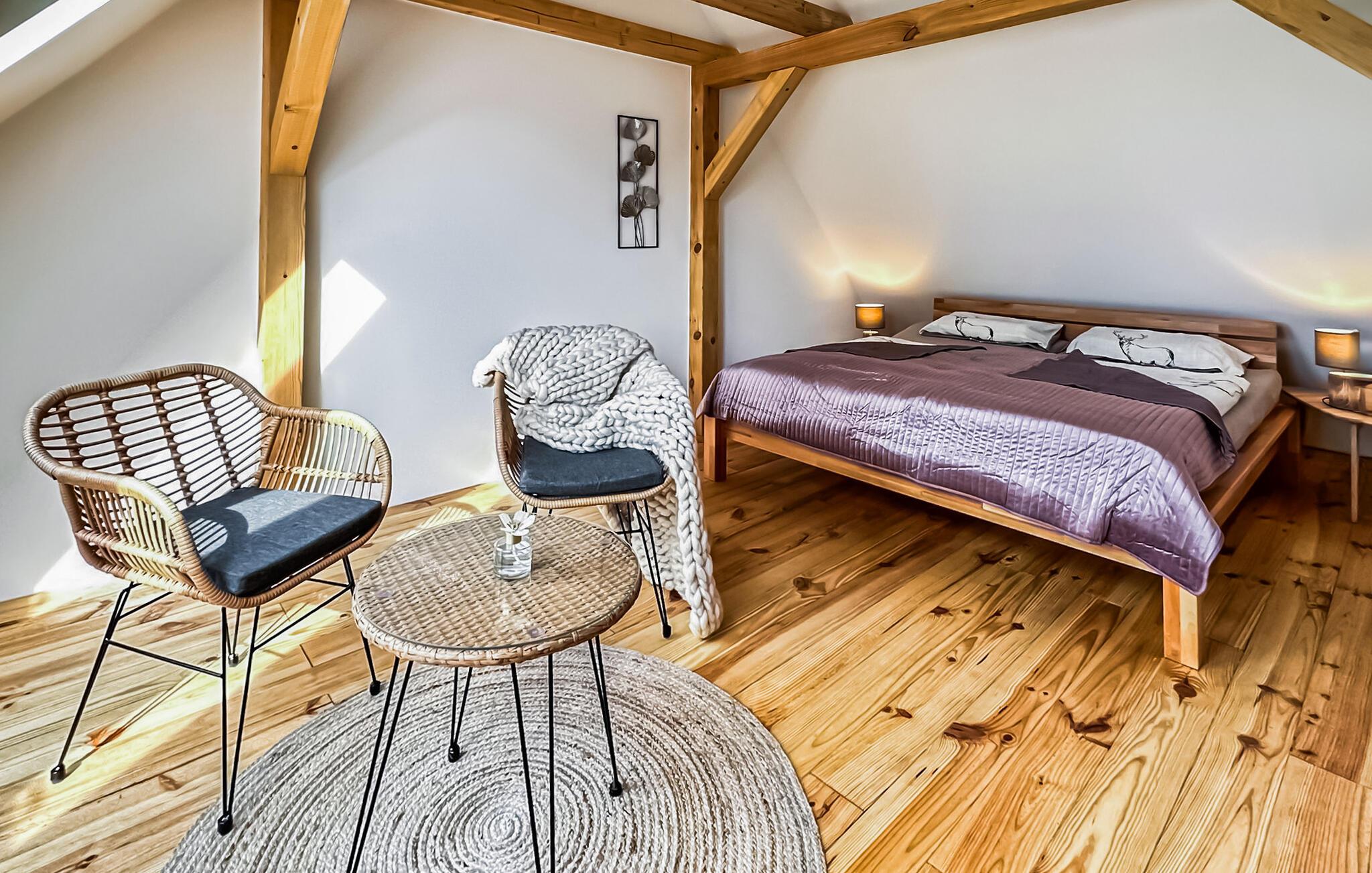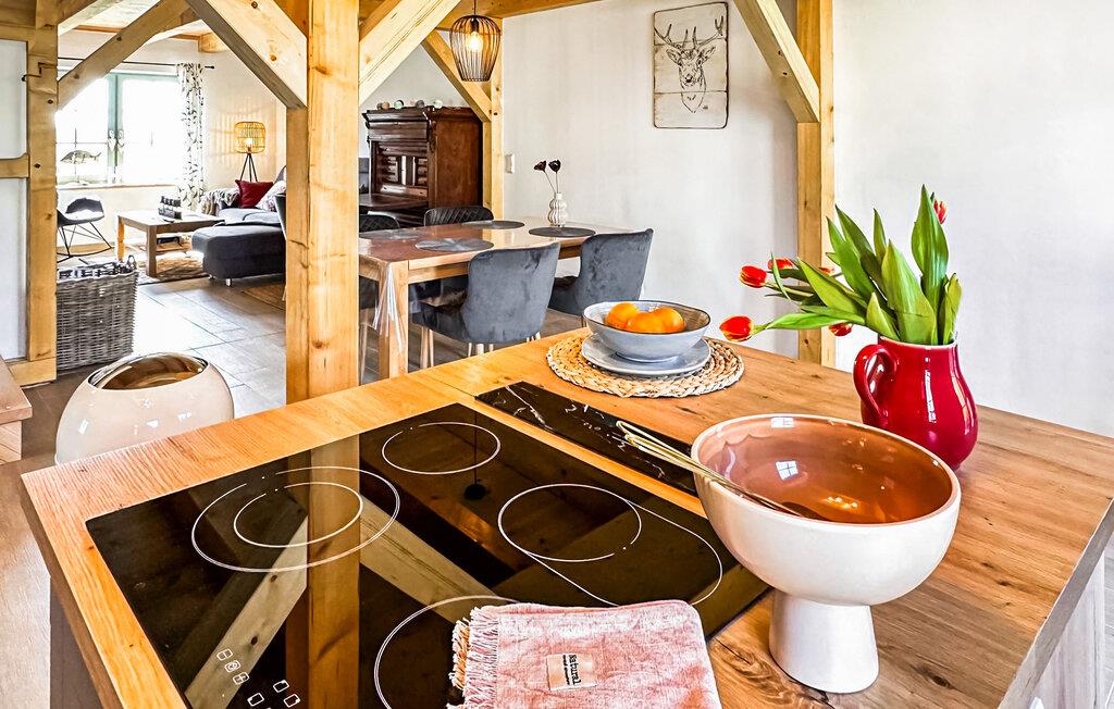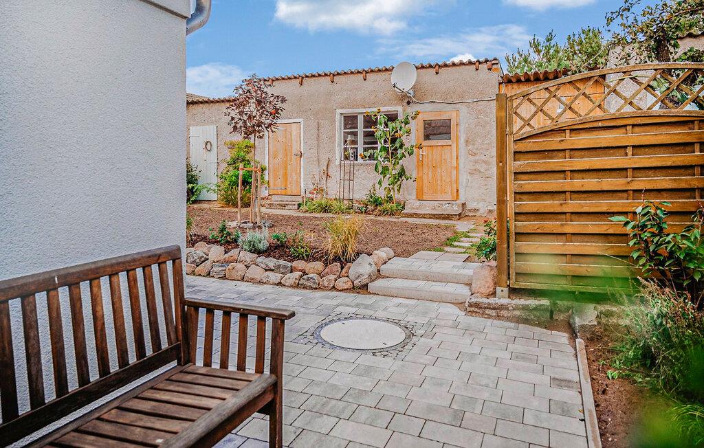 Das 110 qm große Ferienhaus für max. 4 Personen und ein Baby befindet sich auf einem 500 qm großen, separaten und vollständig umzäunten Erholungsgrundstück zur alleinigen Verfügung, nur etwa 200 m vom Stettiner Haff entfernt.Die Doppelhaushälfte, ein ehemaliges Bauernhaus, wurde vom Jahre 2021 bis zum Jahr 2023 aufwendig saniert und komplett neu ausgestattet (Erstbezug Juni 2023). Sie erstreckt sich über zwei Wohnebenen. Vorhanden sind im Erdgeschoss ein Wohnraum (Polstermöbel, Smart-TV mit Vorbereitung bekannter Streamingdienste, Sekretär/Schreibtisch, Esstisch, Kaminofen), eine offene Küche (E-Herd mit Backofen, Kühlschrank mit Tiefkühlfach, Spülmaschine, div. Küchengeräte), 1 Schlafraum (2 x Einzelbett) und ein Gäste-WC mit Waschmaschine. Im Obergeschoss gibt es einen weiteren Schlafraum (1 x Doppelbett) mit unverbautem Haffblick und ein Bad mit DU/WC. Für Kleinkinder stehen ein Kinderbett und ein Kinderhochstuhl bereit. Internet (W-LAN) ist ebenfalls vorhanden. Im Außenbereich gibt es eine möblierte Terrasse, einen Balkon, Grill, Sonnenliegen, sichere Unterstellmöglichkeit für mitgebrachte Fahrräder und Parkplatz. Das Haus ist mit einer modernen Wärmepumpe (Fußboden-Heizung) sowie einem Kaminofen ausgestattet. Die Erstausstattung Kaminholz ist gratis.