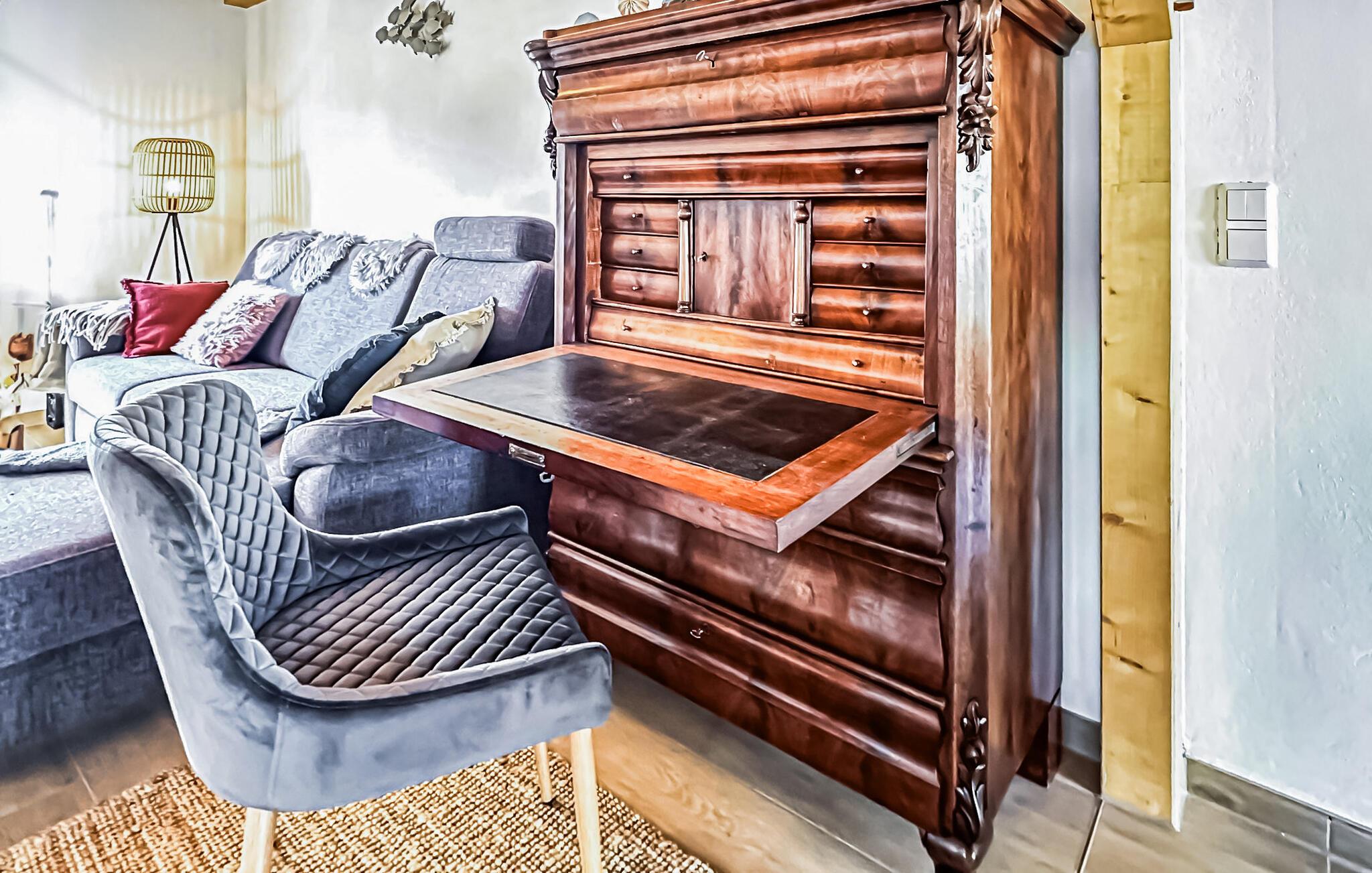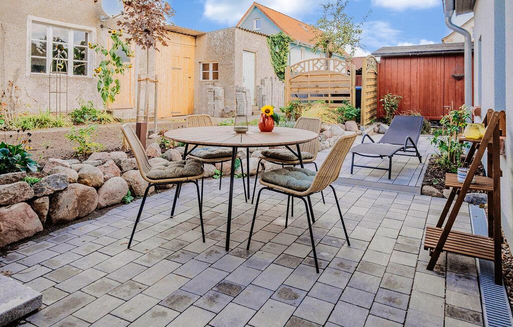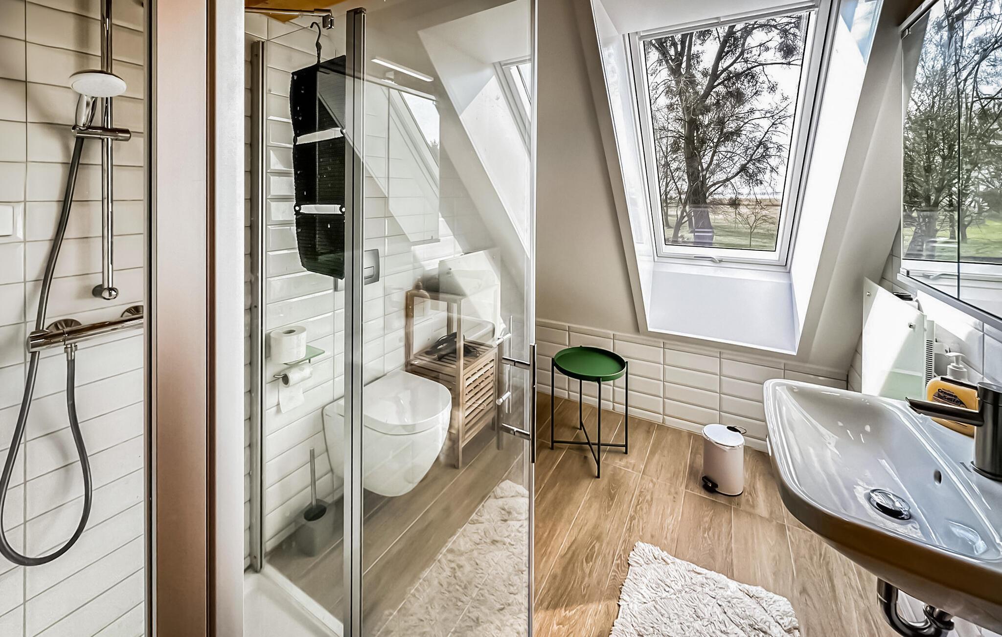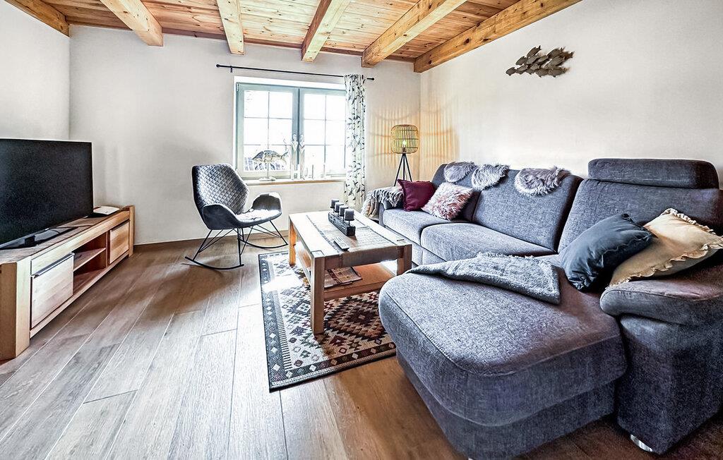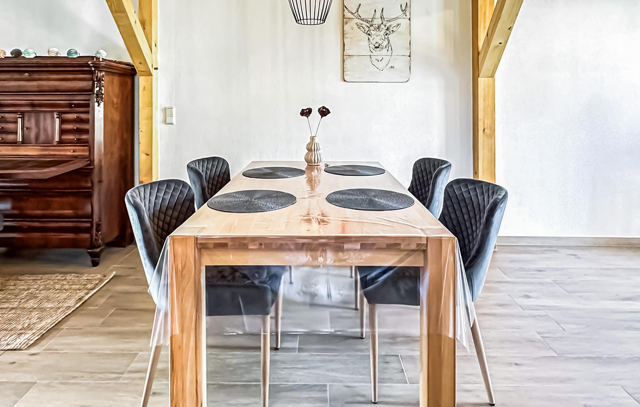Das 110 qm große Ferienhaus für max. 4 Personen und ein Baby befindet sich auf einem 500 qm großen, separaten und vollständig umzäunten Erholungsgrundstück zur alleinigen Verfügung, nur etwa 200 m vom Stettiner Haff entfernt.Die Doppelhaushälfte, ein ehemaliges Bauernhaus, wurde vom Jahre 2021 bis zum Jahr 2023 aufwendig saniert und komplett neu ausgestattet (Erstbezug Juni 2023). Sie erstreckt sich über zwei Wohnebenen. Vorhanden sind im Erdgeschoss ein Wohnraum (Polstermöbel, Smart-TV mit Vorbereitung bekannter Streamingdienste, Sekretär/Schreibtisch, Esstisch, Kaminofen), eine offene Küche (E-Herd mit Backofen, Kühlschrank mit Tiefkühlfach, Spülmaschine, div. Küchengeräte), 1 Schlafraum (2 x Einzelbett) und ein Gäste-WC mit Waschmaschine. Im Obergeschoss gibt es einen weiteren Schlafraum (1 x Doppelbett) mit unverbautem Haffblick und ein Bad mit DU/WC. Für Kleinkinder stehen ein Kinderbett und ein Kinderhochstuhl bereit. Internet (W-LAN) ist ebenfalls vorhanden. Im Außenbereich gibt es eine möblierte Terrasse, einen Balkon, Grill, Sonnenliegen, sichere Unterstellmöglichkeit für mitgebrachte Fahrräder und Parkplatz. Das Haus ist mit einer modernen Wärmepumpe (Fußboden-Heizung) sowie einem Kaminofen ausgestattet. Die Erstausstattung Kaminholz ist gratis.