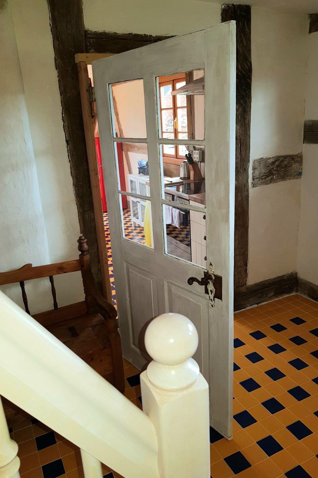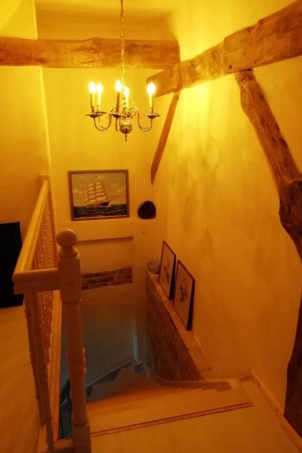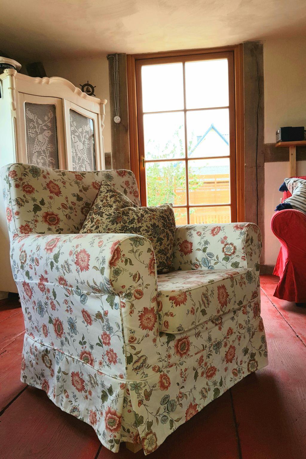 Die Ferienwohnung "Traudel" mit separatem Eingang vom Garten aus. Erdgeschoss: Flurbereich mit Garderobe. Wohnzimmer: antiker Vitrinen Schrank, Kommode, kleiner origineller Deko-Vitrinen-Schrank, Flach-TV, kleines Beistelltischchen, Sitzmöbel, kleiner Couchtisch, bequemes 2er Sofa, Stehleuchte, kleine Lampen, Bücherregal umgebaut aus antikem Holzboot, Kamin, Blu-Ray- und DVD-Player, Bücher und CD´s, Korb für Kaminholz, Musikanlage (Radio, USB und CD) Küche: Küche mit Sitzbereich für 2-4 Personen, hist. Delfter Kronleuchter, Retrokühlschrank mit Gefrierfach, Vollküche mit mehr als genügend Töpfen, Pfannen, Besteck, Salatschüsseln, Tellern, Weingläsern, Mehrzweckgläsern, Sektgläsern, Kaffeebechern, Kaffeetassen, Mikrowelle, Espressomaschine, Kaffeemaschine, Mixer, Schneidebrett, Toaster, Wasserkocher, Kochutensilien, Gewürzregal, Schubläden, Geschirrspüler für 4 Personen, Waschmaschine, Regale, kleine Erstausstattung bestehend aus 2 Geschirrtüchern, 2 Espresso-Kapseln, einigen Kaffeefiltern, 1 Rolle Küchenpapier und einigen Geschirr-Spültaps