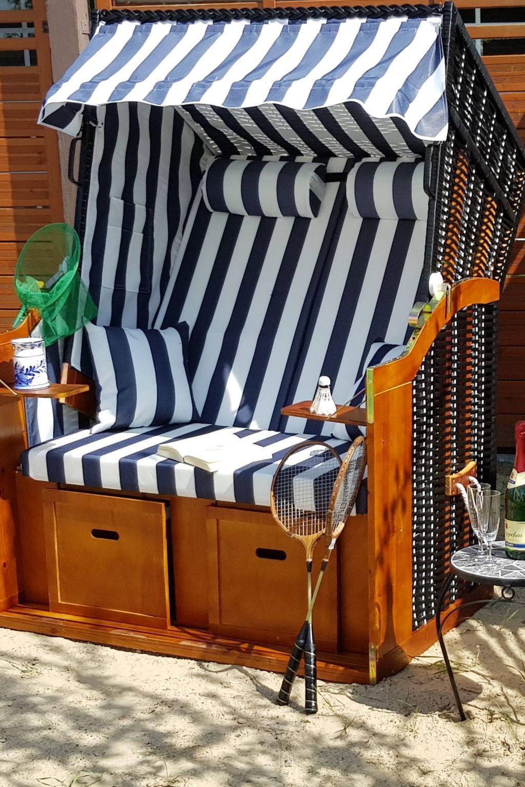 Einen Strandkorb mit wunderschönem Sonnenuntergang eingebettet wie am Strand und große und kleine Kinder werden sicherlich ihren Spaß beim Burgenbauen haben.