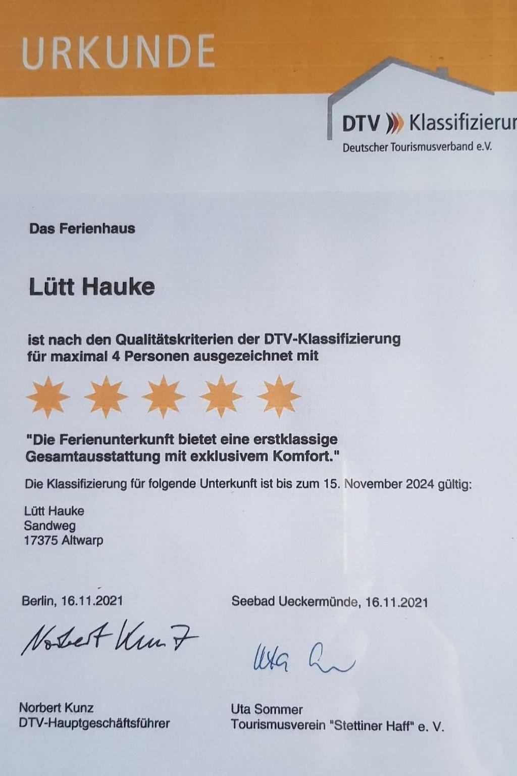 Das Fischer Hus Lütt Hauke ist seit Herbst 2021 mit 5 von 5 Sternen vom Deutschen Tourismusverband klassifiziert.