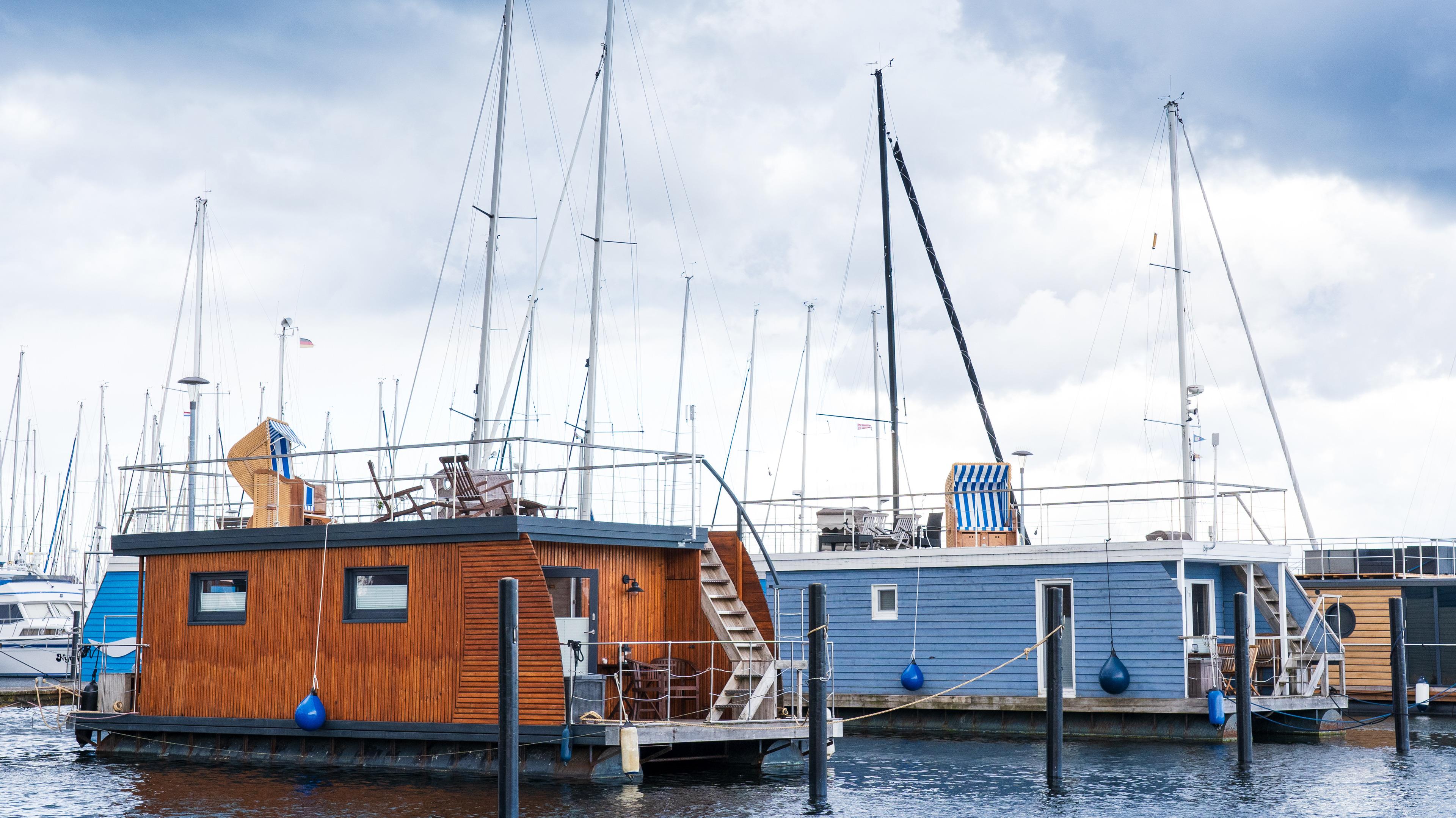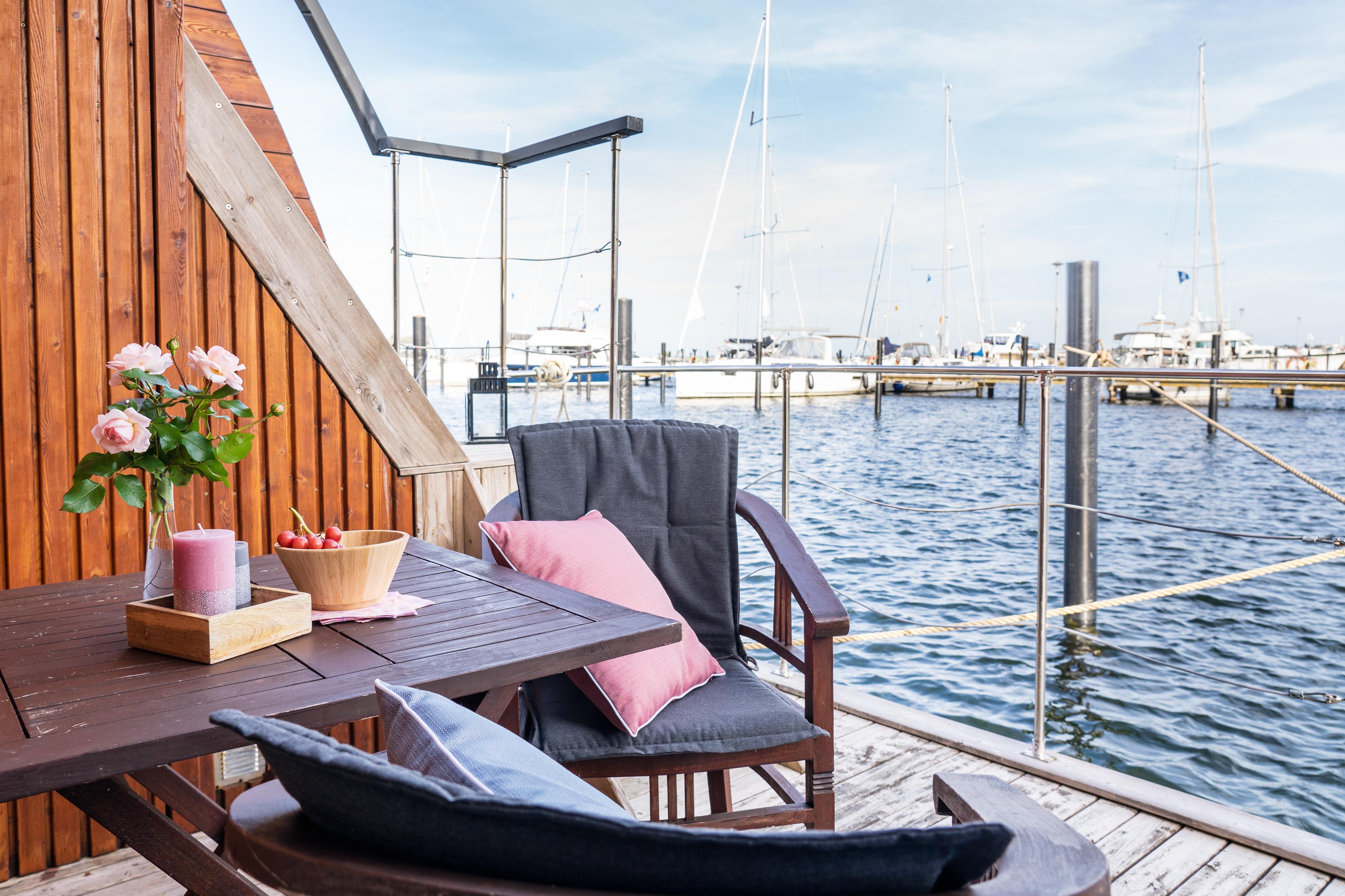 Charmantes Hausboot mit Meerblick im Yachthafen Heiligenhafen, ideal für einen erholsamen Urlaub direkt am Wasser.