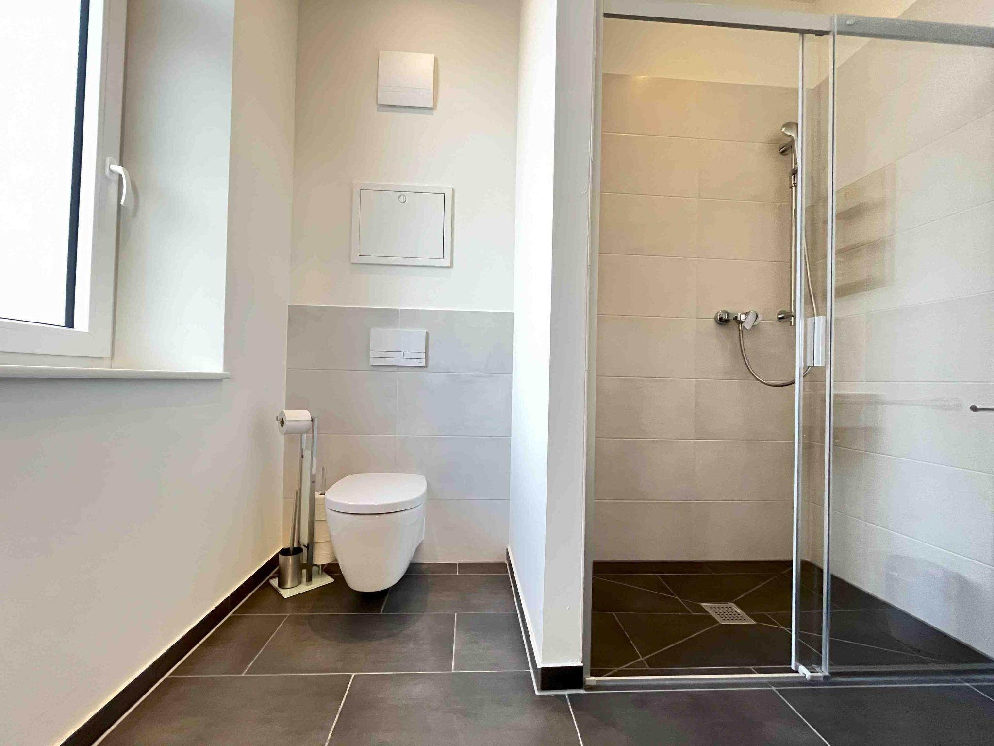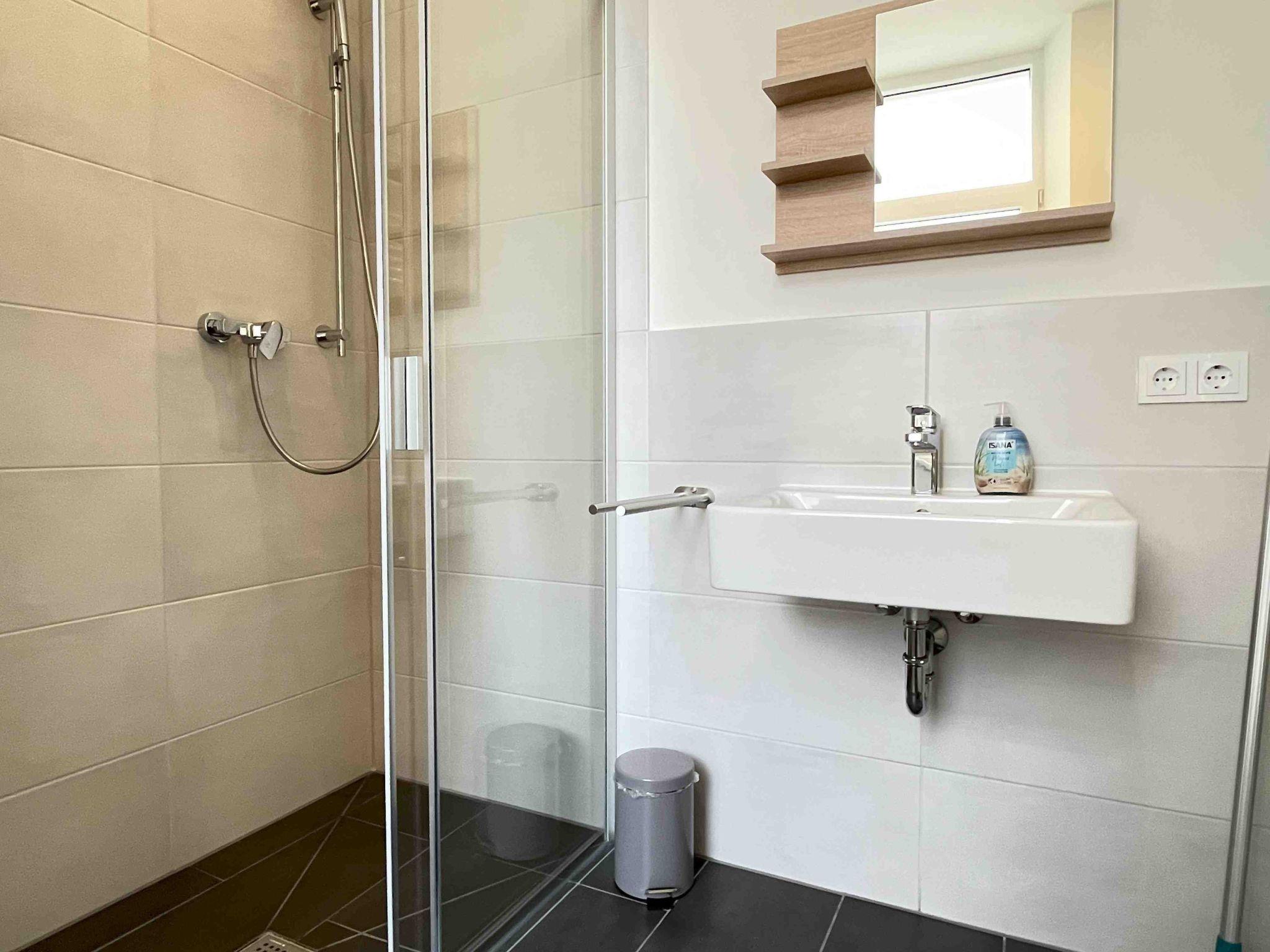 Das Badezimmer besteht aus einem WC, einem Waschbecken und einer Dusche.