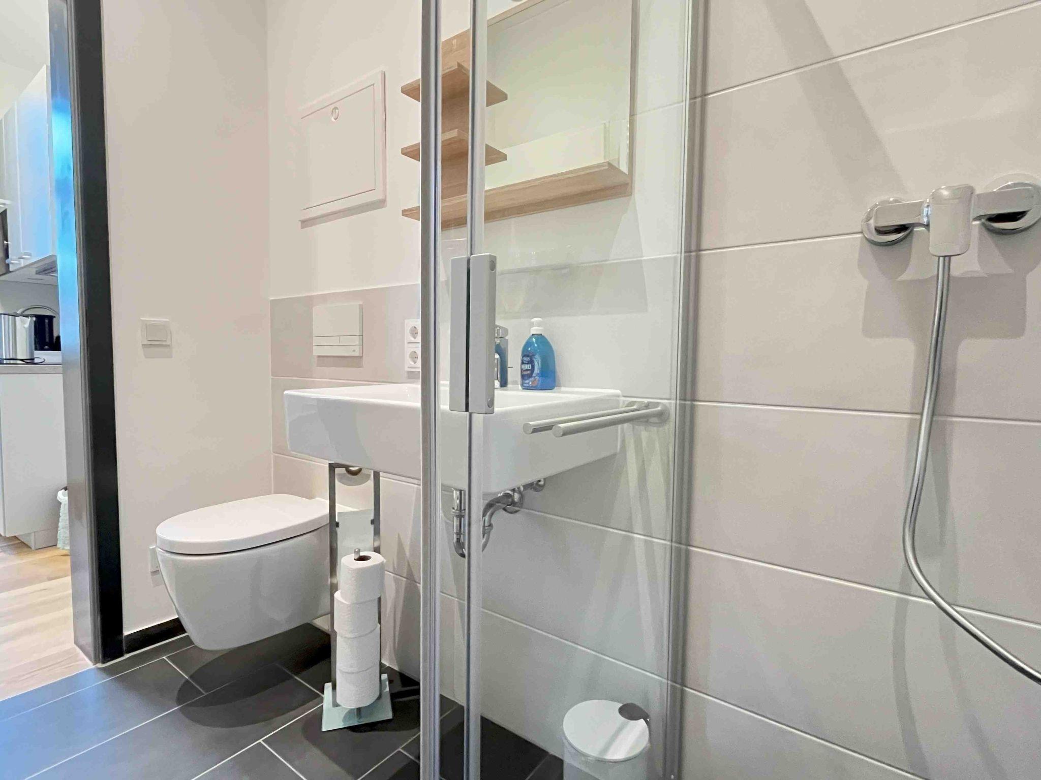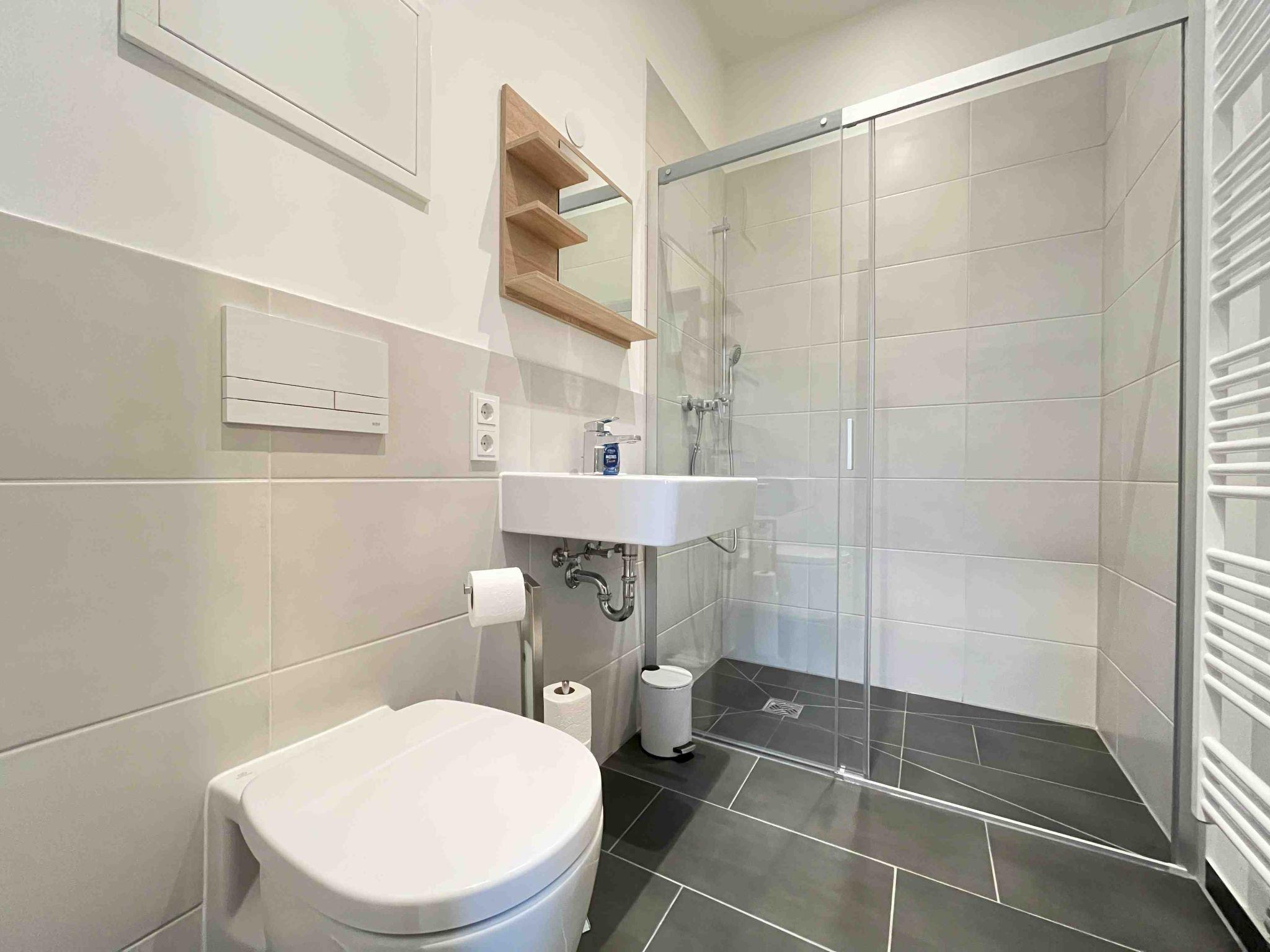Das Badezimmer besteht aus einem WC, einem Waschbecken und einer Dusche.