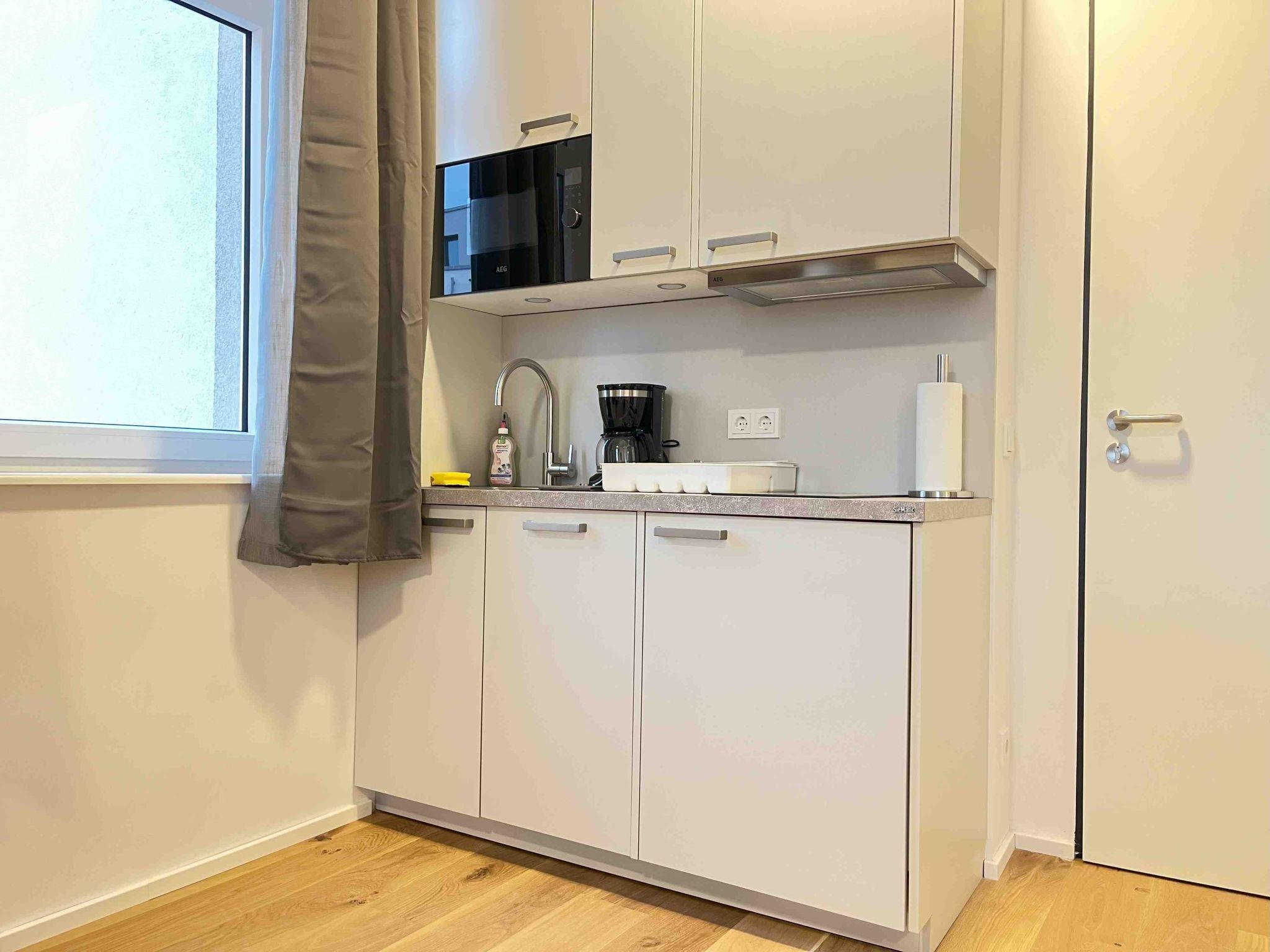 Es gibt eine voll ausgestattete Küche inklusive elektronischer Geräte wie Geschirrspüler, Kühl-/Gefrierschrank, Kaffeemaschine sowie einer Grundausstattung zum Kochen (Töpfe, Pfannen, Küchengeräte und Besteck).