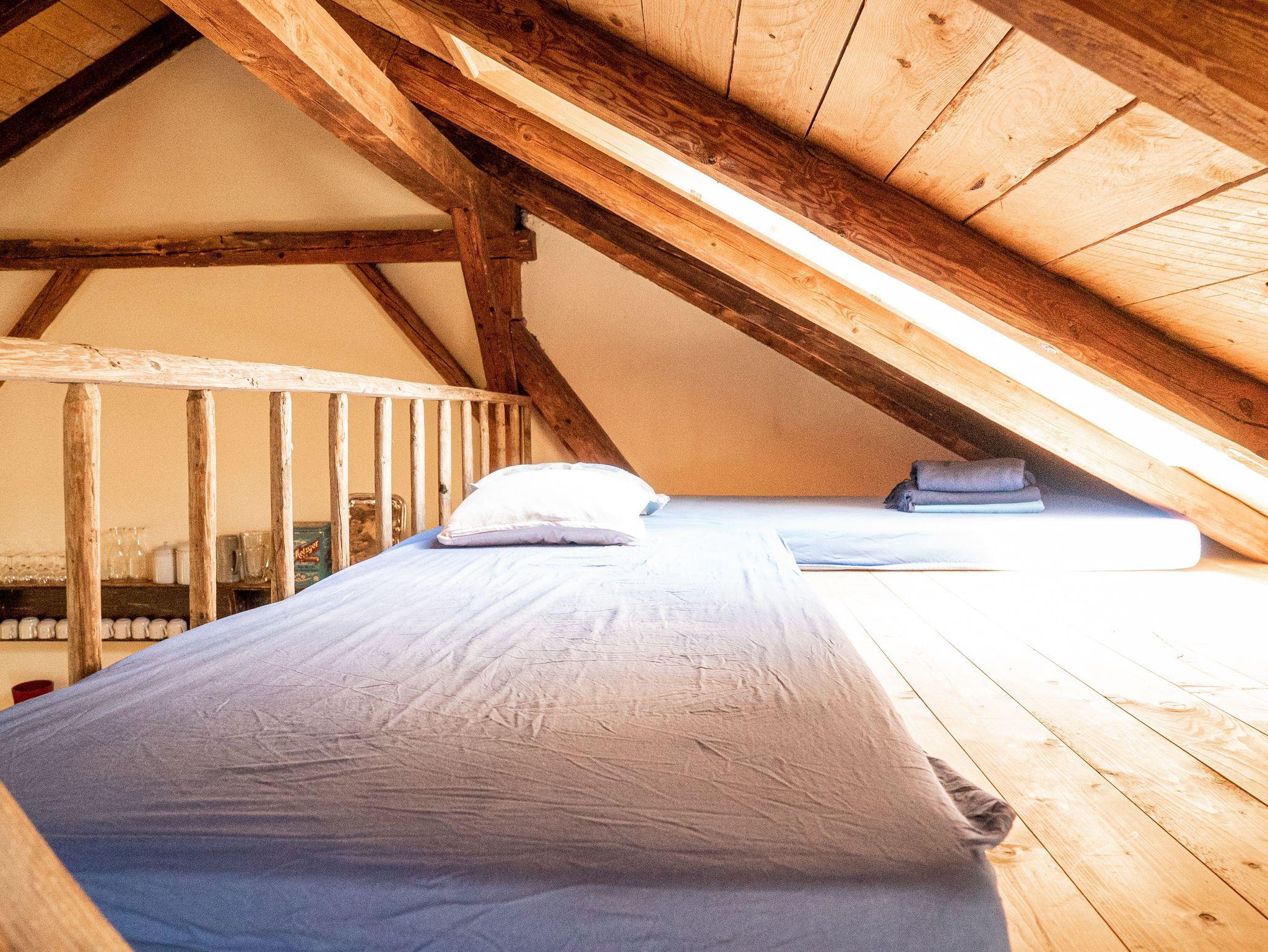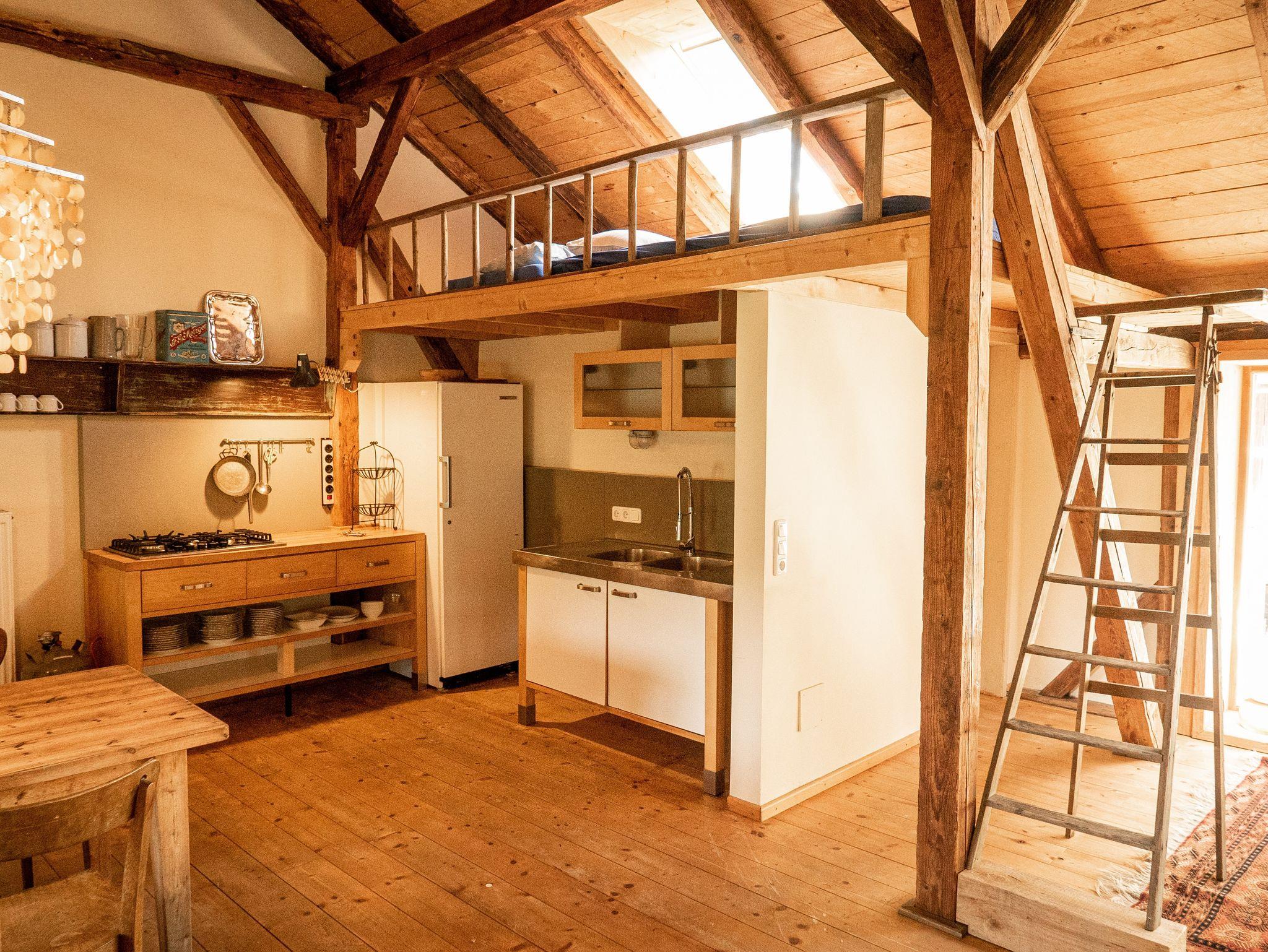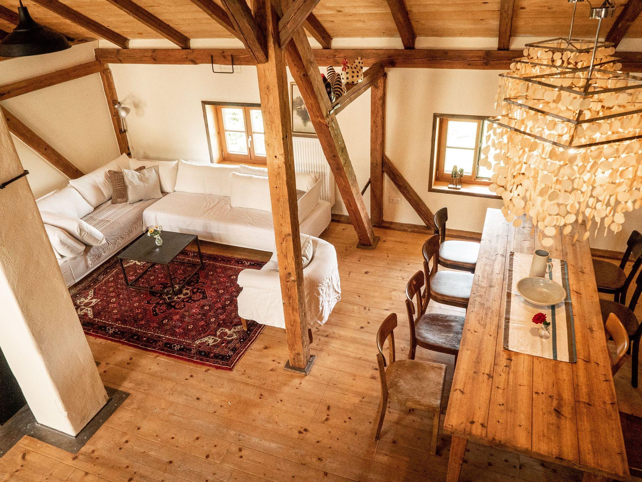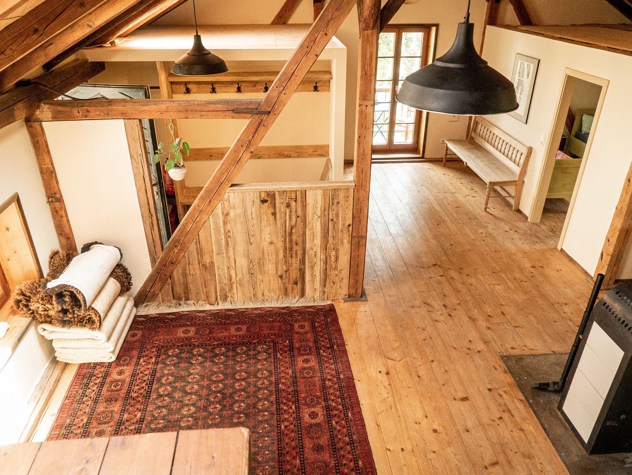 Die Wohnung wurde behutsam renoviert und zeigt Charakter durch die offenen Balkenlagen, geölte Holzdielen und eine außergewöhnliche Deckenhöhe. Ein Holzofen vervollständigt das gemütliche Ambiente.