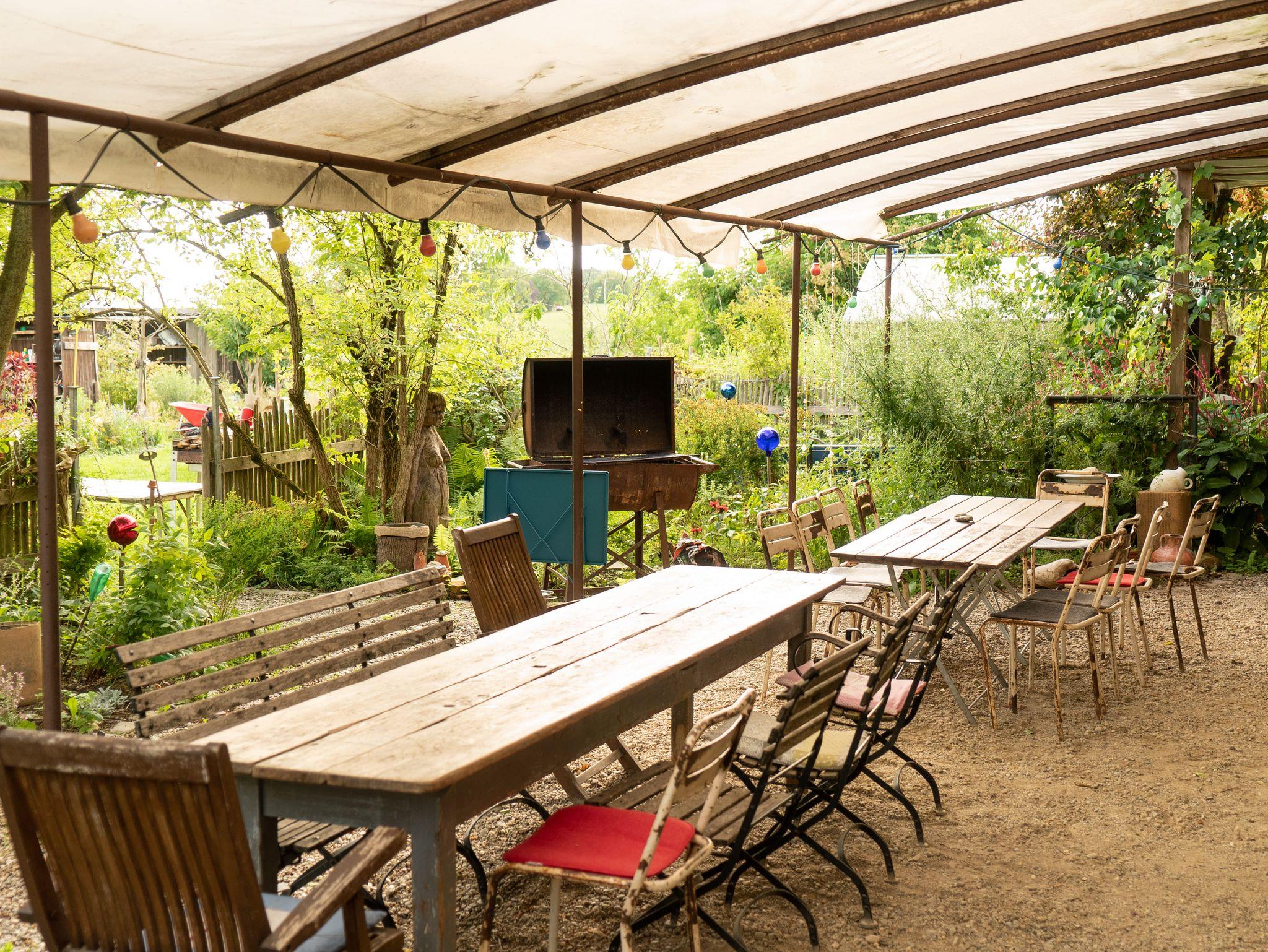 Es gibt einen großen Hausgarten für den Gemüseanbau, Schafe, Hühner, eine Streuobstanger, eine wachsende Wildschutzhecke und ein kleines Waldareal. Unter den alten Obstbäumen sind drei Campingstellplätze ausgewiesen.