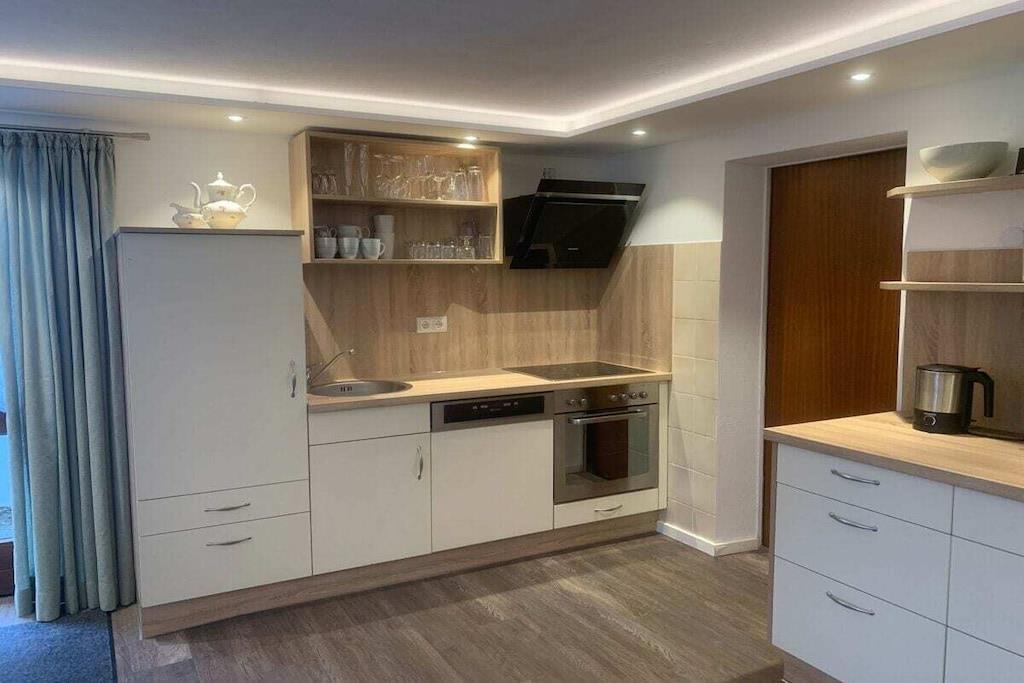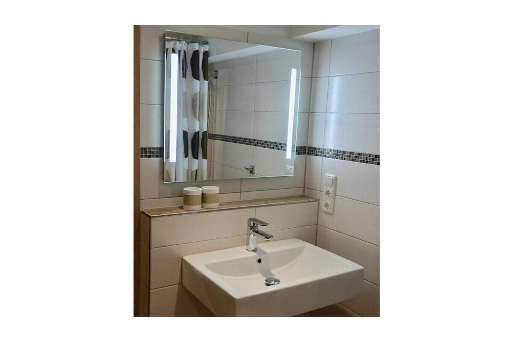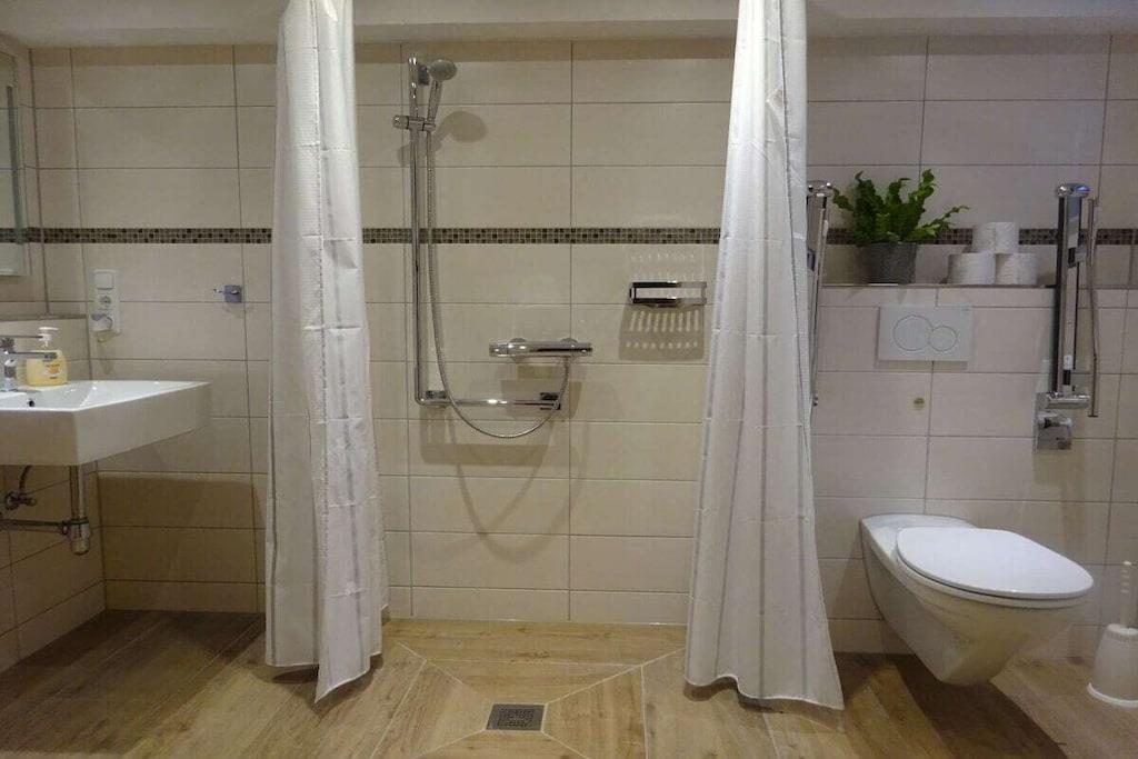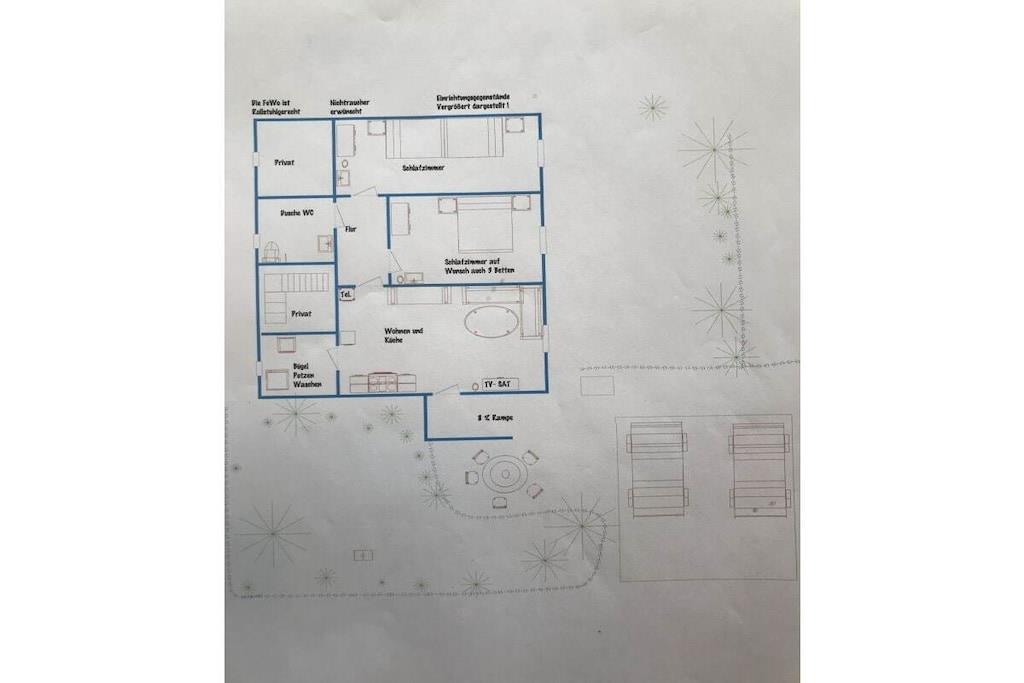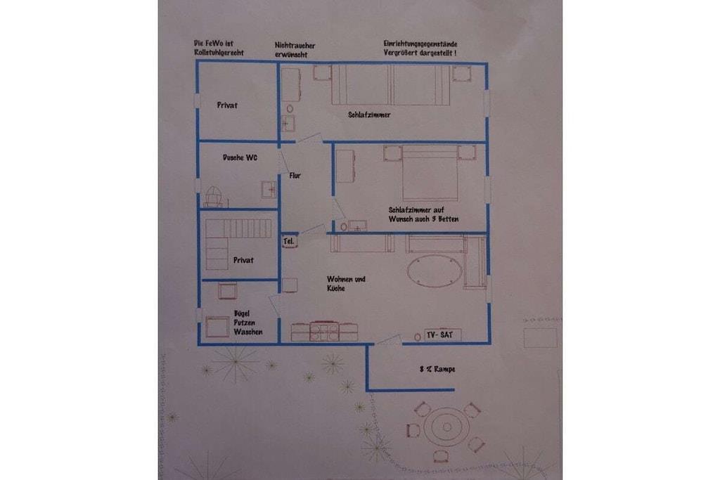 Die FeWo hat 90 qm. Sie kommen direkt in den Wohnraum mit Küchenzeile, (ca.32 qm) großer Eckbank mit Jokl - Tisch ( verschiebbare Holzplatte ), neuer Boxspring-Couch, großzügigem Sat-Flachbildschirm, Tel.+ gratis WLAN. Die Küchenzeile ist wirklich komplett. Die ideale Familienwohnung. In jedem Schlafzimmer ein kl. Waschbecken. Ein Bett 2x2 m mit Komfort - Lattenrost und 2 Einzel je 1x2m. Ein TV auch im Zimmer. Das bodengleiche Duschbad ( 12 qm ) hat eine ganzjährige Fußbodenheizung. ( Photovoltaik ) Viel Platz für 4-5 Personen, moderne Blumen-Terrasse, kleine Liegewiese und großzügiger Parkplatz für mind. 2 PKW direkt an Ihrer FeWo.