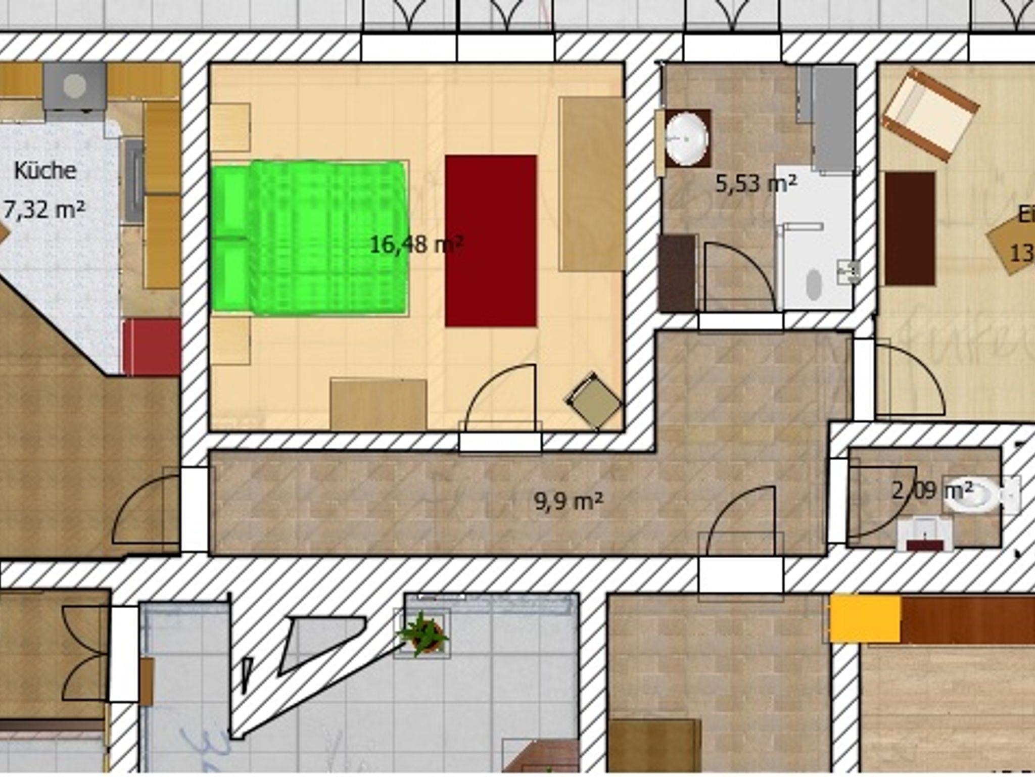 Unsere Erdgeschoss-Ferienwohnung misst 77m², verfügt über zwei separate Schlafzimmer mit einem Doppelbett und einem Einzelbett. Außerdem erwartet sie eine voll ausgestattete Wohnküche mit Kabel-/Sat-TV und einem gemütlichen Essbereich. Das Bad mit WC ist mit Hygieneartikel ausgestattet und geräumig. Ein kleiner Flur bietet zudem Raum und auf dem geräumigen Balkon genießen Sie herrlichen Berg- und Panoramablick. Sie ist groß und hell und eignet sich für maximal vier Personen.