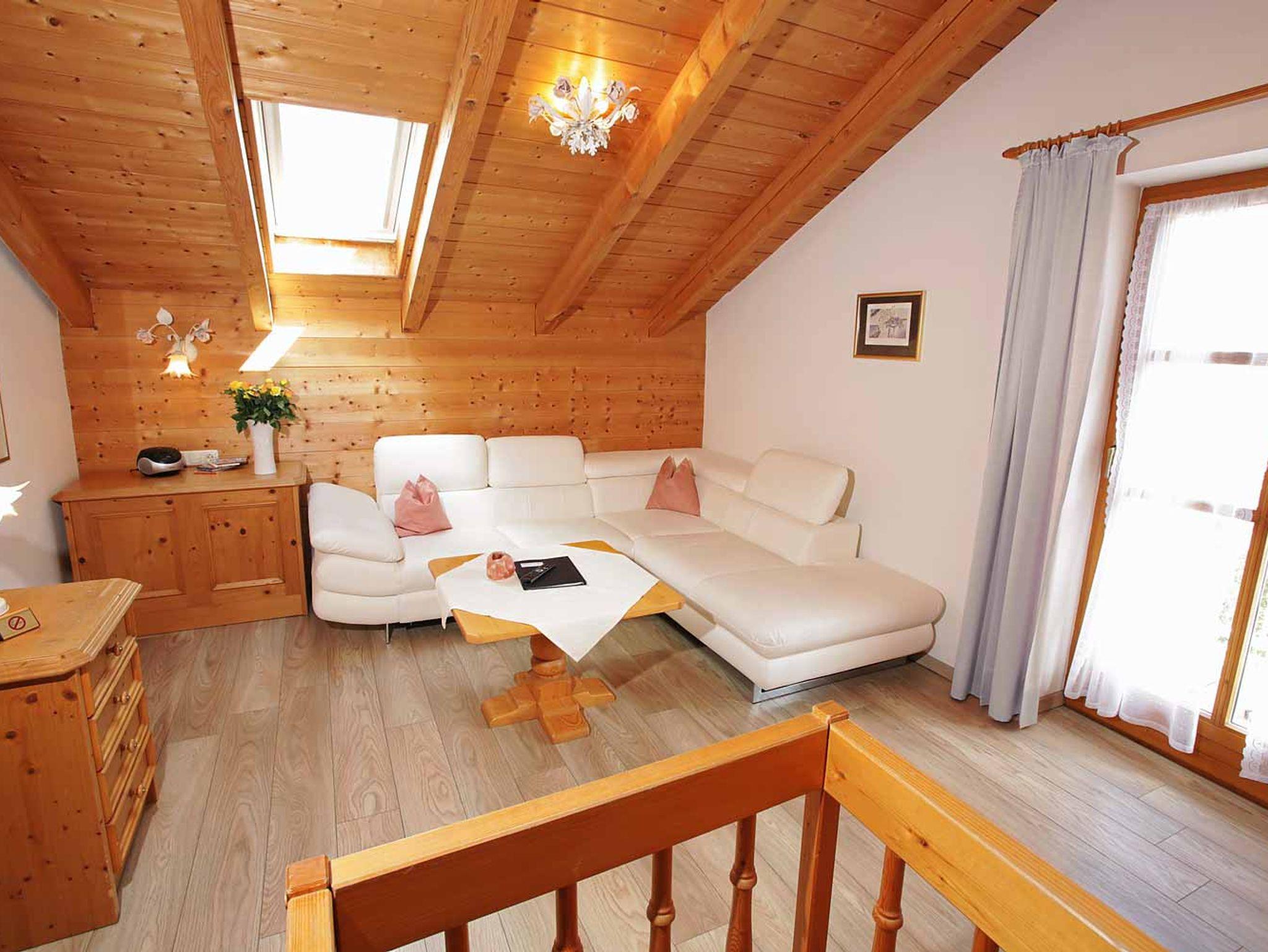 Das Apartment hat zwei Etagen. Über eine Wendeltreppe gelangen Sie ins Erdgeschoss in die Küche. Diese verfügt über ein Cerankochfeld und eine Mikrowelle. Kaffeemaschine und Wasserkocher stehen ebenfalls zur Verfügung, sowie Geschirr, Kochtöpfe und Kochtücher. Außerdem befindet sich hier eine gemütliche Eckbank-Sitzgruppe mit Esstisch. Direkt vom Erdgeschoss aus, gelangen Sie auf die eigene Terrasse mit herrlichem Ausblick auf die Berge. Im 1.Stock befindet sich das Bad, Schlafzimmer und das Wohnzimmer. Dieses besitzt einen großformatigen Flachbildfernseher, sowie einer großen Couch-Sitzgruppe mit integrierter Ausziehcouch. Das geräumige Badezimmer verfügt über eine große, begebahre Dusche, WC, und doppeltem Waschbecken. Dusch-und Handtücher werden gestellt. Die Wohnung besitzt zwei Eingangstüren, eine im 1.Stock und die zweite im Erdgeschoss über die Terrasse.