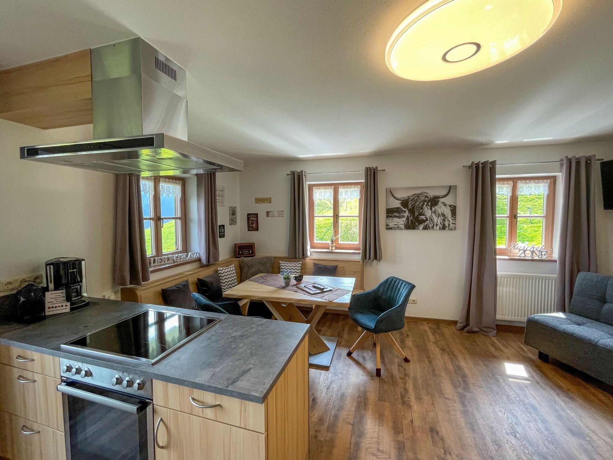 Neu renoviert und umgestaltet in 2022: Die Ferienwohnung Zum 7. Himmel lädt Sie ein für erholsame Tage zu zweit. Vom Balkon haben Sie einen wunderbaren Ausblick auf den Untersberg, Hochstaufen und Zwiesel.Diese besondere Ferienwohnung befindet sich in der ersten Etage unseres Hauses.Eine Wohnküche mit moderner Kücheneinrichtung (Geschirrspüler, Herd mit Ceranfläche und Backrohr, Mikrowelle, Kaffeeautomat, Kühl-Gefrierkombination, Nespresso-Kaffeemaschine), Eckbank, Sitzecke, TV und Radio steht für Sie bereit. Ebenso ein Schlafzimmer mit Doppelbett und ein modernes Duschbad.Vom Balkon genießen Sie eine traumhafte Aussicht.