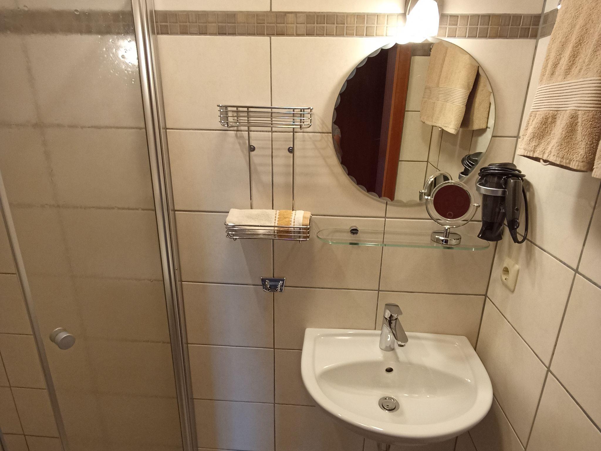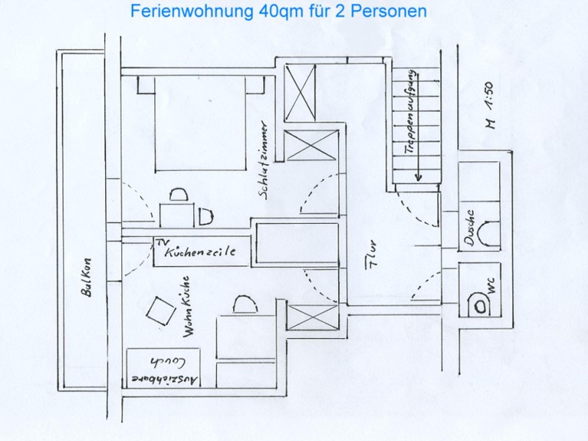 Die 40qm Nichtraucher Ferienwohnung liegt im 2. Stock unseres Landhauses und verfügt über 1 Schlafzimmer mit Doppelbett (180x200) sowie einen Wohnraum mit Eßecke und ausziebarer Couch. Die Couch kann bei Bedarf aufgebettet werden (130x190). Die Küchenzeile beinhaltet einen 2-Plattenherd, Mikrowelle mit Heißluftofen, Kaffeemaschine, Kühlschrank und ausreichend Geschirr. Die Erstausstattung der Bettwäsche, Hand- und Duschtücher und sämtliche Nebenkosten sowie eine Garage sind inklusive. Der Balkon ist mit Gartenmöbeln bestuhlt, Liegen für die Liegewiese stehen zur Verfügung und für Kinder gibt es Schaukeln im Garten. Es besteht auch eine Grillmöglichkeit. Wir bieten einen Brötchenservice und einen Einkaufsservice vor Anreise.