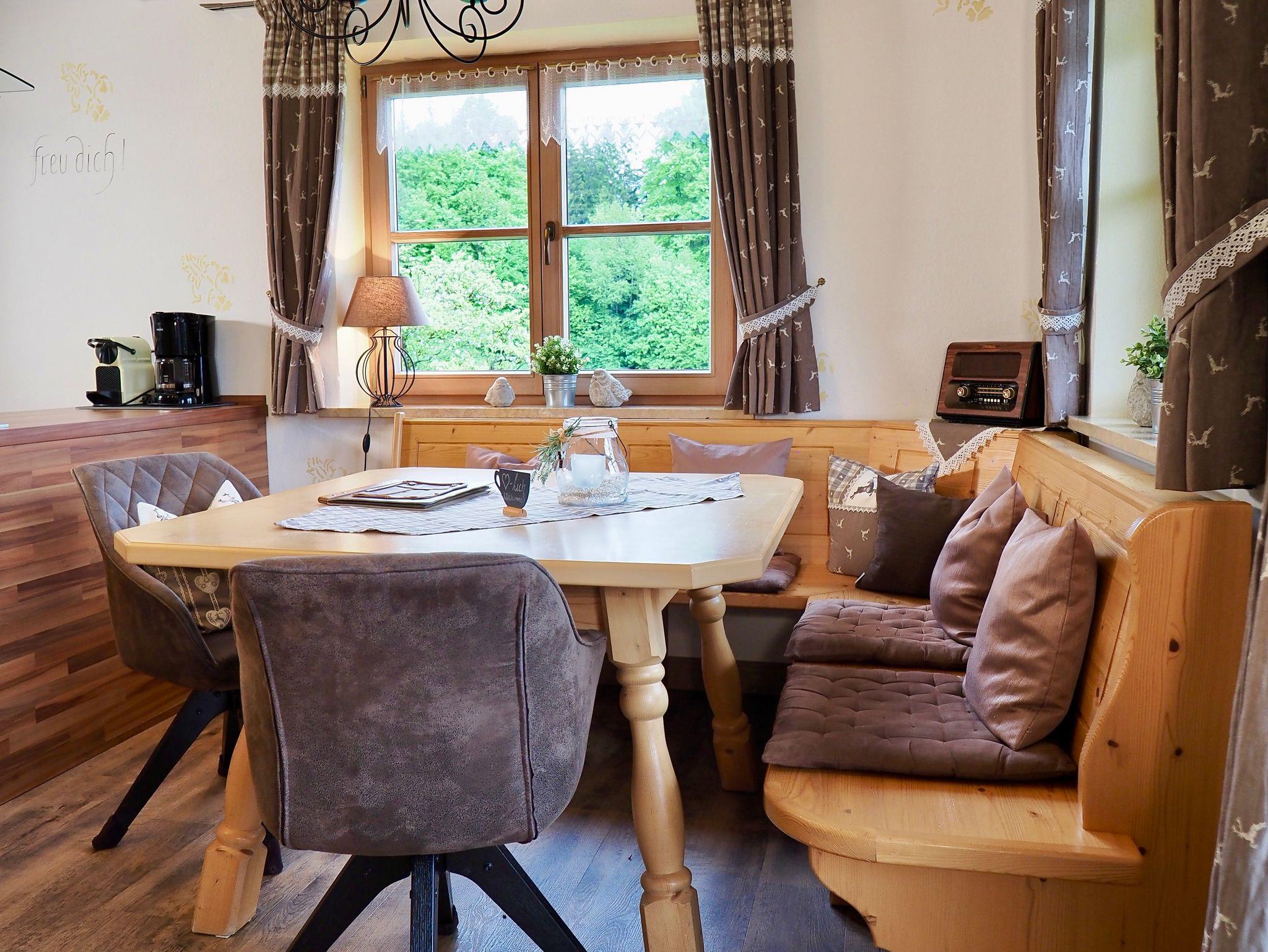 Neu renoviert in 2022: Die Ferienwohnung Panorama-Eckerl bietet eine grandiose Aussicht auf den Hochstaufen, den Untersberg, den Högl und je nach Wetterlage weit nach Österreich hinein.Die sehr geschmackvoll eingerichtete Ferienwohnung befindet sich in der ersten Etage unseres Hauses.Eine Wohnküche mit moderner Kücheneinrichtung (Geschirrspüler, Herd mit Ceranfläche und Backrohr, Mikrowelle, Kaffeeautomat, Kühl-Gefrierkombination, Nespresso-Kaffeemaschine), Eckbank, Sitzecke, TV und Radio steht für Sie bereit. Ebenso ein Schlafzimmer mit Doppelbett und ein modernes Duschbad. Vom Balkon genießen Sie eine traumhafte Aussicht.