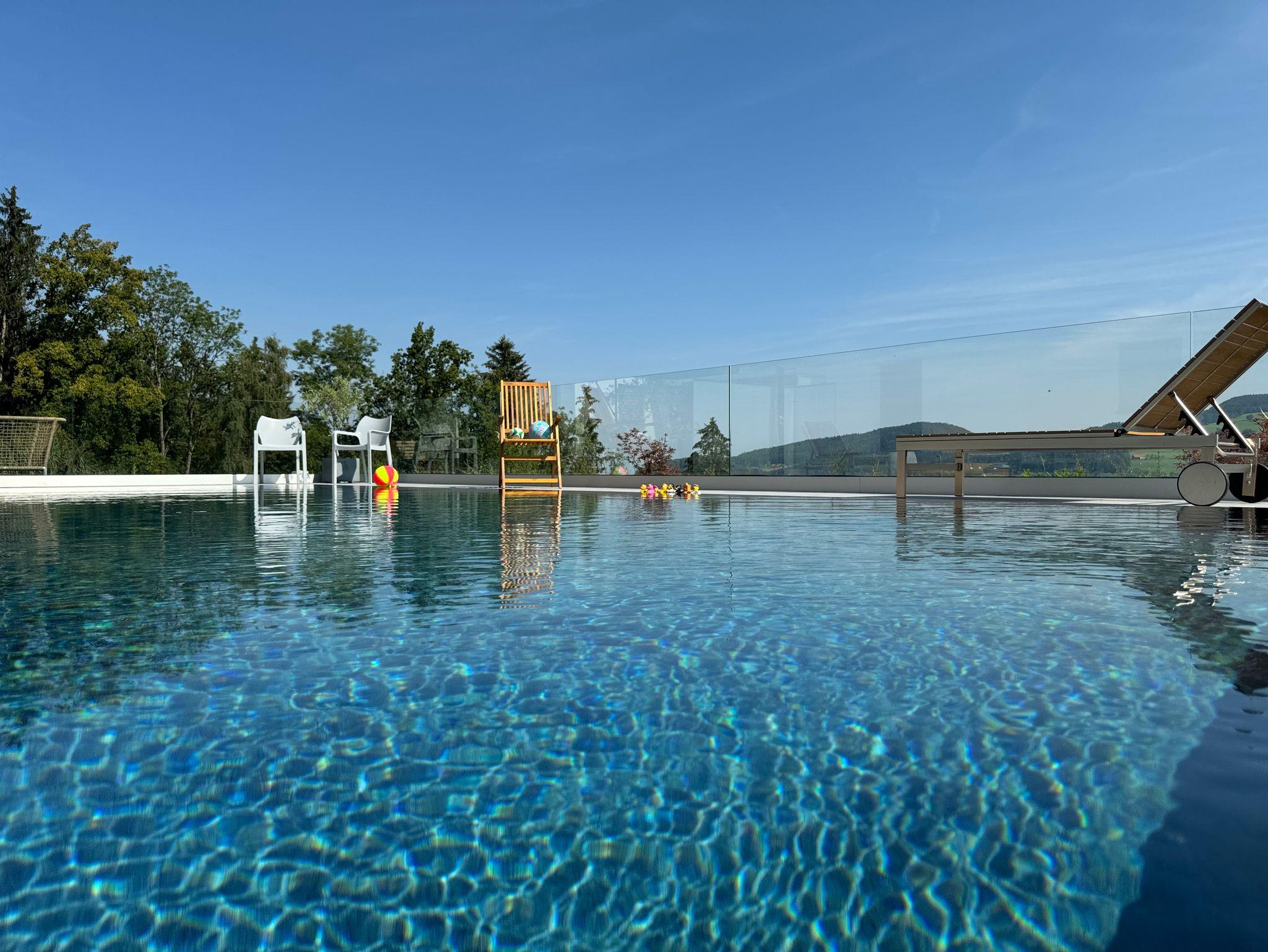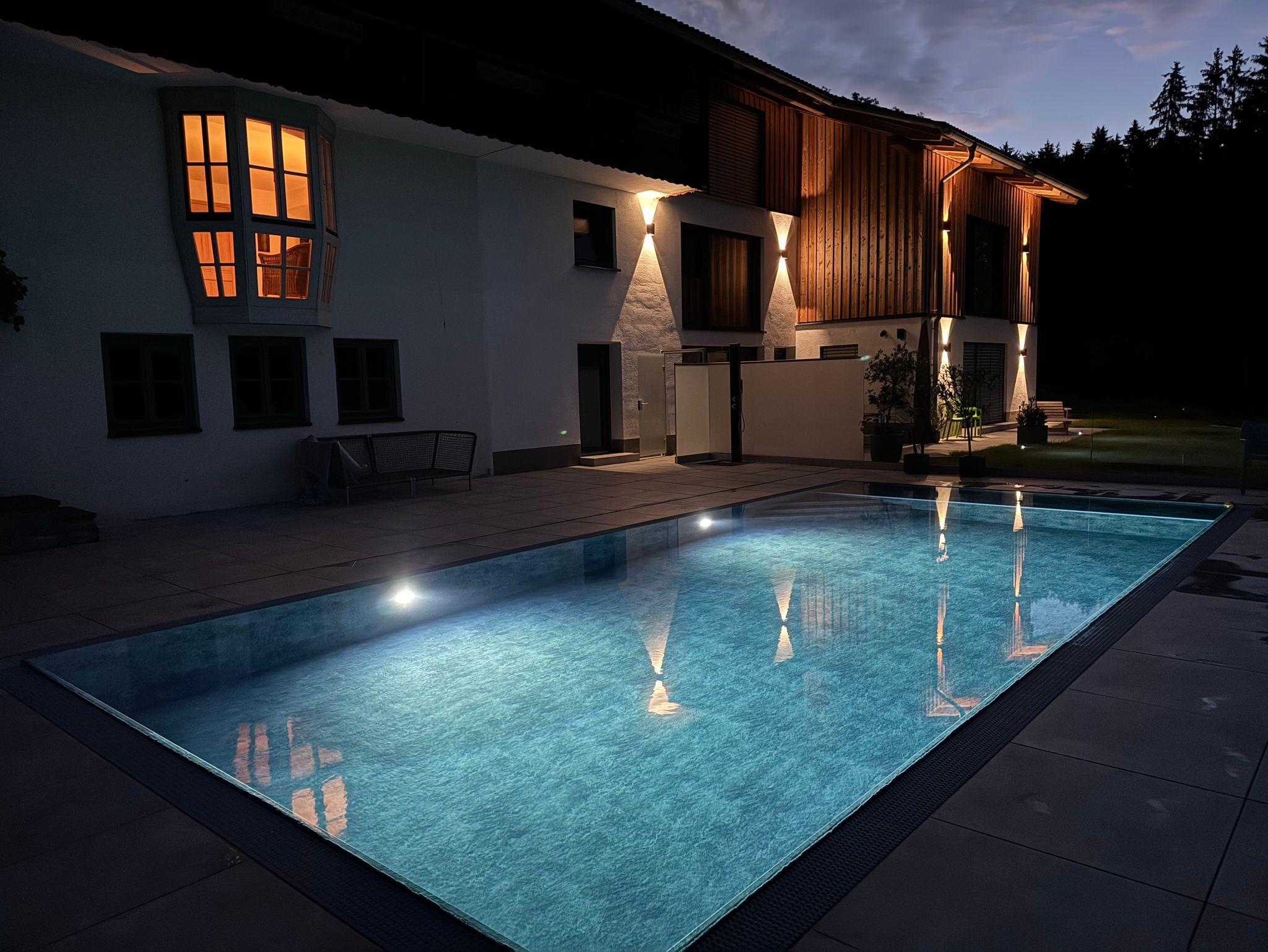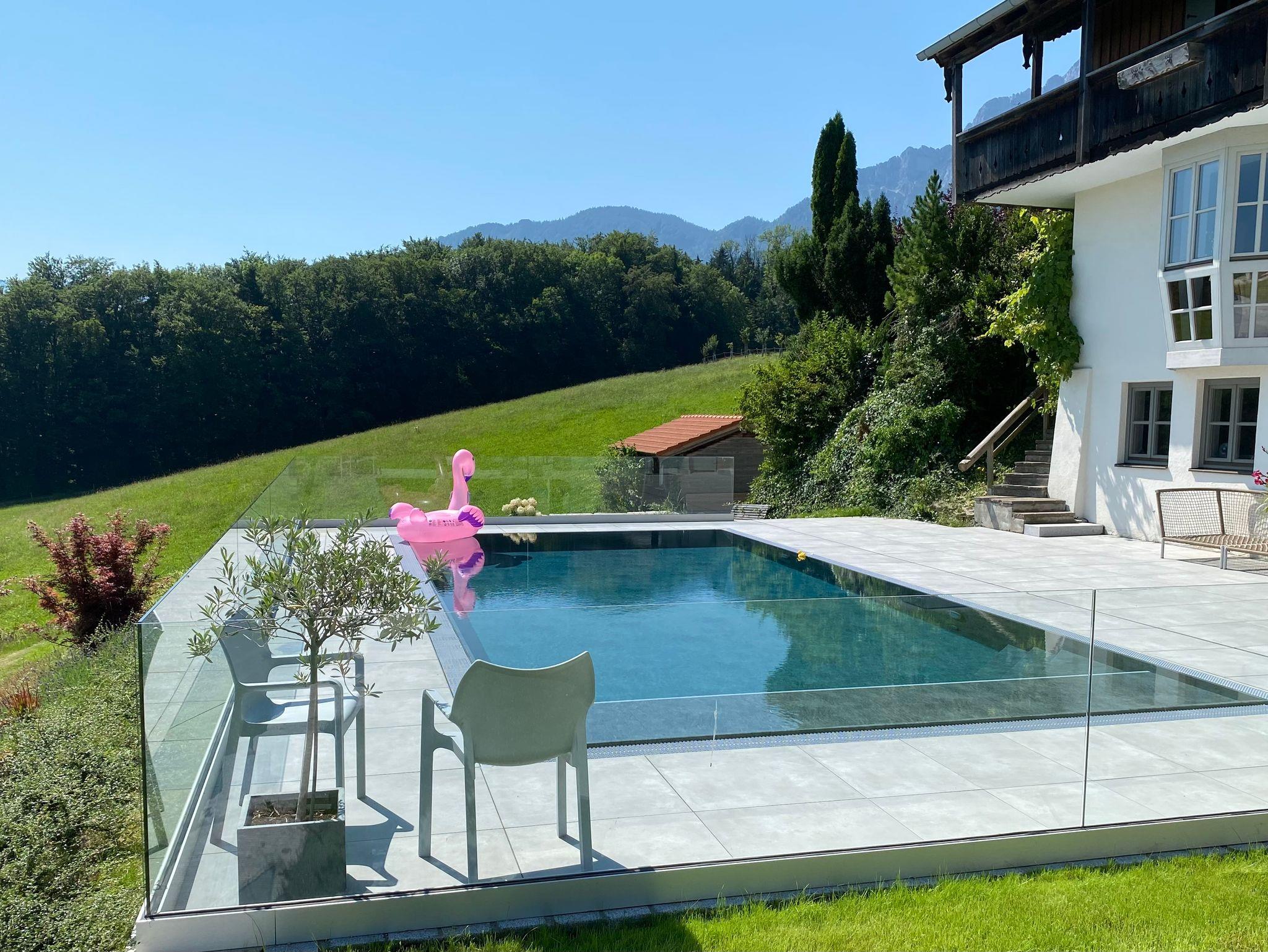 Das Highlight im Außenbereich: Ein großzügiger, beheizter Salzwasser-Pool, der sanft zur Haut ist und zum Abtauchen einlädt. Während Sie entspannen, schweift Ihr Blick über das umliegende Bergpanorama, das zu jeder Jahreszeit verzaubert. Genießen Sie modernen Komfort, absolute Privatsphäre und das Gefühl, angekommen zu sein. Die Top-Lage ist ideal für Ausflüge nach Salzburg, zum Königsee, Salzbergwerk Berchtesgaden, Hans-Peter Porsche Traumwerk, dem Chiemsee und vielem mehr.