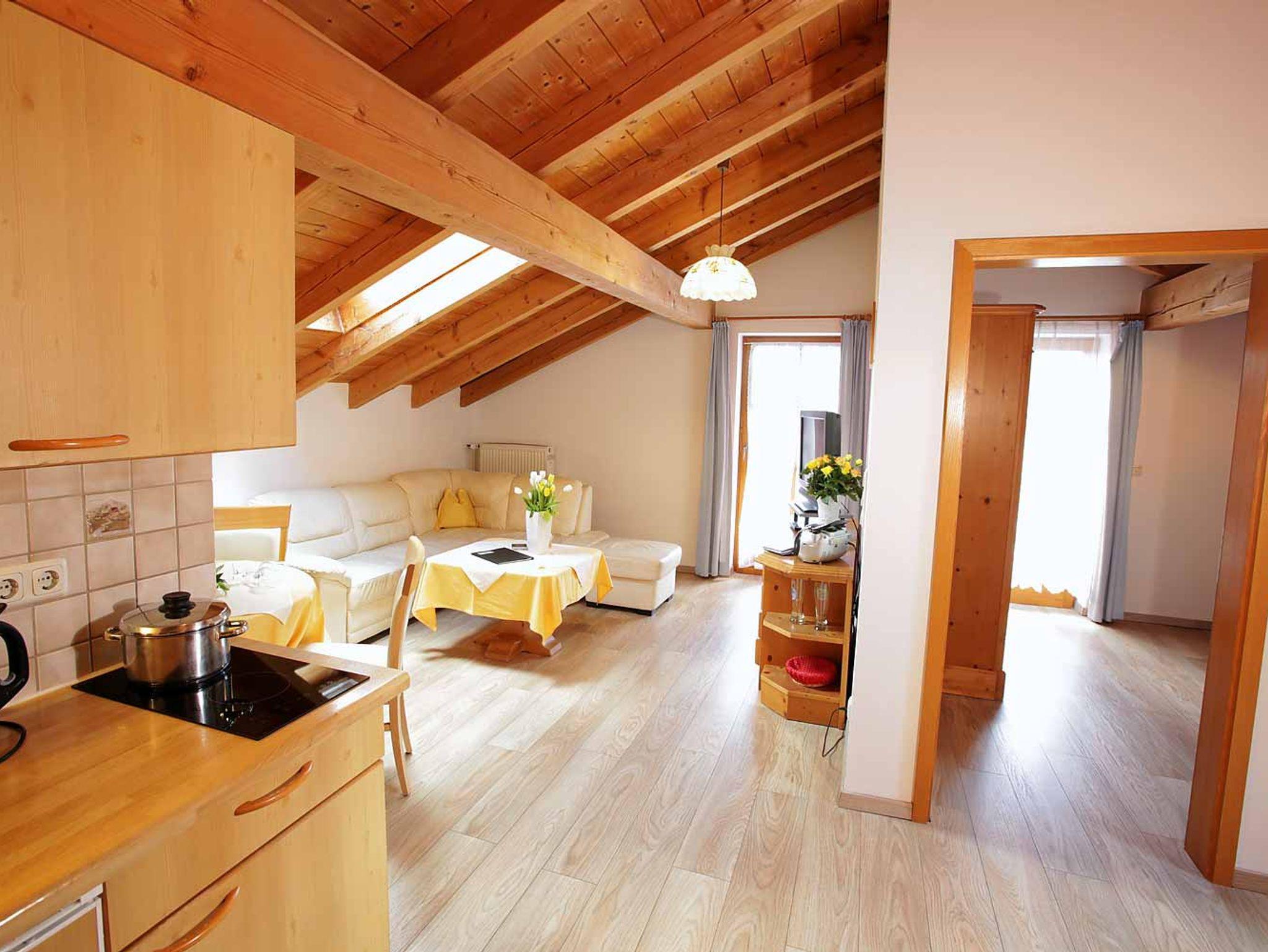 Wohnung mit Balkon oder Terrasse, herrlichem Bergblick, Wohnzimmer mit großem Flachbildschirmfernseher, geräumiges Bad mit Dusche & WC, Küchenzeile mit Cerankochfeld, Kaffeemaschine und Mikrowelle, Sitzgruppe mit Esstisch,großer Couch-Sitzgruppe und einem separaten Schlafzimmer mit Doppelbett. (Bettengröße 1,80 mal 2 Meter) Das Wohnzimmer hat ein Doppelbett in einem abgeteilten Bereich des Wohnzimmers / oder Wohnung mit Sichtdachstuhl, herrlichem Bergblick und Balkon, mit separatem Schlafzimmer und 2 getrennten Betten in einem abgeteilten Bereich des Wohnzimmers.