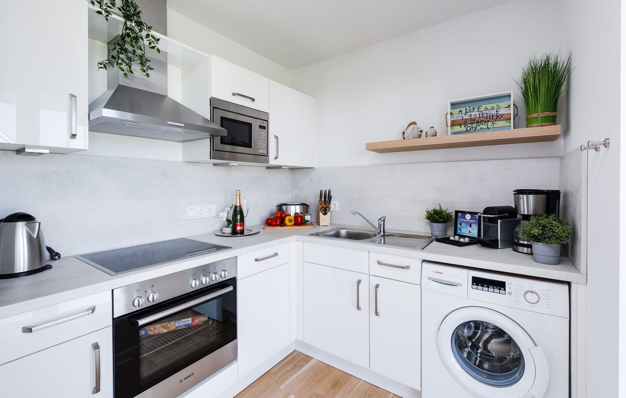 Im Urlaub ist Zeit für kreatives Kochen, die rundum ausgestattete Wohnküche lässt hierbei keine Wünsche offen und verfügt auch über Mikrowelle und Gefrierfach. Ein Elektrogrill steht für gesellige Abende auf der Terrasse bereit.