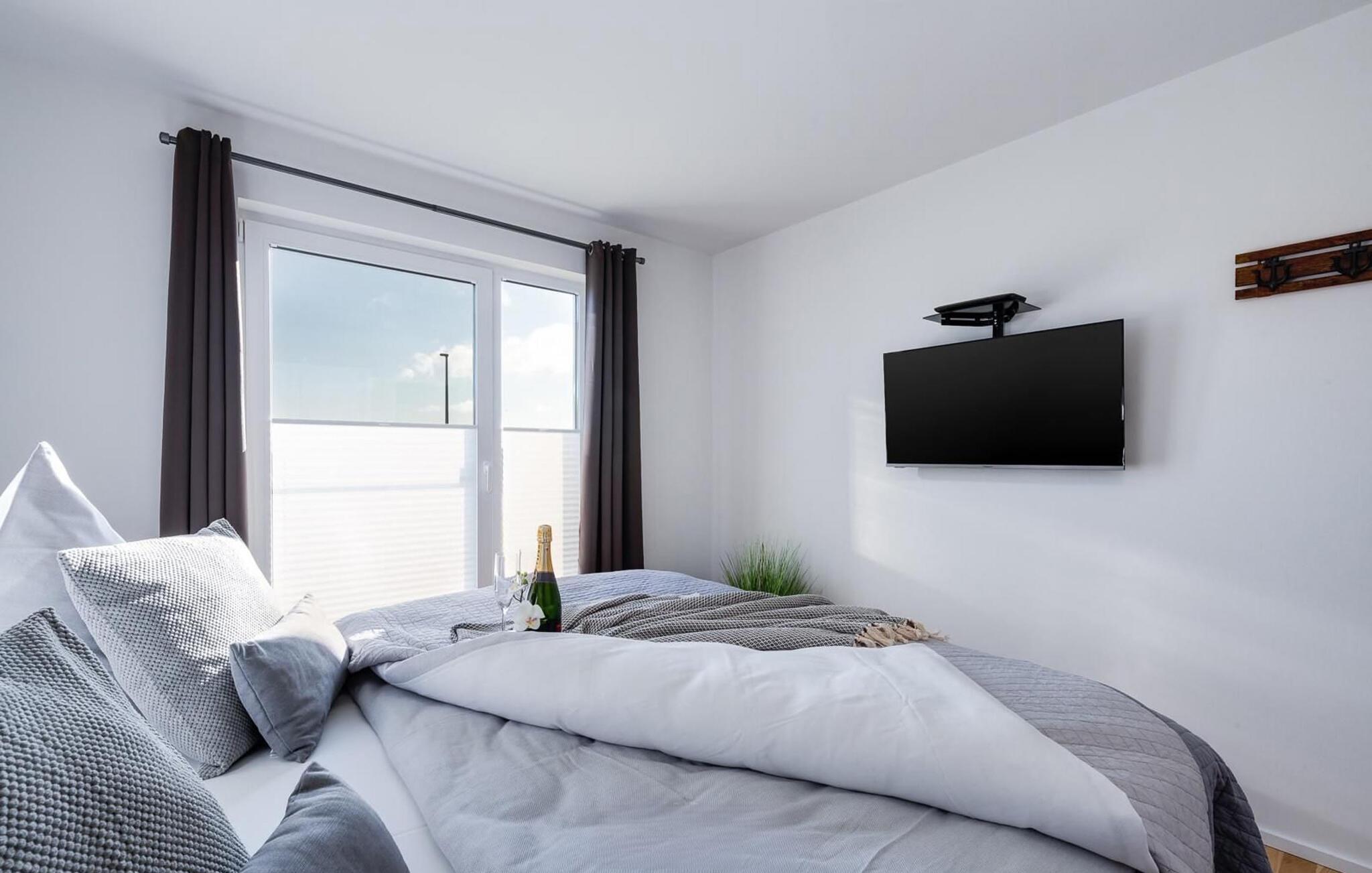 Die beiden verdunkelbaren Schlafzimmer mit Insektenschutz sind mit hochwertigen Boxspringbetten ausgestattet und verfügen über je einen weiteren Flatscreen-TV.