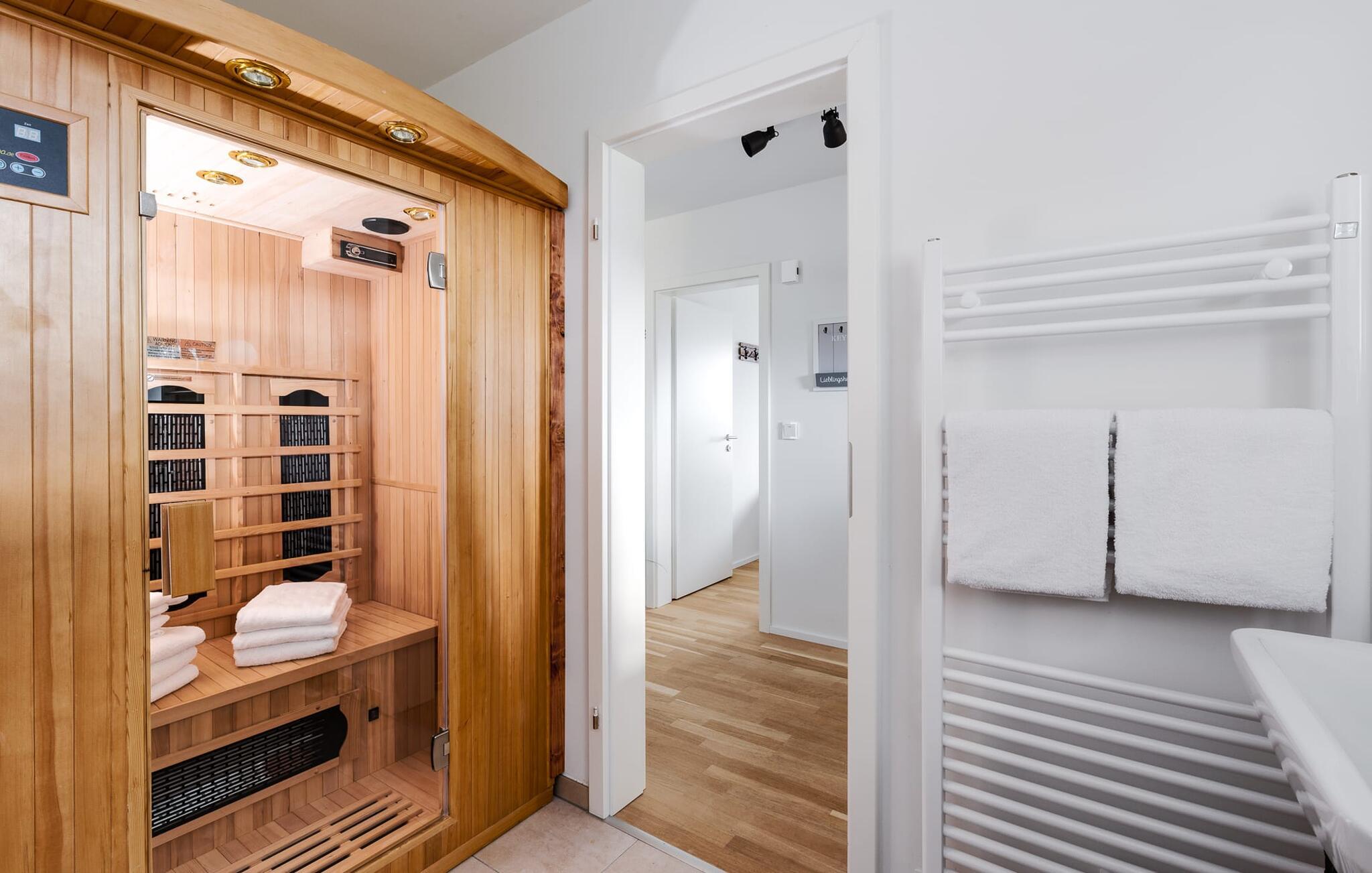 Wellness Liebhaber kommen ganz auf ihre Kosten. Infrarot Wärmekabine mit Hifi-Sound-System und LED-Farblichttherapie sowie eine Relax-Whirlwanne laden nach dem Strandspaziergang zum Entspannen ein. Fußbodenheizung und Kaminofen spenden Komfort zu jeder Jahreszeit.