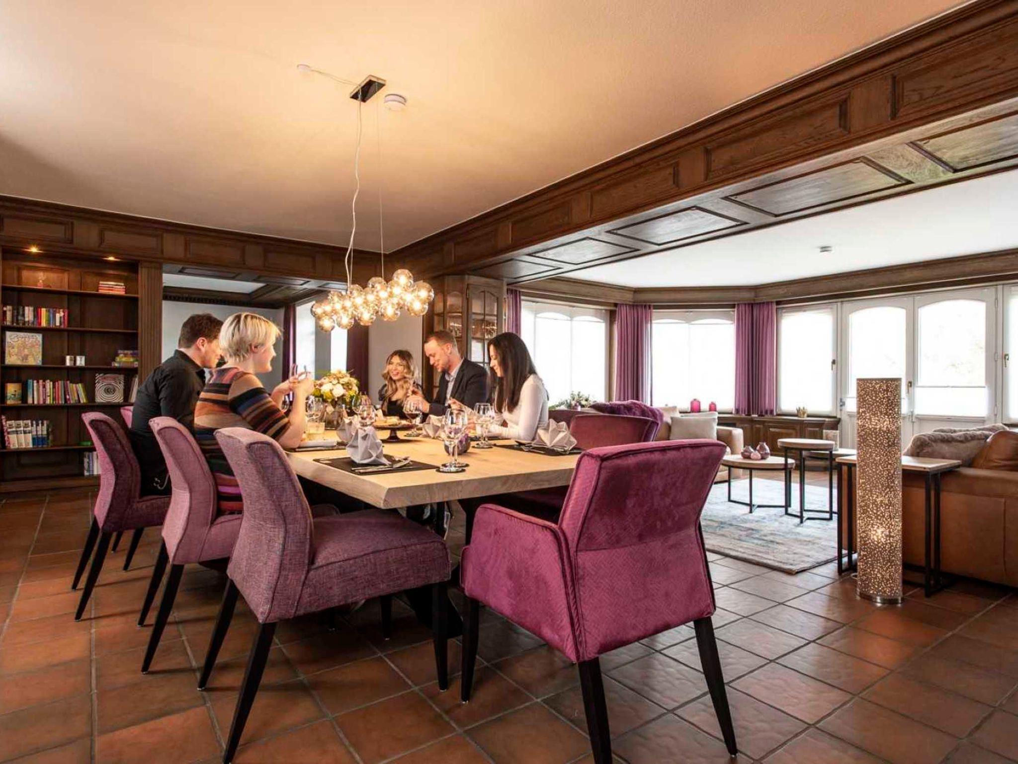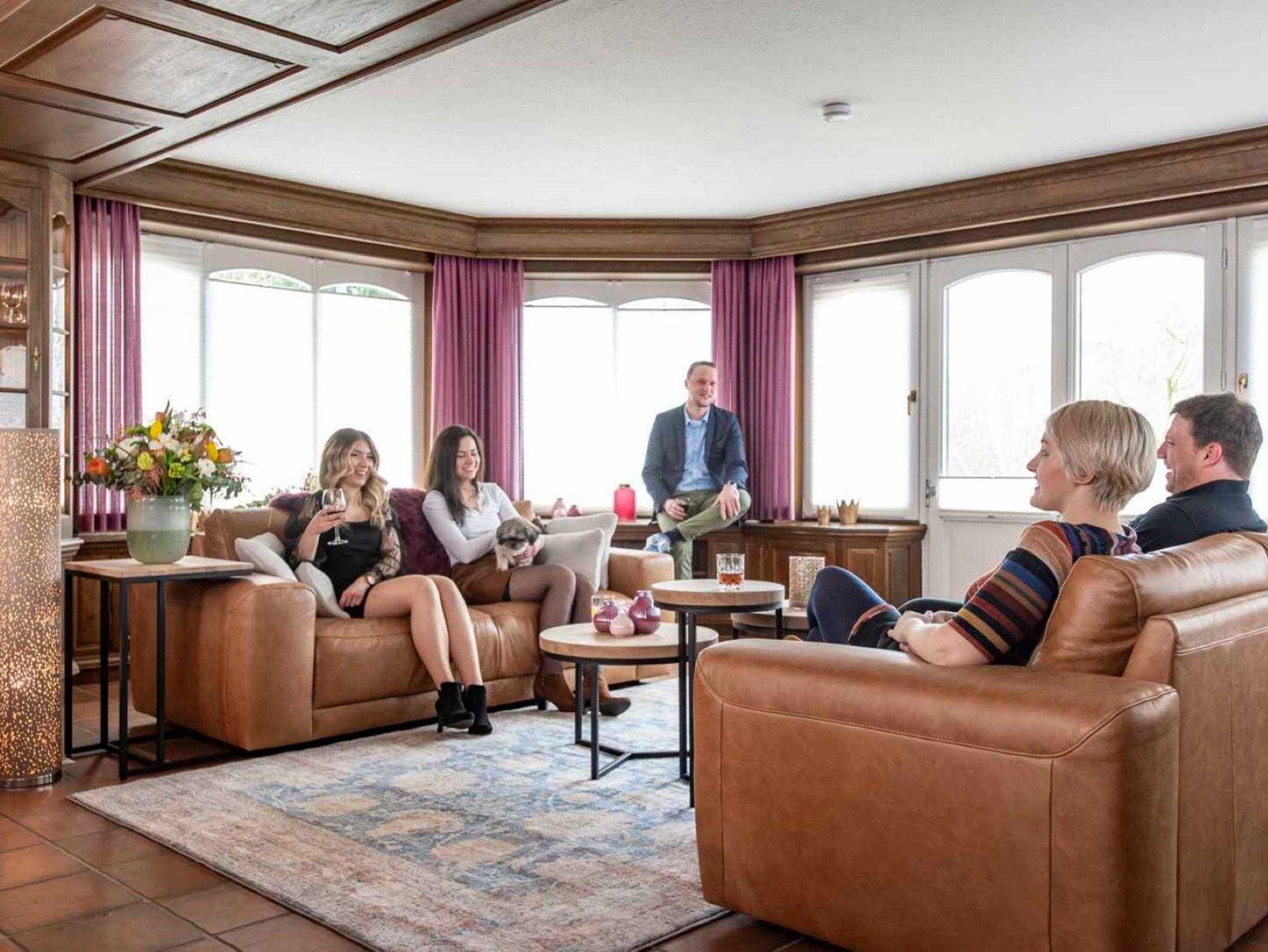 Dieser Eindruck wird verstärkt, wenn man durch die große Tür des Wohnzimmers tritt. Hier möchte man direkt einziehen! Ein stattlicher Esstisch mit sehr bequemen Sesseln, zwei gemütliche Ledersofas im Wintergarten und eine Fernseh-Ecke, die reichlich Möglichkeiten auch zum Lesen, Träumen und Entspannen bietet, geben jedem Gast das Gefühl, willkommen zu sein.