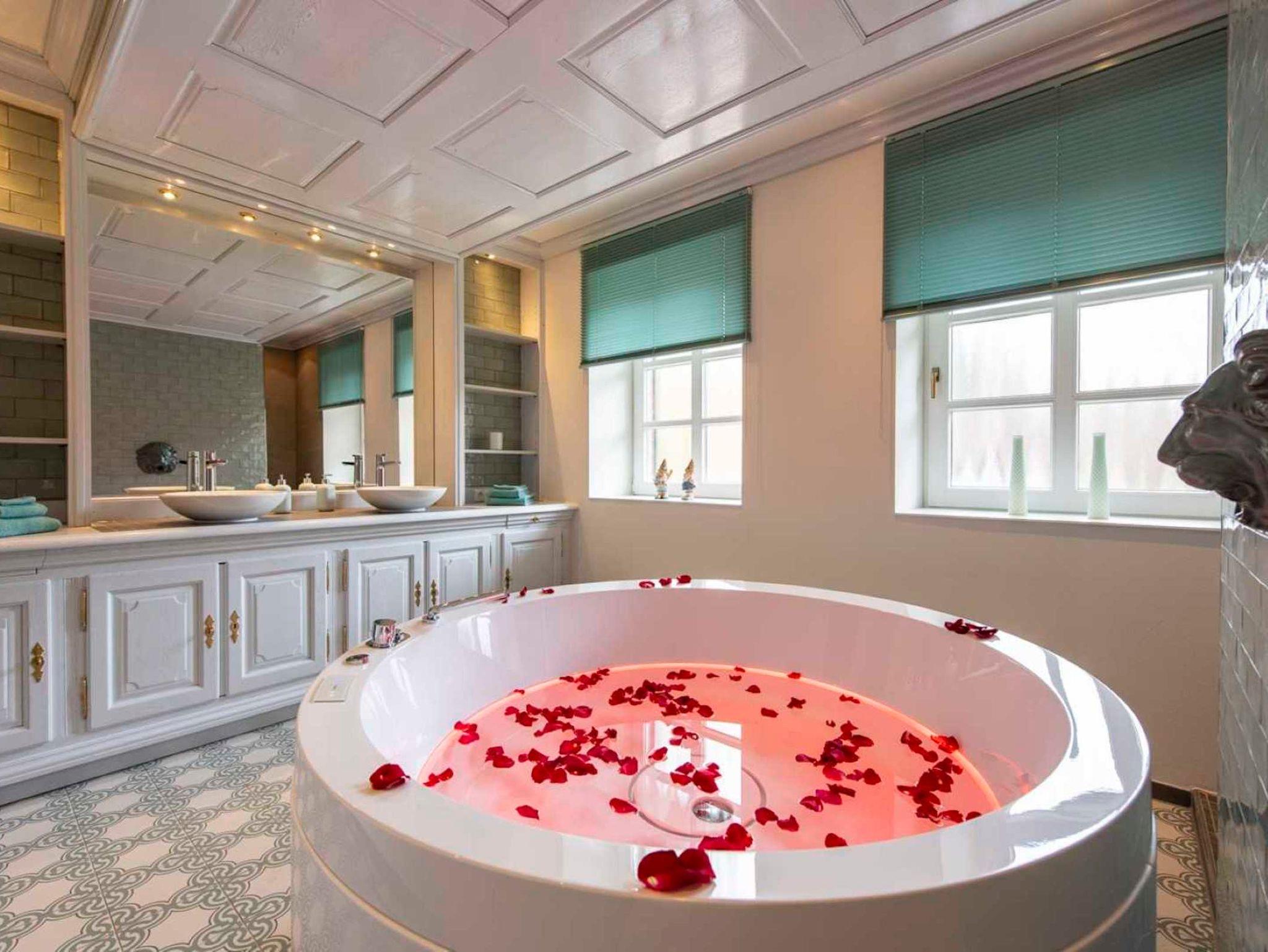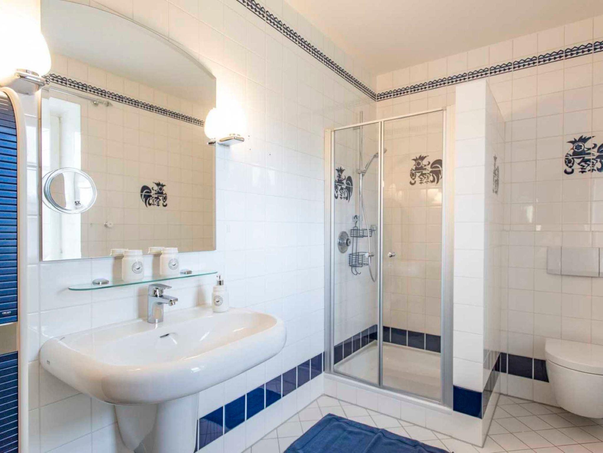 Zwei Zimmer teilen sich ein Badezimmer, welches mit Dusche und Badewanne ausgestattet ist. Jedes Zimmer verfügt über hochwertige Boxspringbetten. In zwei Zimmern steht zusätzlich eine Schlafcouch (160x200). Das Wohnzimmer verfügt ebenso über eine Schlafcouch, so dass Rollstuhlfahrer dieses Haus bequem nutzen können. Im Erdgeschoss befindet sich ein behindertengerechtes Badezimmer mit Dusche.