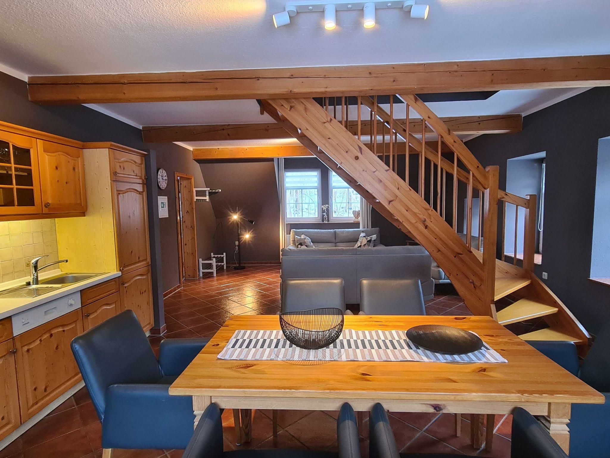 - Wohnebene: sehr großzügiger offener Wohn- und Aufentaltsbereich mit Küchenzeile komplett ausgestattet mit Spülmaschine, Kühlschrank, Wasserkocher, Kaffeemaschine, Toaster, großer Essbereich für 6 Personen, neue Leder-Couchgruppe, Flat-TV, neues Bad (2021)mit Dusche und WC, Kosmetikspiegel und Haarföhn