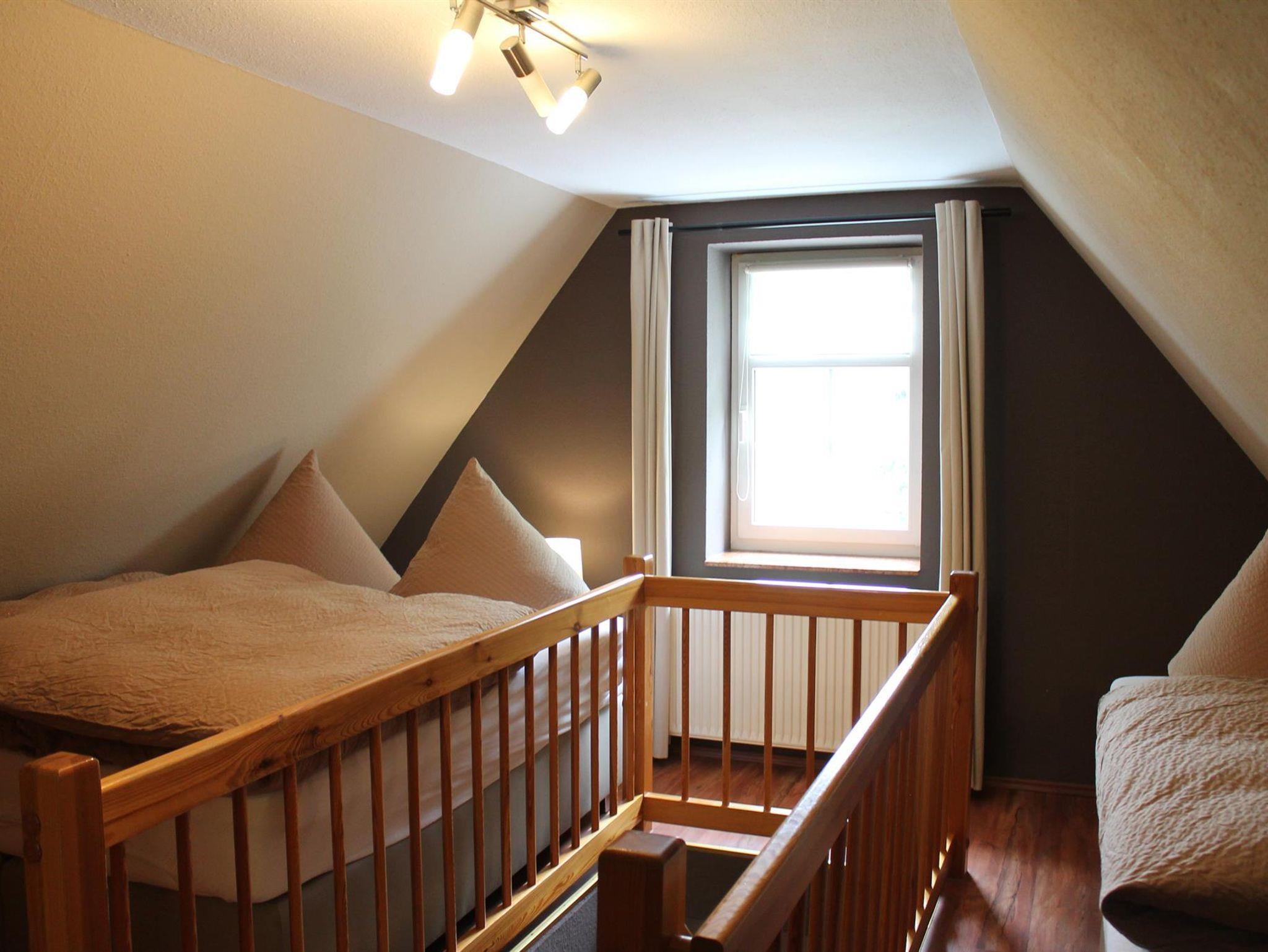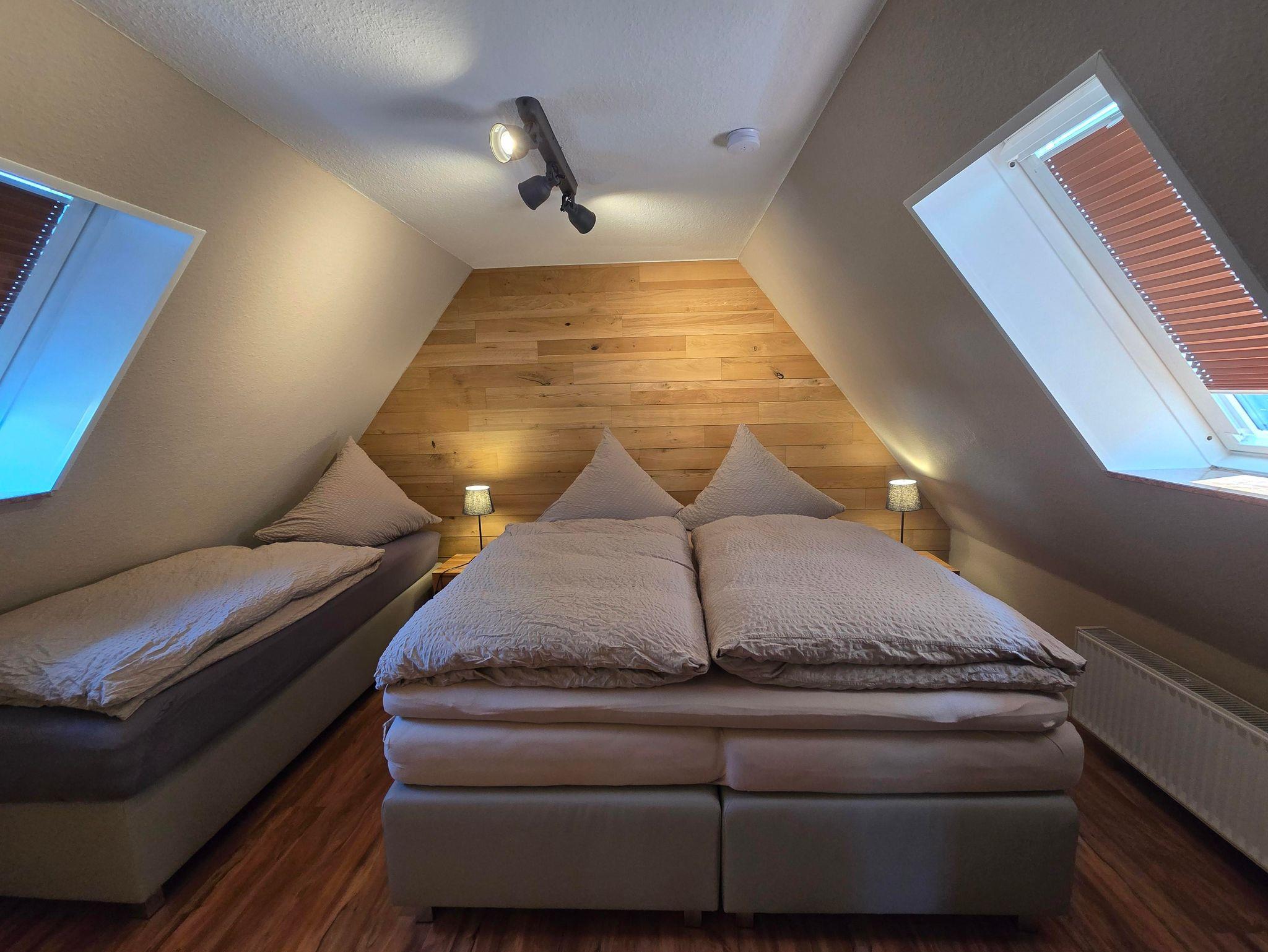 - Galerie: Treppe nach oben zum 1. Schlafbereich mit Doppel-Boxspringbett 1,60m x 2,00m und Einzel-Boxspringbett 2,00m x 0,90m, Einbauschrank, von hier aus schließt sich Schlafbereich 2 an mit Tür getrennt mit Doppel-Boxspringbett 2,00m x 1,80m und Einzel-Boxspringbett 2,00m x 0,90m, alle Oberbetten und Kopfkissen neu 2020 (3Kammer Kopfkissen und Oberbetten allergikergeeignet)