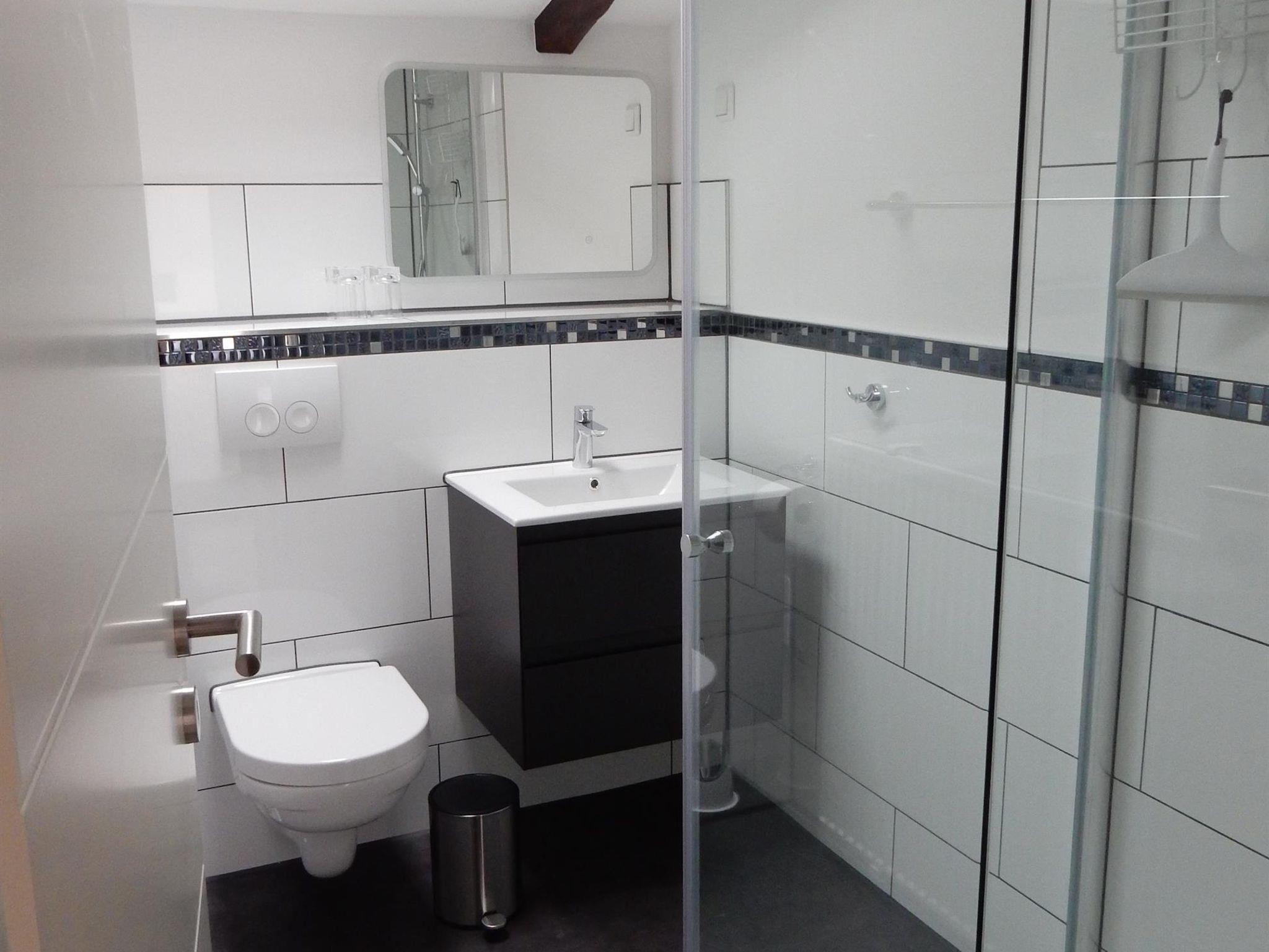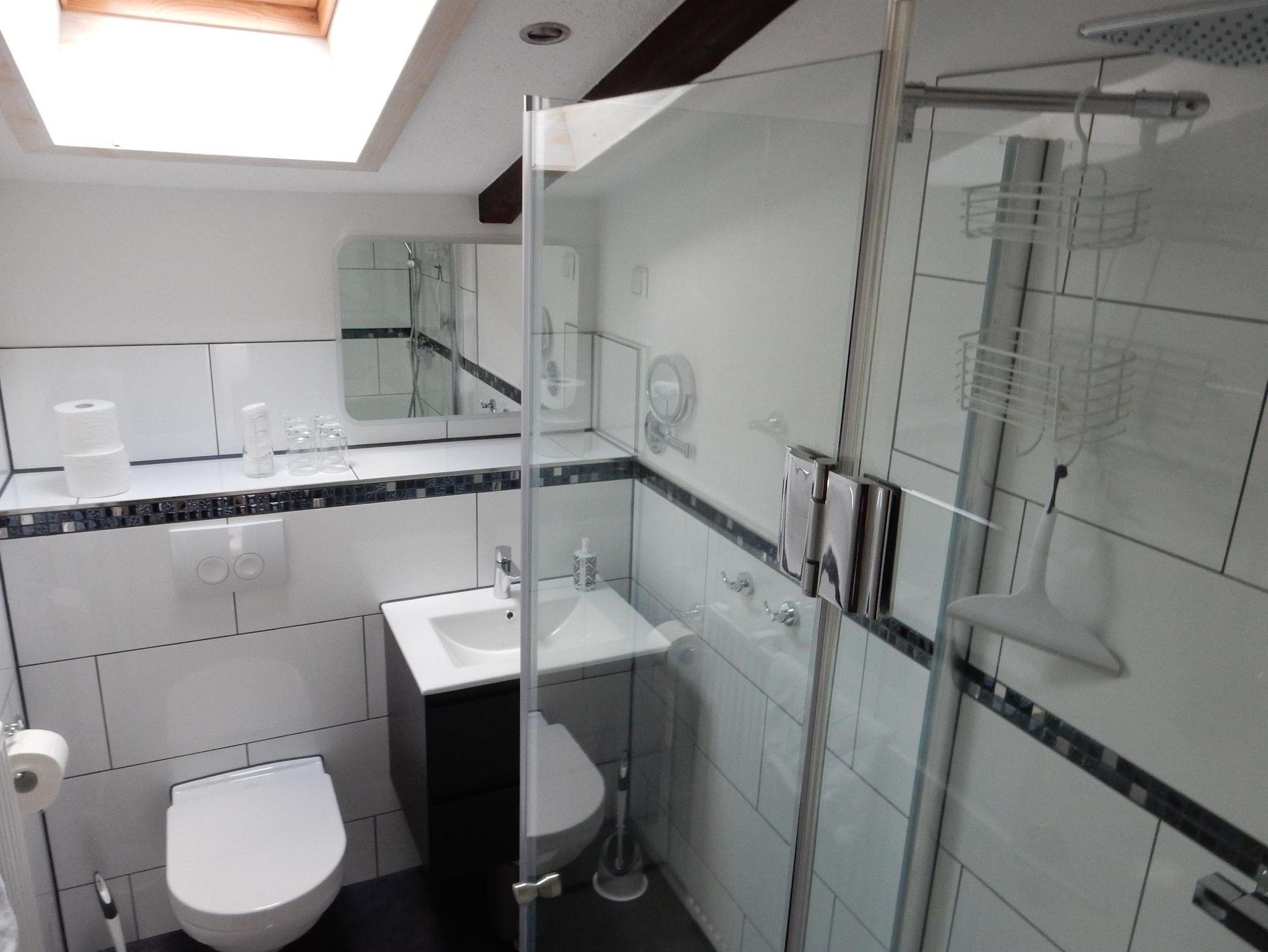 In unserem neuen Badezimmer steht Ihnen eine Dusche, Toilette, Kosmetikspiegel und ein Fön zur Verfügung, sowie frische Handtücher und Stauraum für kleinere Hygieneartikel.