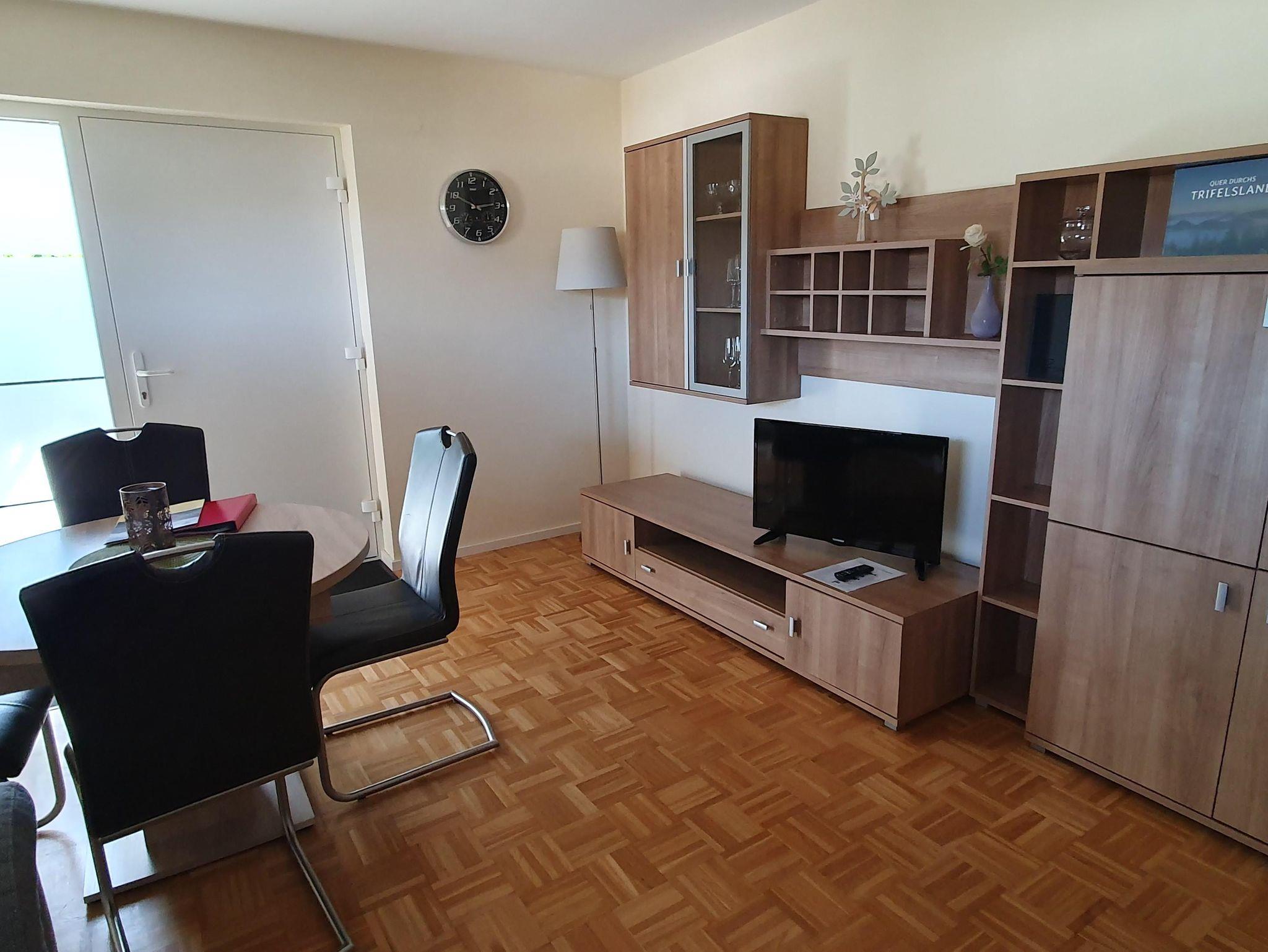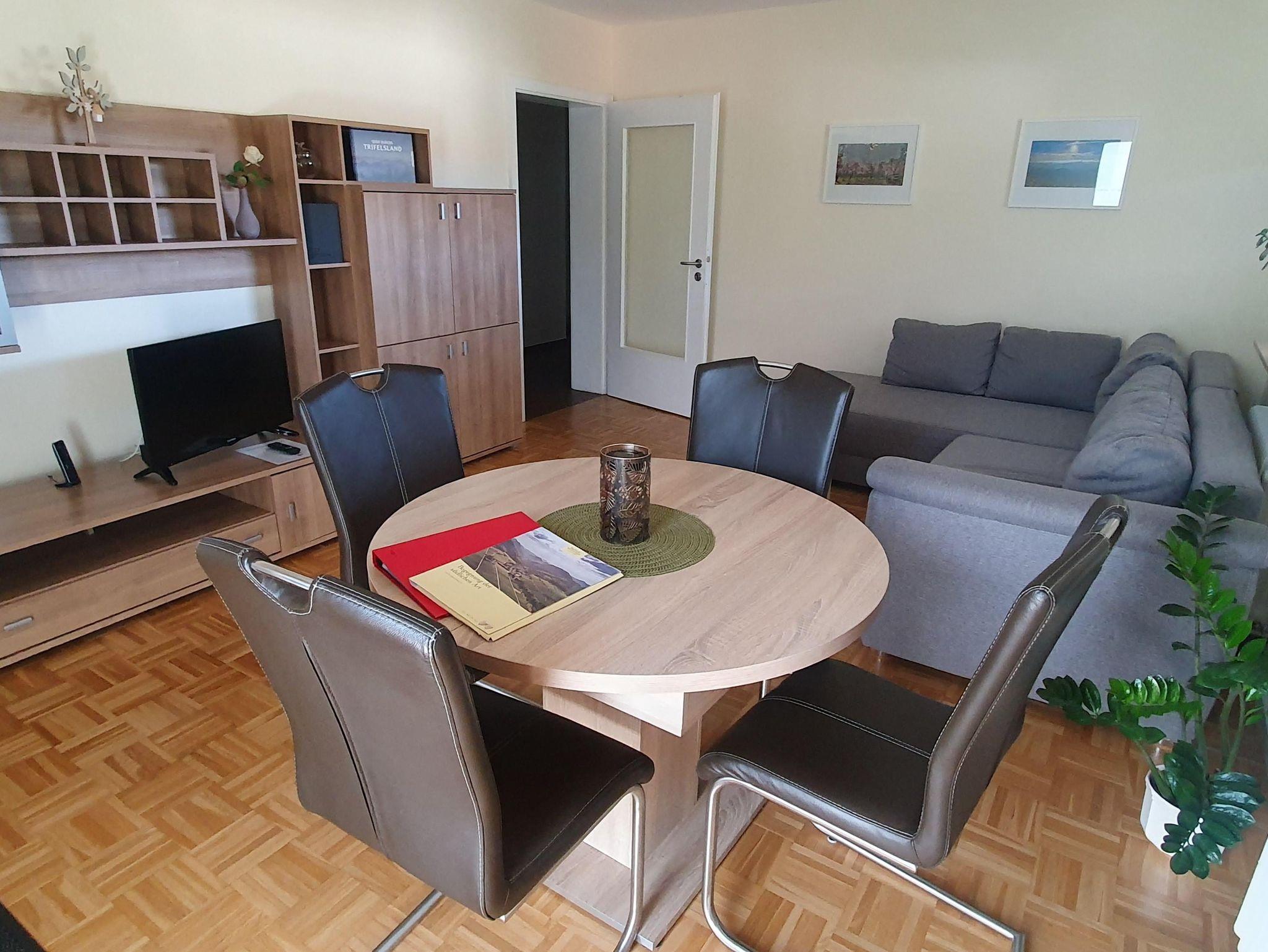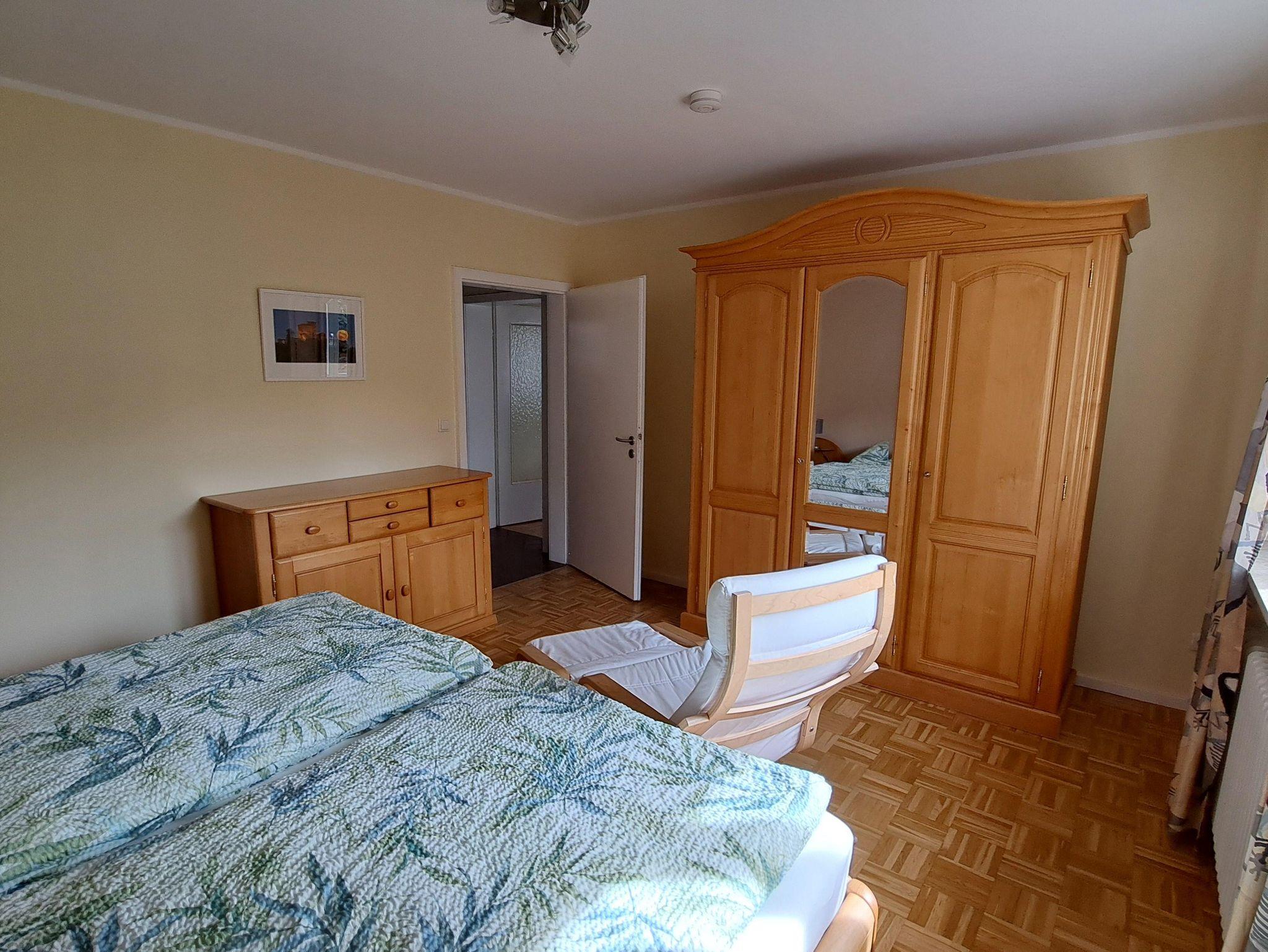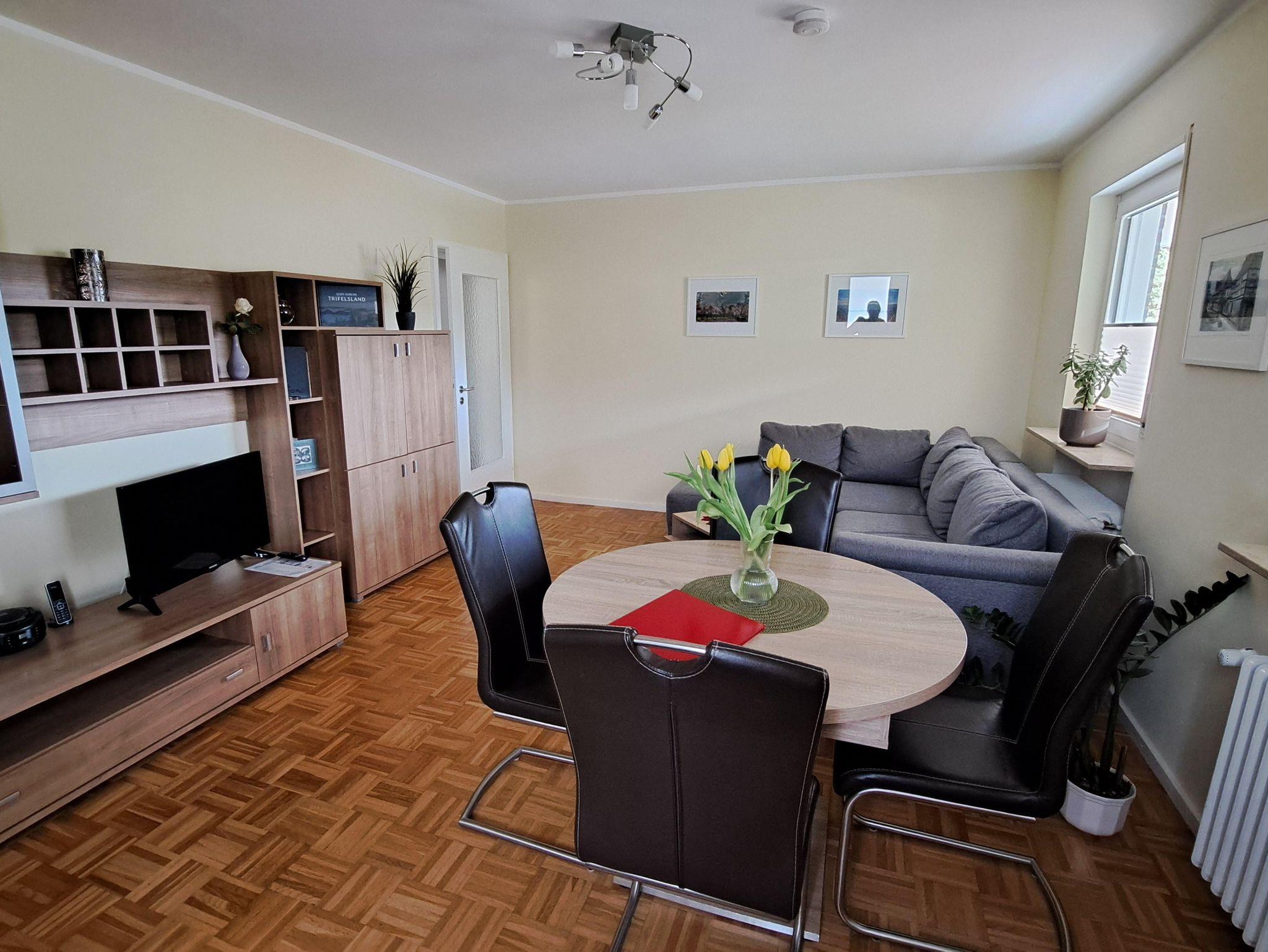 Unsere komfortable Ferienwohnung verfügt über eine komplett eingerichtete Küche, ein großes Schlafzimmer, ein modernes Badezimmer mit Badewanne, separater Dusche und Fußbodenheizung. Im Wohn-/Esszimmer befinden sich ein Full-HD-Fernseher inkl. Sat-Anschluss, eine Kompaktanlage (Radio, CD) sowie ein Telefon. Seit 2018 eine neue Schlafcouch im Wohnzimmer mit einer Liegefläche von 1,40 x 2,10 m.In der gesamten Wohnung haben Sie kostenfreien Zugang zum W-LAN. Auf Anfrage stellen wir gerne kostenlos Babybett und Hochstuhl bereit. Kinder bis 12 Jahre übernachten kostenfrei.
