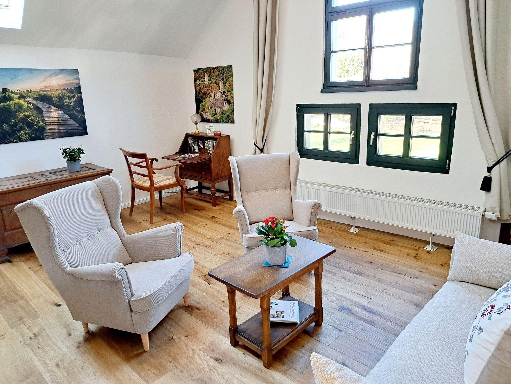 Auf dem Dachboden der ehemaligen Fachwerkscheune befinden sich heute zwei gemütliche Ferienwohnungen für 2 bis 3 Personen, während im angrenzenden Ferienhaus aus Naturstein auch größere Gruppen bis 9 Personen jede Menge Platz finden, um eine schöne gemeinsame Zeit zu erleben.