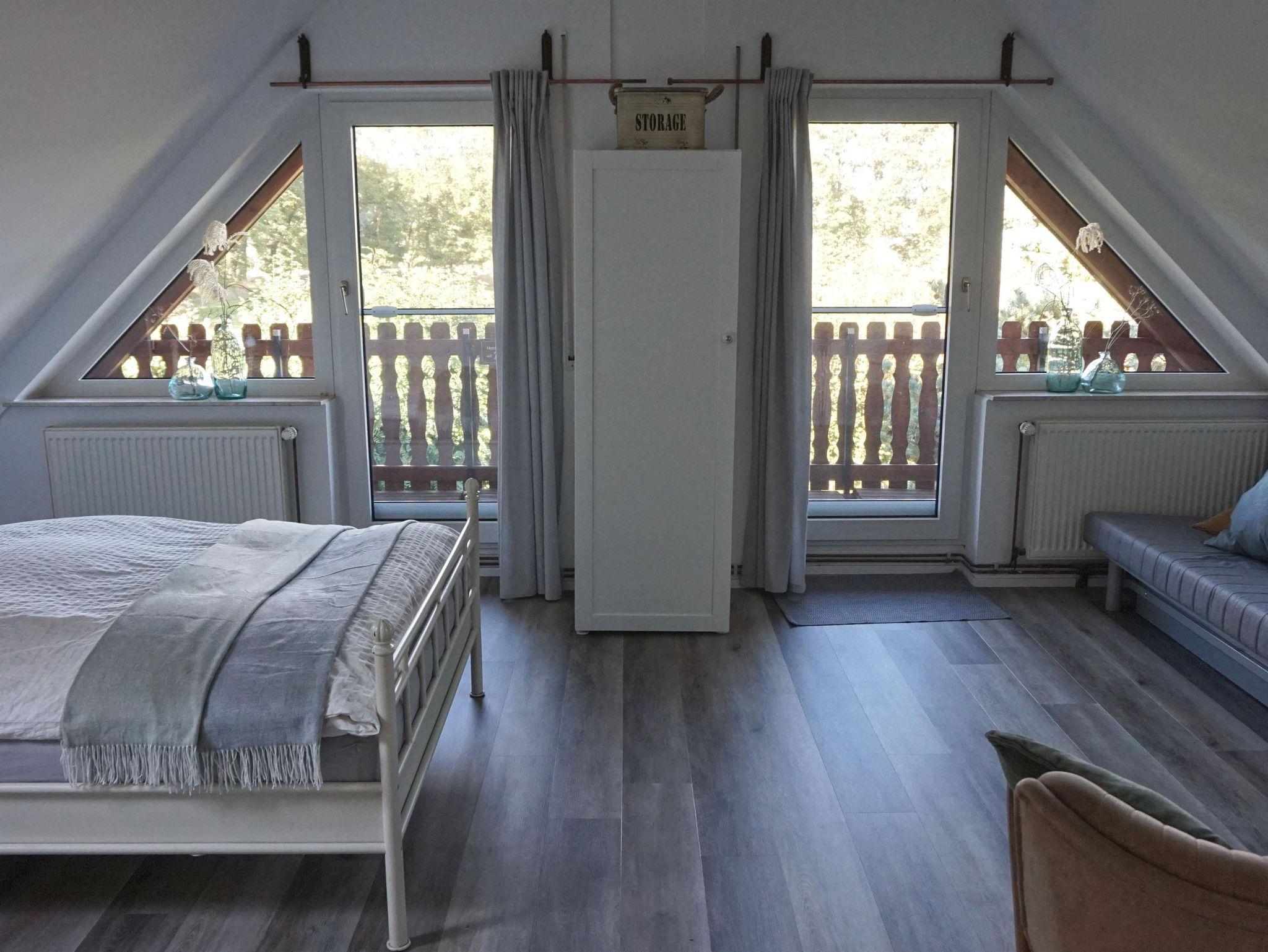 Im 1. Obergeschoss befindet sich ein geräumiger Schlafbereich mit zwei Betten (jeweils 1,40 m breit) mit eigenem Balkon. Bei Bedarf steht ein Babybett zur Verfügung.