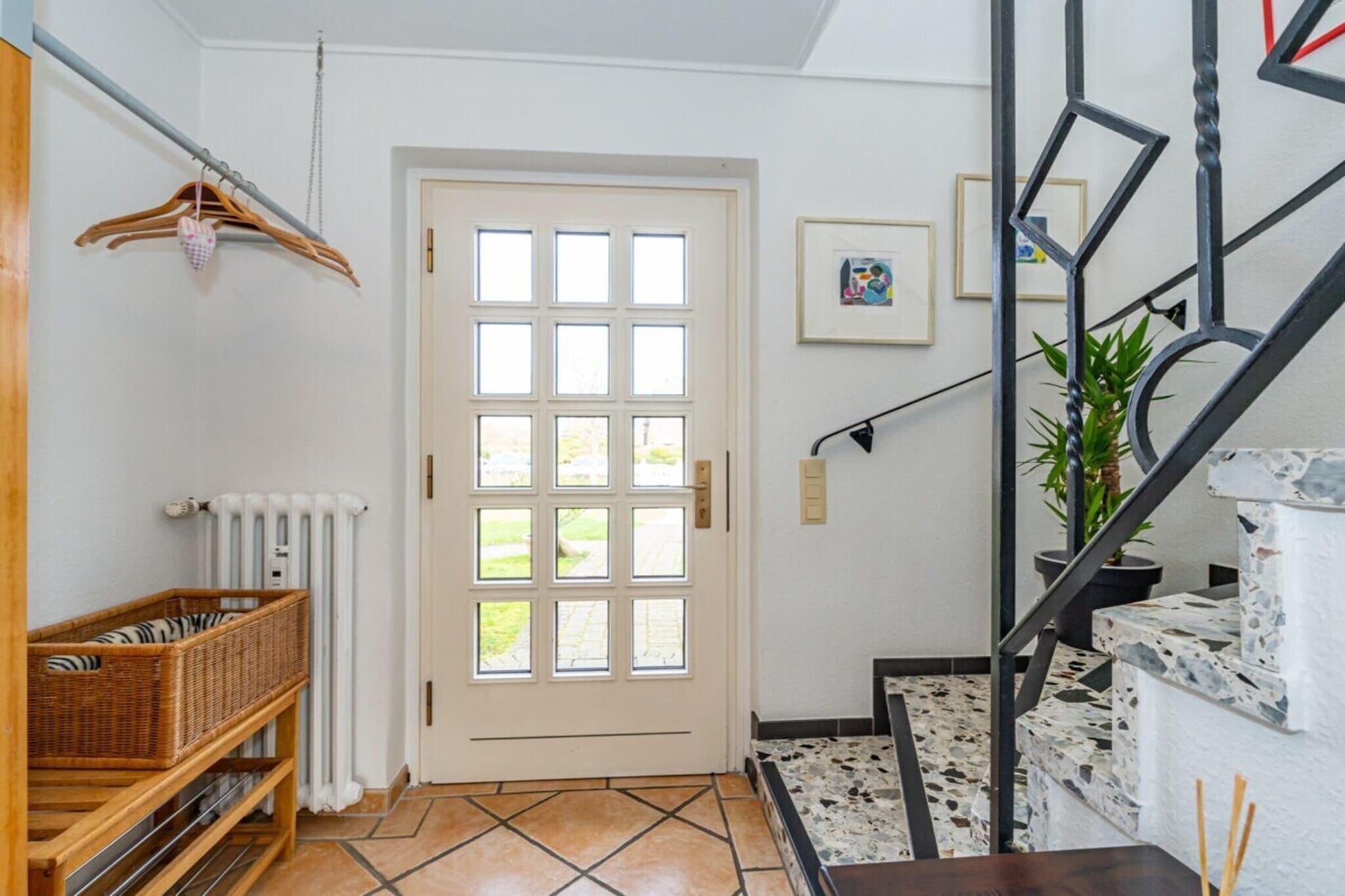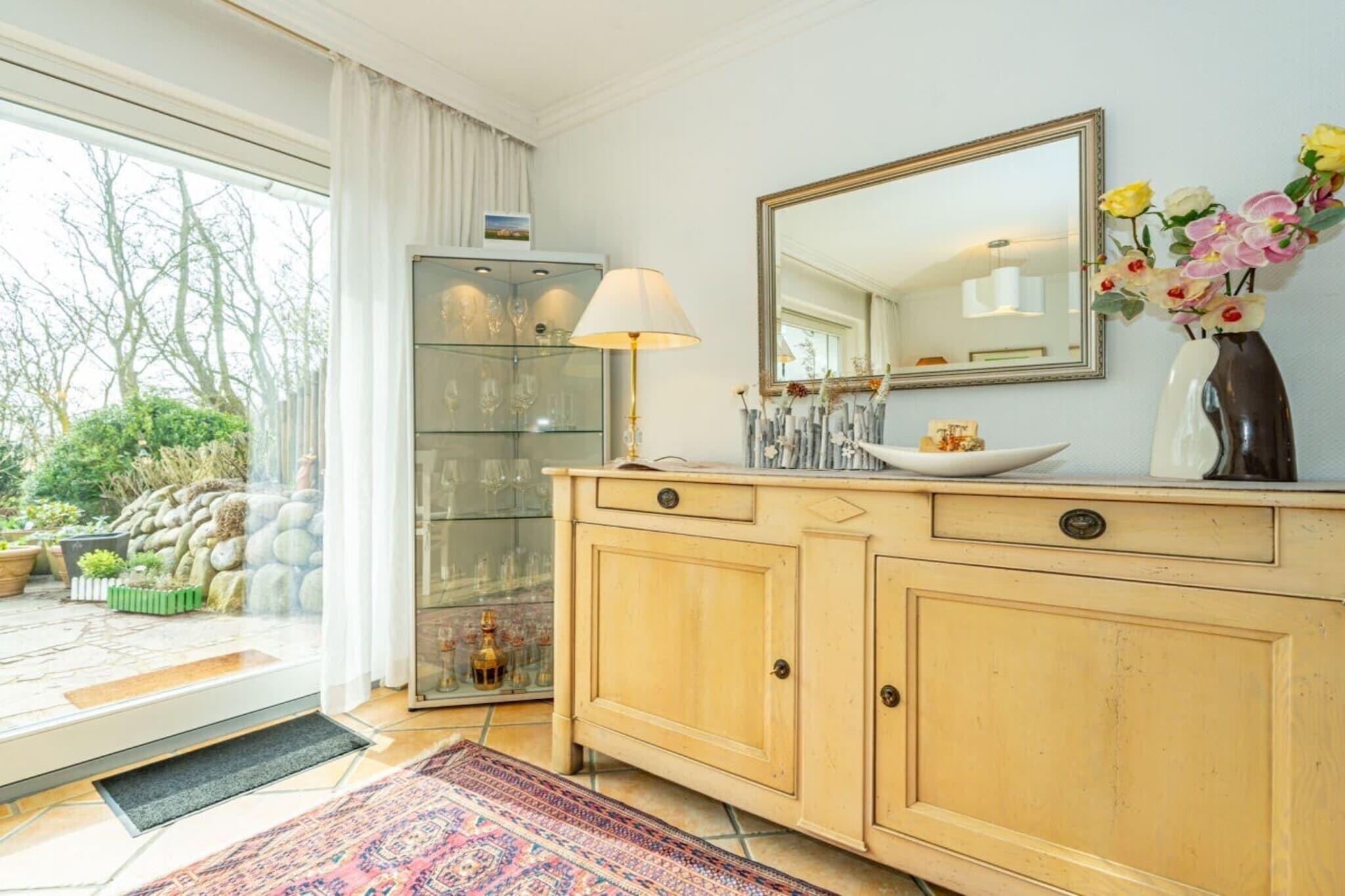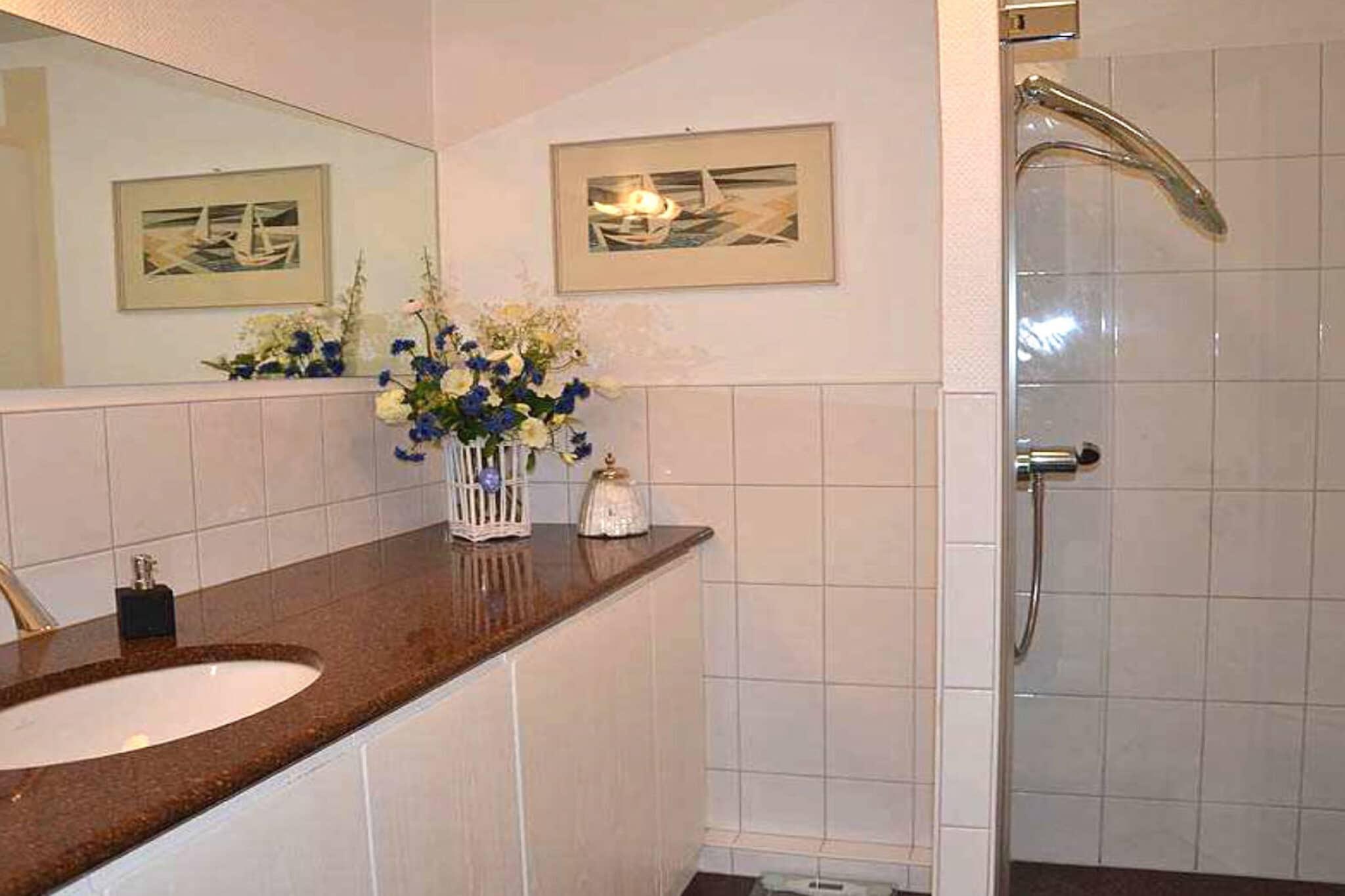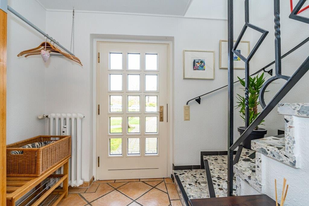 Das Ferienhaus hat im EG ein Wohnzimmer, eine abgetrennte Küche, ein Gäste-WC und eine Abstellkammer. Vom Wohnzimmer gelangt man auf die Südterrasse, die ausgestattet ist mit Gartenmöbeln und einem Strandkorb. Im 1.OG sind zwei große Schlafzimmer und ein Bad mit Dusche. im 2.OG ist ein weiteres großes Schlafzimmer mit einem Doppeltbett. Der Fußboden im EG ist mit großen Fliesen belegt, im 1. und 2. OG ist Parkettfußboden. Das Haus ist mit hellen, modernen Möbeln ausgestattet. Kabelanschluß (Fernsehen), WLAN, Telefon, Internet. Im Souterrain befindet sich eine Sauna mit Dusche.