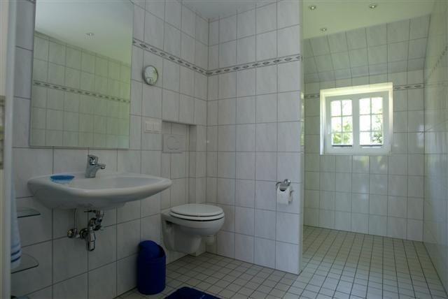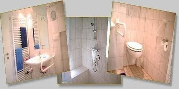 Der Zugang zur Ferienwohnung ist ebenerdig, die allgemeine Türbreite beträgt 92 cm(Haustür 107 cm) Die Dusche im Bad ist befahrbar, ein Duschsitz (Höhe 53 cm ) ist vorhanden. Ein mobiler Haltegriff zur variablen Verwendung wird zur Verfügung gestellt. Der Freiraum am WC ( Höhe 52 cm ) beträgt links 40 cm, rechts 20cm, und von vorn 150 cm, auch hier sind Haltegriffe installiert (siehe Foto unten rechts) Das Waschbecken ist unterfahrbar und der Spiegel darüber auch in Sitzposition einsehbar. Der seitliche Freiraum am Doppelbett ( Höhe 55 cm ) beträgt 125 cm. Zusätzlich zum normalen Schrank ist ein zweiter Kleiderschrank vorhanden, der in Sitzposition erreichbar ist. Die Küchenzeile- und Schränke sind ebenfalls sitzend erreichbar. Auf Wunsch kann ein Haltegriff über`m Bett angebracht werden. Der Parkplatz befindet sich ca. 20m von der Eingangstür.