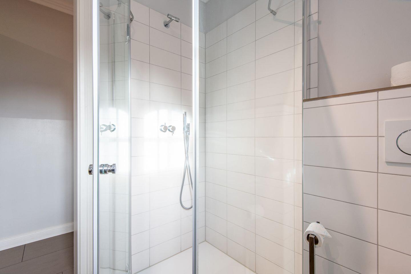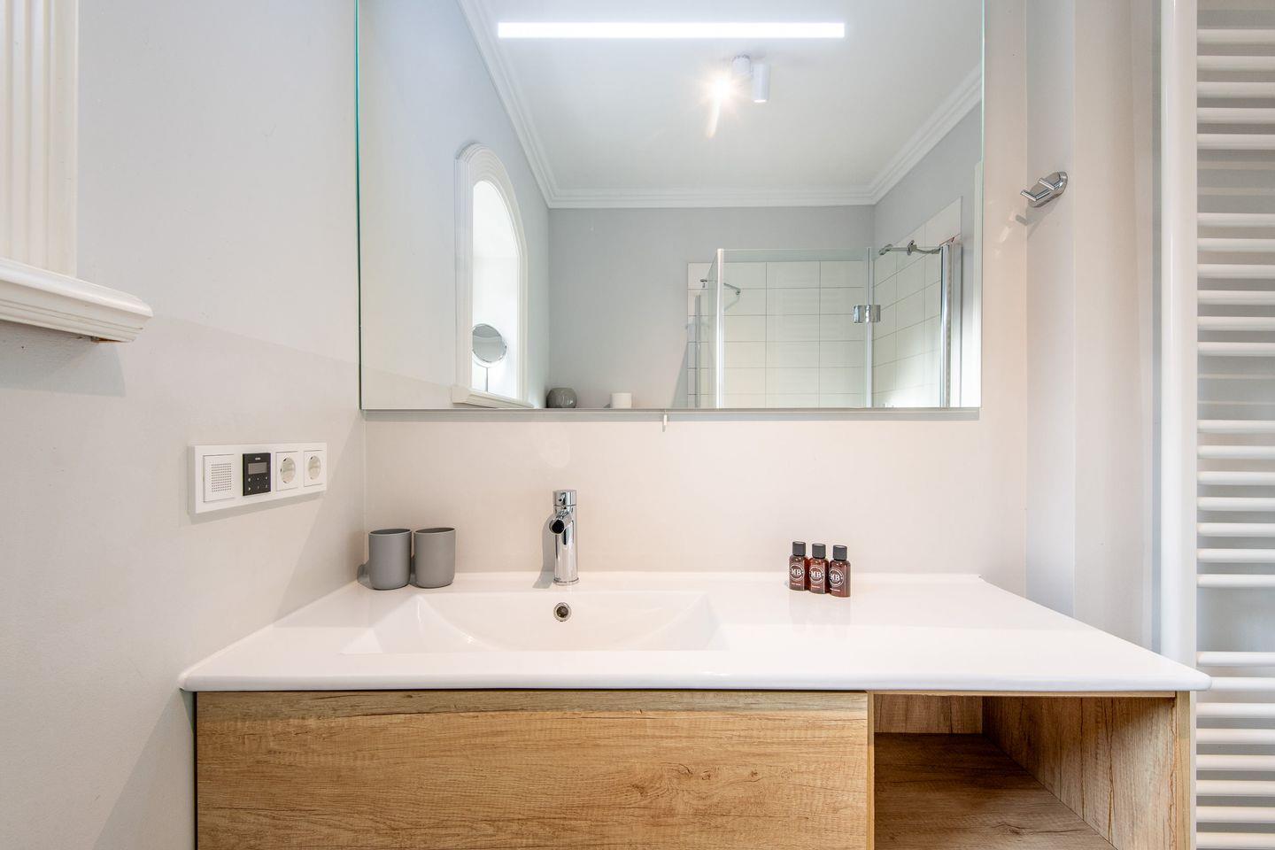 Das moderne Badezimmer verfügt über eine großzügige Dusche und edle Details, die Ihren Aufenthalt noch angenehmer machen. Es ist ein Ort der Erholung, um den Tag frisch und entspannt zu beginnen.