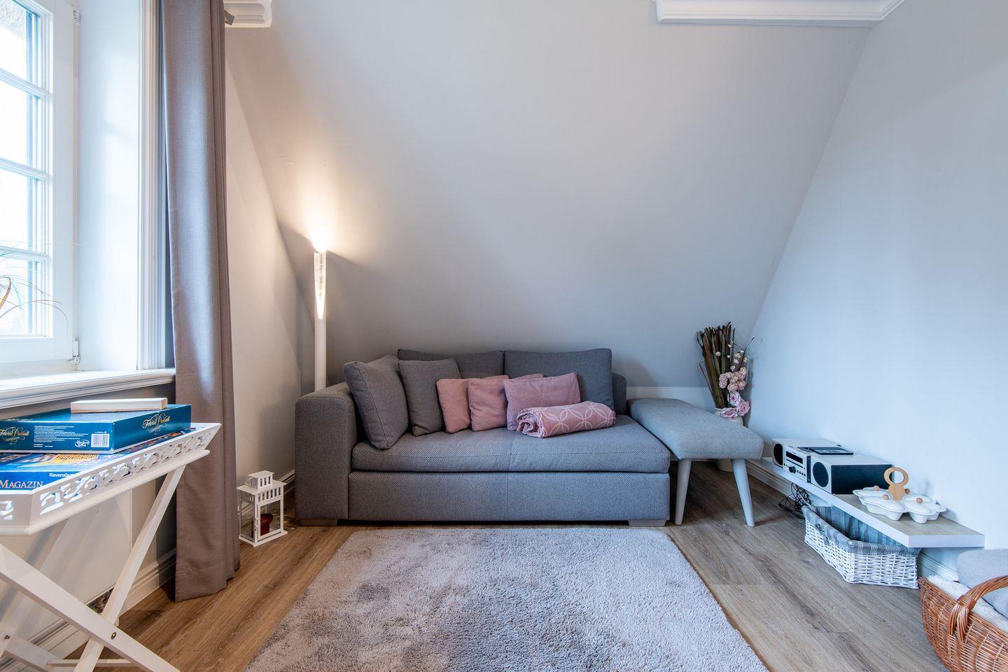 Der gemütliche Wohnbereich lädt mit seiner offenen Galerie und einer geschmackvollen Einrichtung zum Verweilen ein. Ob entspannte Lesestunden oder gemeinsame Abende bei einem Glas Wein – hier können Sie Ihren Urlaub in vollen Zügen genießen. Der integrierte Essbereich bietet Platz für zwei Personen und ist ideal für romantische Abende oder ein ausgiebiges Frühstück mit Blick auf die Sylter Natur.