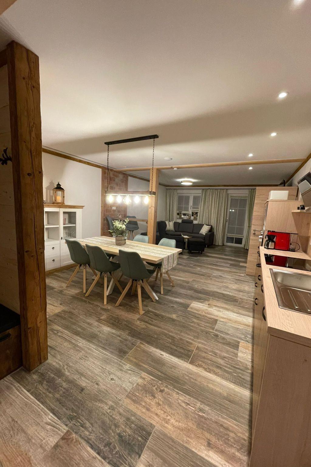 Hab Spaß in dieser stilvollen Unterkunft, ob als Familie, mit Freunden, oder auch nur zu zweit, wenn man große Räumlichkeiten und zwei Schlafräume bevorzugt. Die Wohnung nennt sich „Zirbe“, weil diese in den Schlafräumen mit Zirben Holz ausgestattet ist, die perfekte Basis für eine traumhafte Schlafumgebung. Eine eigene Infrarotsauna und eine Whirlpool Badewanne sorgen zusätzlich zu einem Wellnessurlaub und Stressabbau in den eigenen vier Wänden! Diese Wohnung haben wir mit viel Liebe und Holz in traditioneller Bayerischer moderner Stilart mit passenden Möbel, Geschirr und Accessoires ausgestattet. Der offene Wohnraum ist mit einem bequemen Ausziehsofa, Ohrensessel und Fußhocker, eine bequeme Leseecke beim Elektrokamin, ein 65Zoll Flachbildfernseher und eine Bar wo man auch mal mit dem Laptop arbeiten kann ausgestattet. Der gemütliche Essbereich ist mit einem großen Esstisch, 6 Stühlen und einer mit Geschirr und Gläser gefüllten Vitrine ausgestattet. Eine moderne mit Töpfen und Geräten voll ausgestattete Küchenzeile im Anschluss gehört selbstverständlich auch mit dazu. Beide Schlafzimmer haben Direktzugang zu den eigenen Bäder. Davon ist ein Bad mit einer Whirlpool Badewanne, Dusche, Waschtisch und WC ausgestattet. Das andere Bad mit einer großen begehbaren Dusche, Waschtisch und WC. Jeweils zur Ausstattung gehört ein Hand Fön, Handtücher, Badehandtücher und im Kleinformat Hygieneartikel für den Erstgebrauch. In einem Schlafzimmer ist ein motorisch verstellbares Doppel-Boxspringbett und ein Schreiner gefertigtes Hochbett im Maß von 80x190cm. Im zweiten Schlafzimmer sind zwei Einzel Boxspringbetten, ein zusätzlicher 55 Zoll Flachbildfernseher, und bietet Platz für ein KK-Bett. In dieser Wohnung ist alles vorhanden, Sie brauchen nur Ihre persönlichen Sachen, sonst nichts. - Brötchenservice - Check in ab 14.00Uhr - Check out bis 10.00 Uhr - Schlüsselübergabe vor Ort Bis 2 Hunde je Wohneinheit sind Herzlich Willkommen!